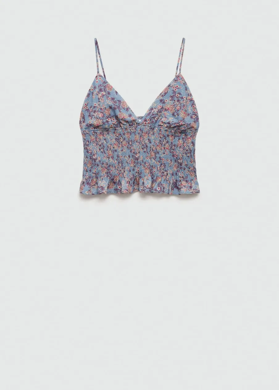 Total look. Kwiatowy wzór. Model prosty. Deseń crop. Dekolt V. Ozdobne marszczenie. Cienkie ramiączka.
