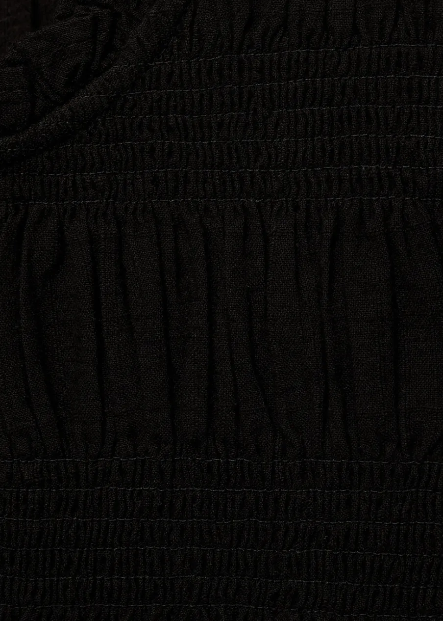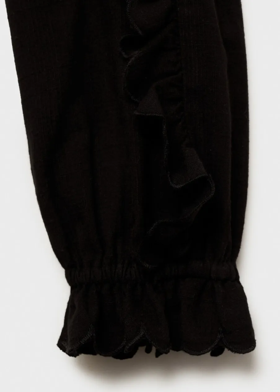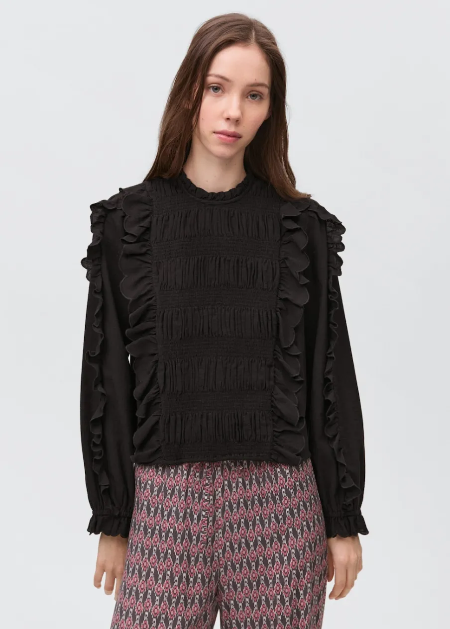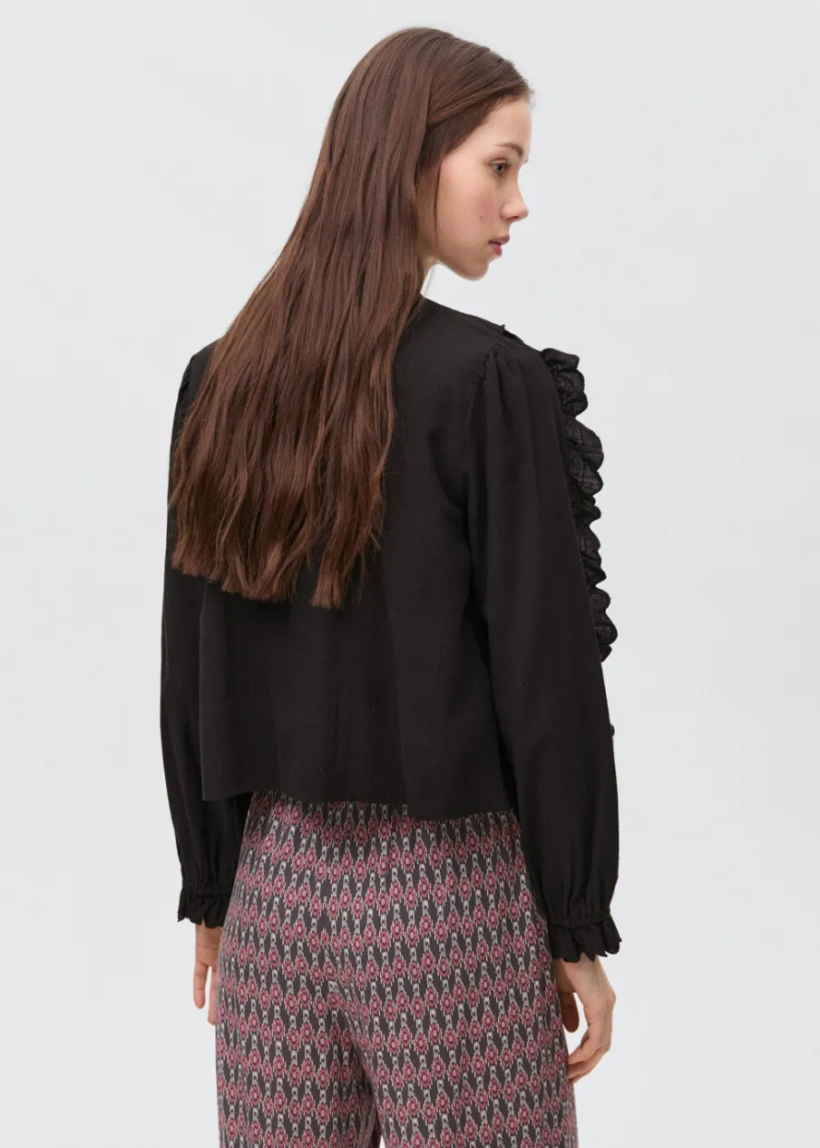 Bawełna 100%. Wysoki kołnierz otulający szyję. Długi rękaw. Falbanki na mankietach. Ozdobne marszczenie. Zapięcie na guzik pod szyją. Falbanki na ramionach.