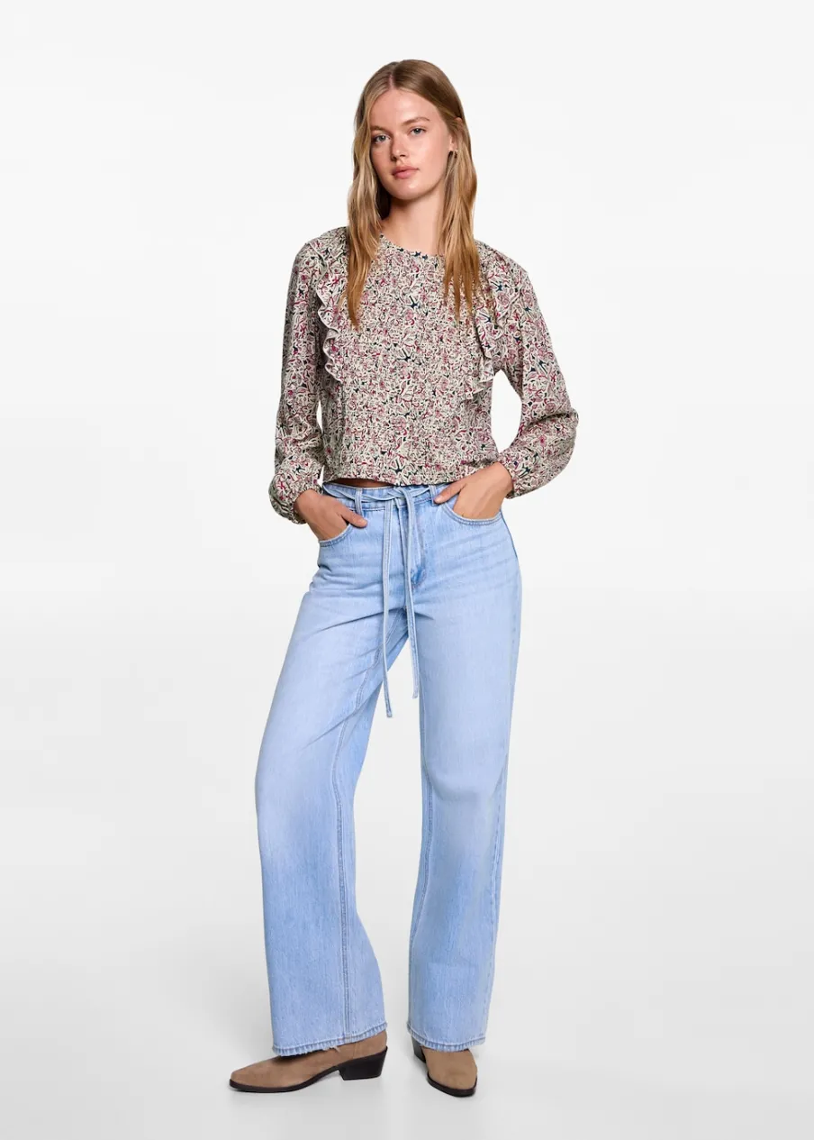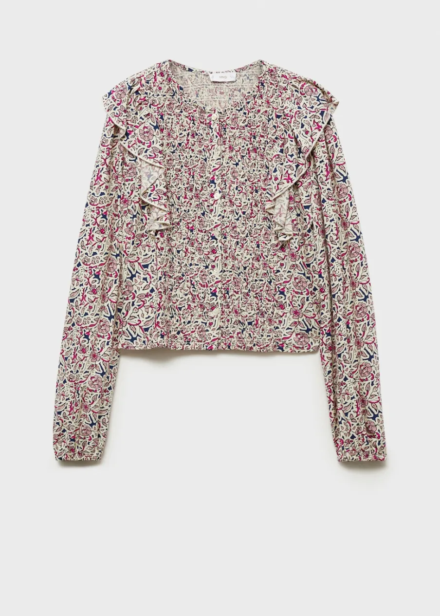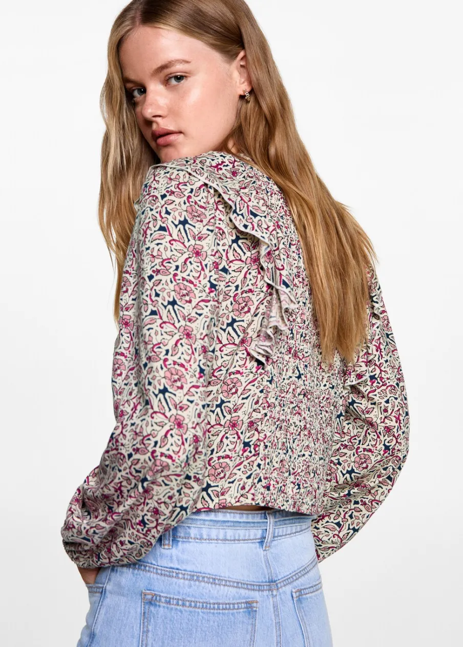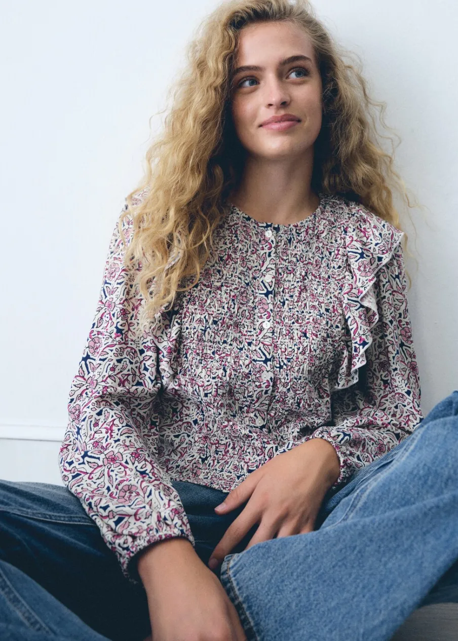 Model prosty. Kwiatowy wzór. Okrągły dekolt. Długi bufiasty rękaw. Zapięcie na guziki. Modelka ma 172 cm wzrostu i nosi rozmiar M. Ozdobne marszczenie. Z falbanami. Tkanina z wiskozy.