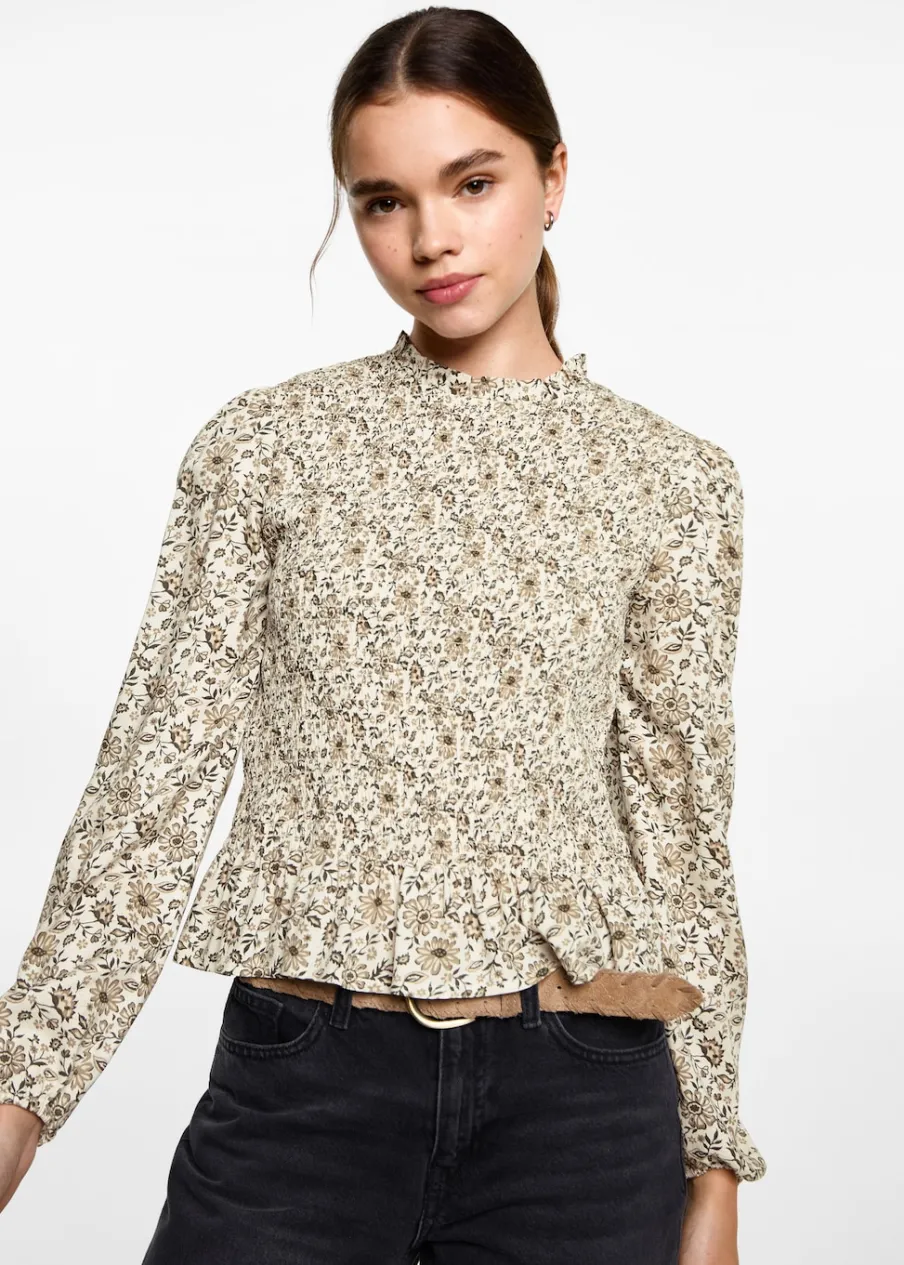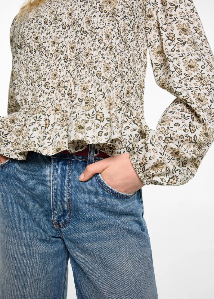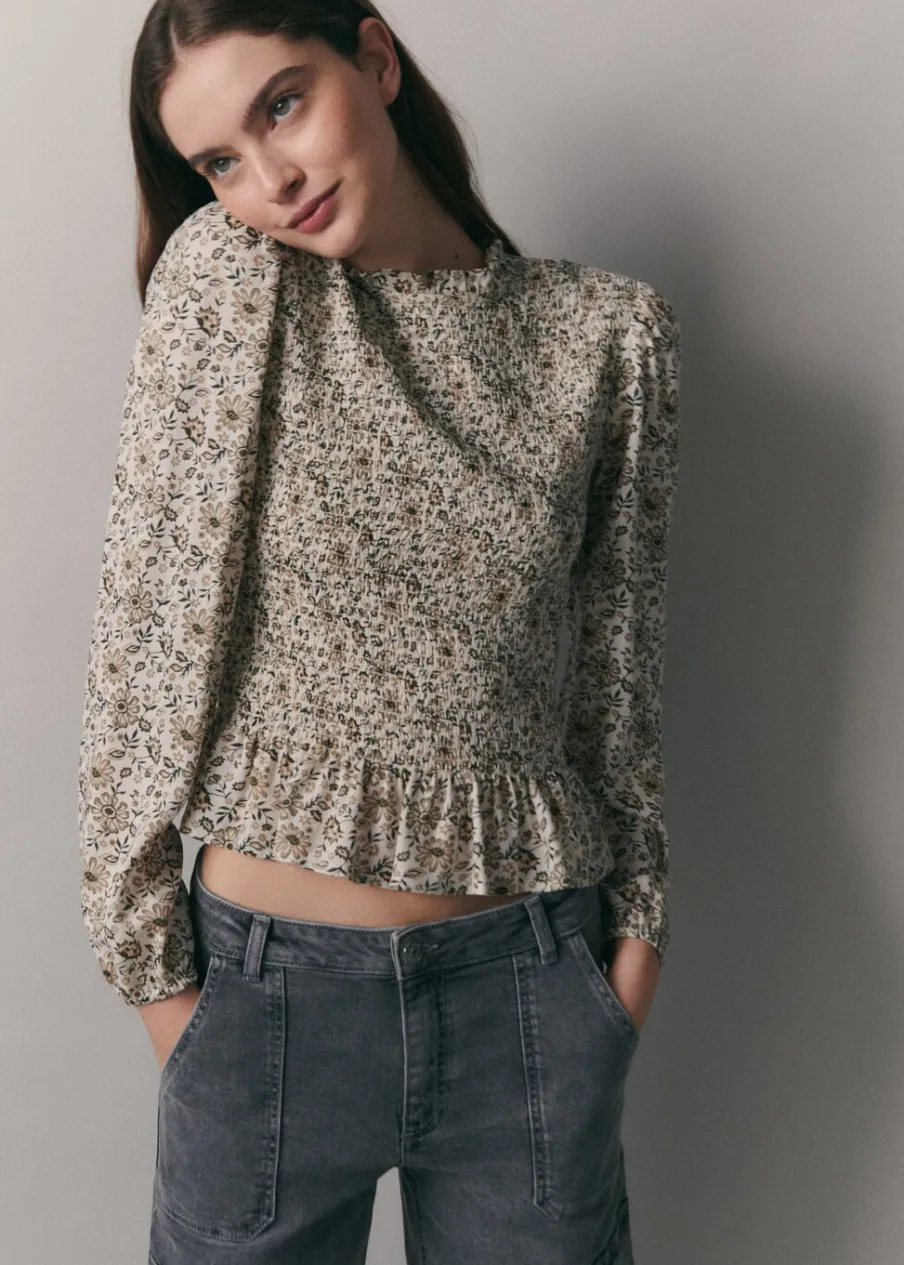 Model prosty. Kwiatowy wzór. Marszczony detal. Okrągły dekolt. Długi rękaw. Zapięcie na guzik z tyłu. Modelka ma 172 cm wzrostu i nosi rozmiar M.