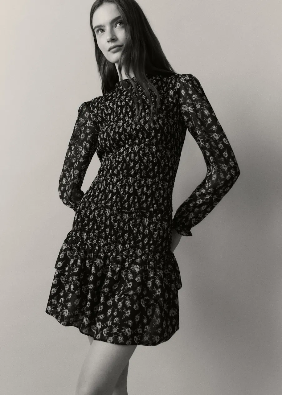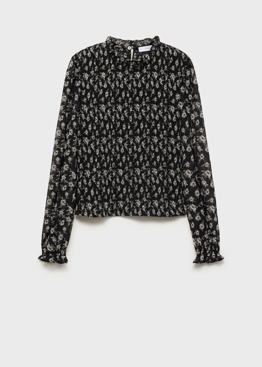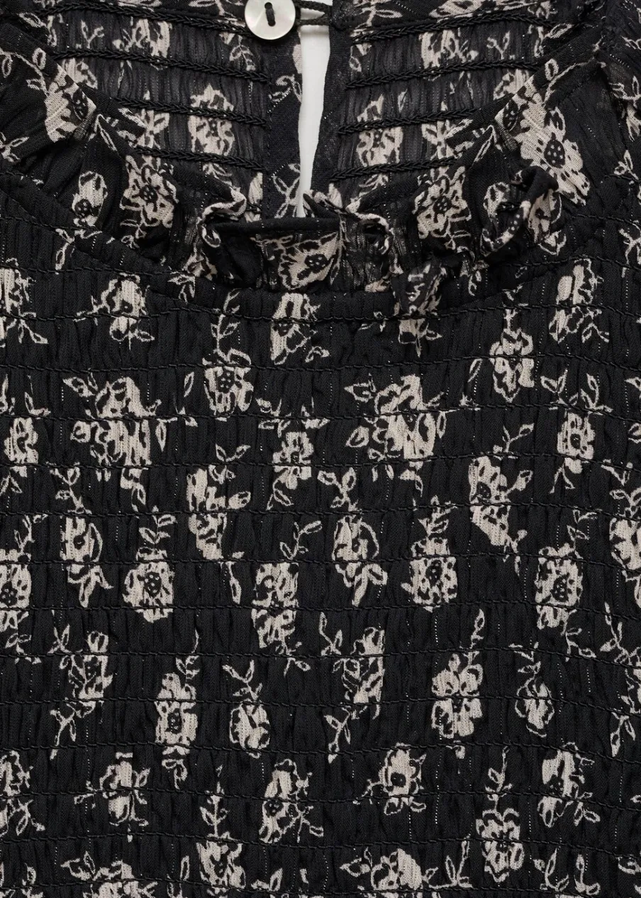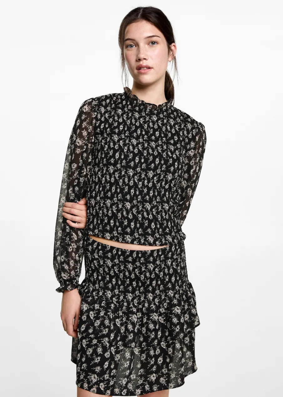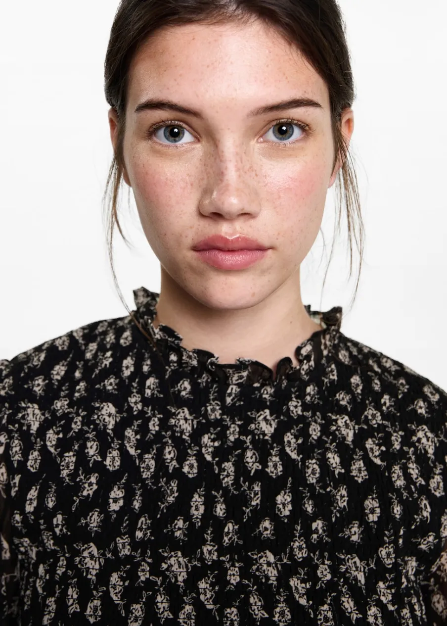 Dostępny zestaw total look. Model prosty. Kwiatowy wzór. Marszczony detal. Okrągły dekolt. Długi rękaw. Zapięcie na guzik z tyłu.
