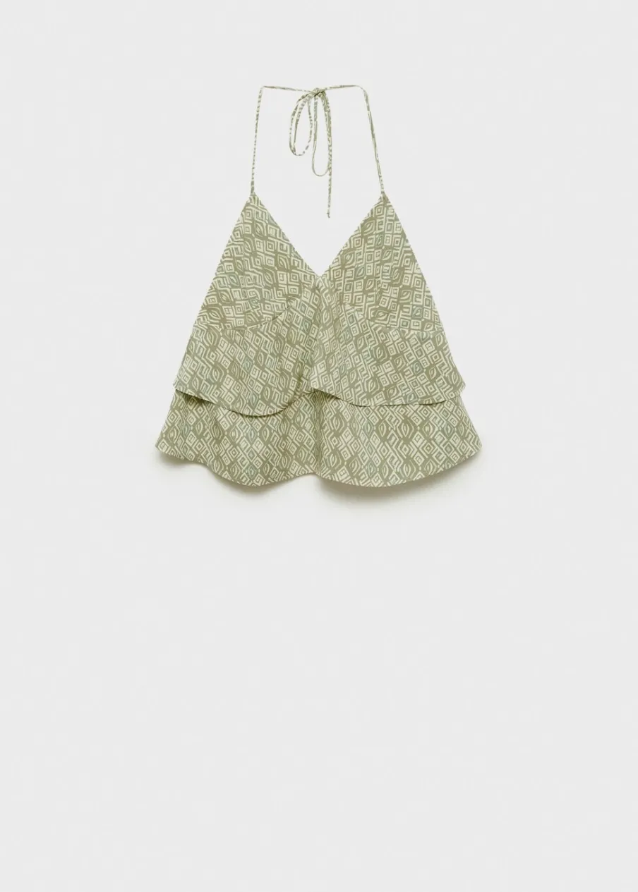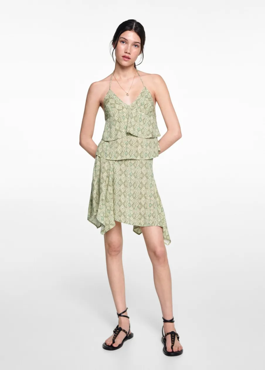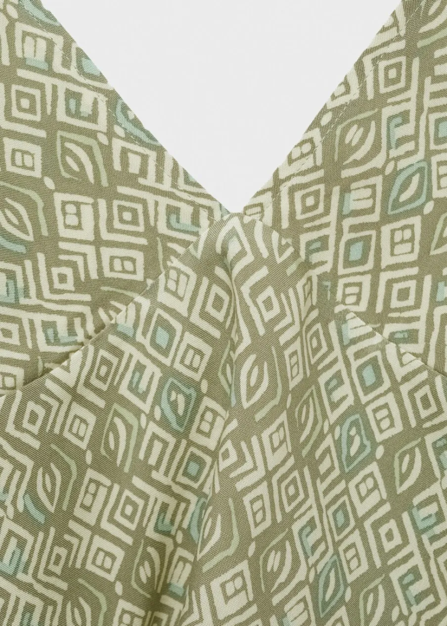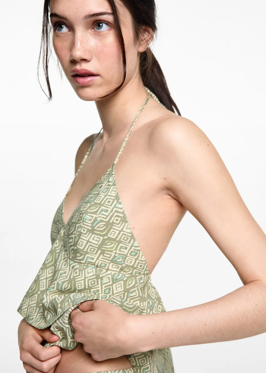 Dostępny zestaw total look. Lejąca tkanina. Cienkie ramiączka wiązane na kokardki. Plecy z wycięciem. Model ma 175 cm wzrostu i nosi rozmiar M. Nadruk. Tkanina z wiskozy.