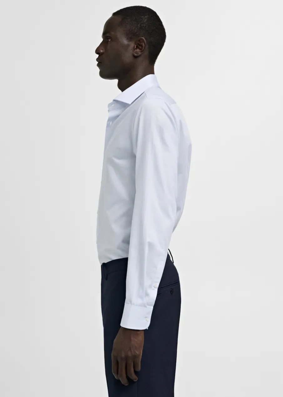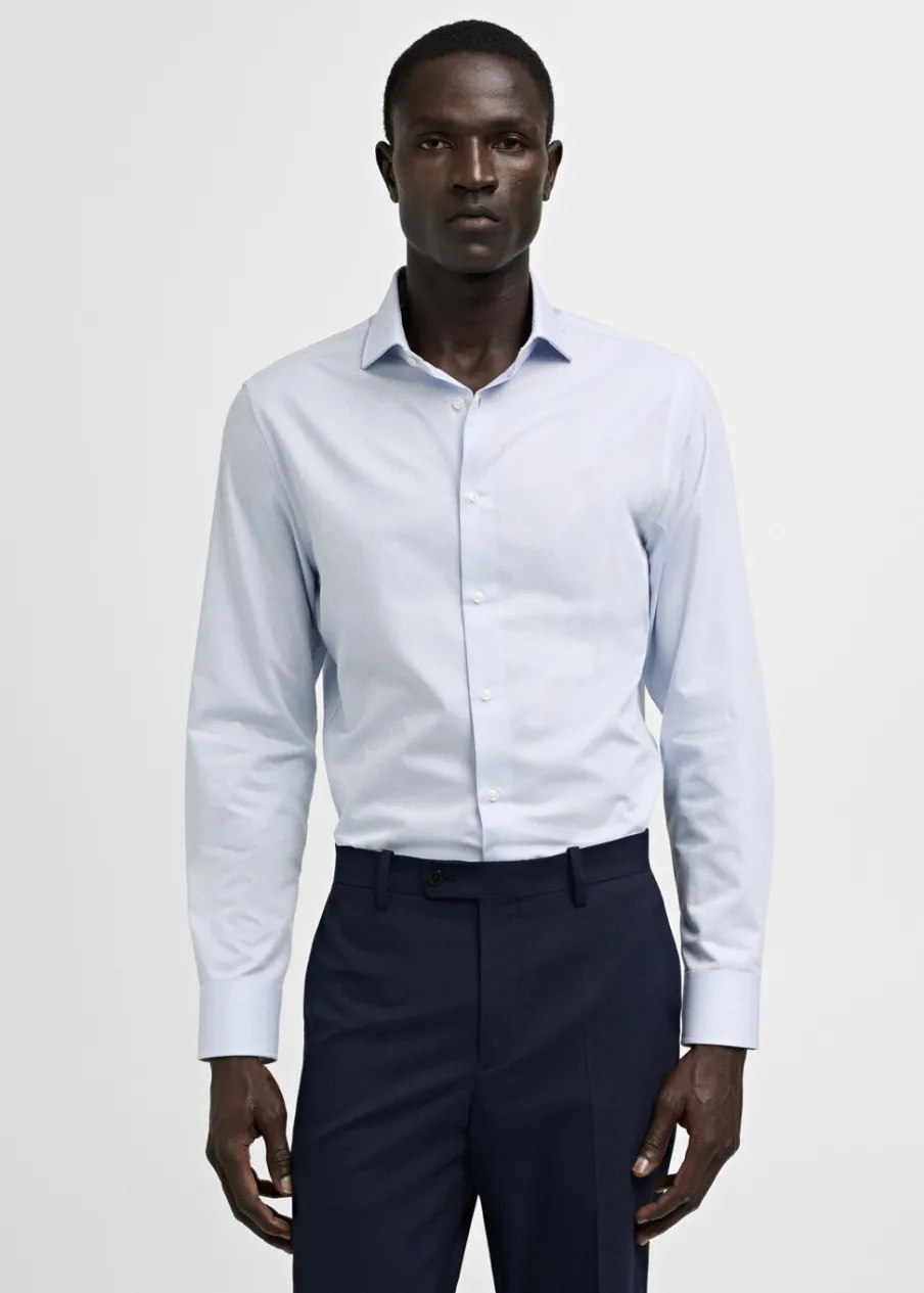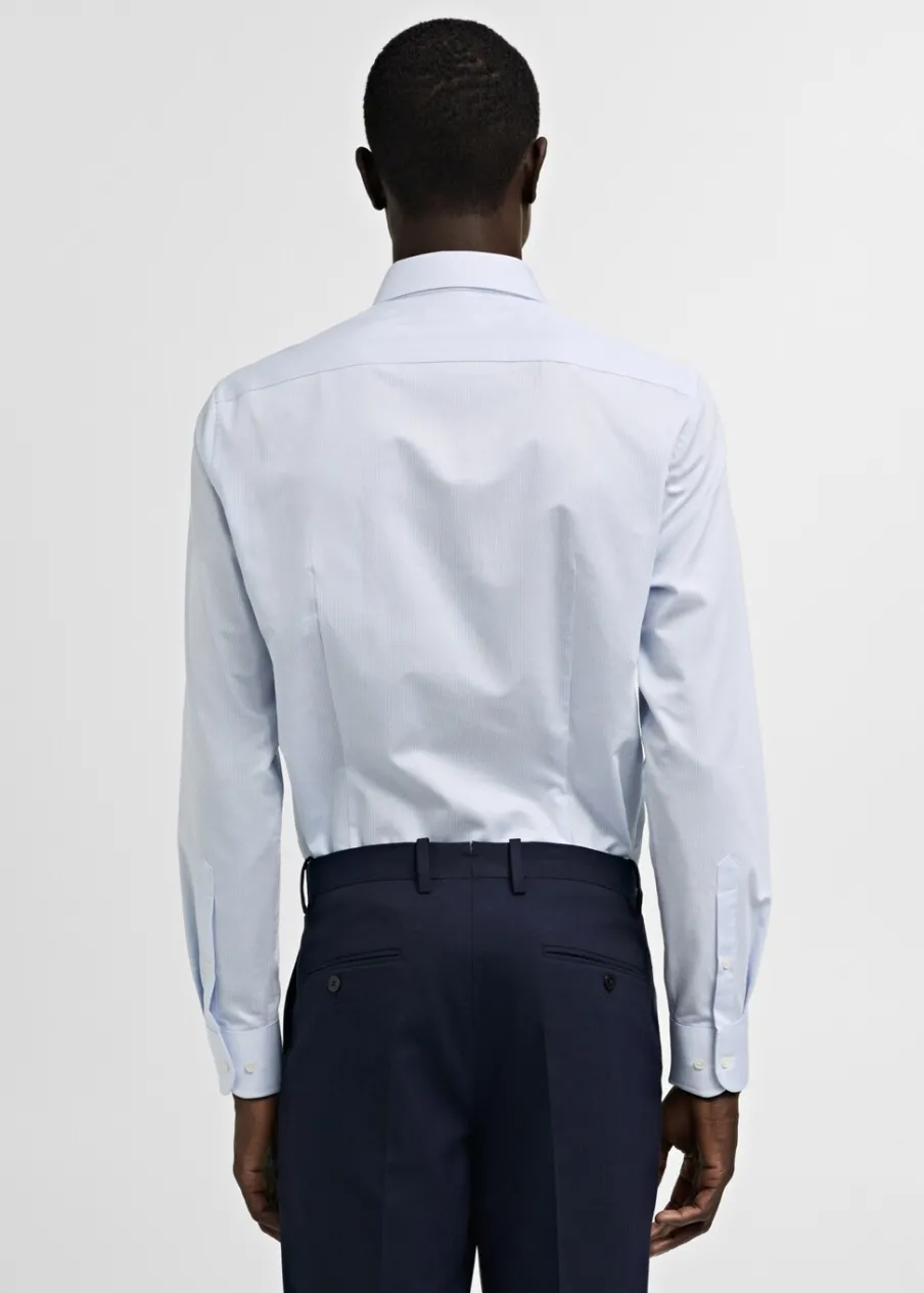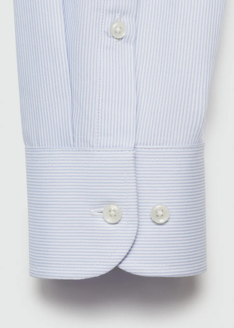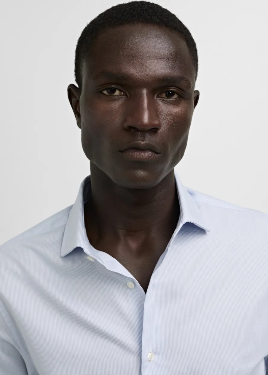 Bawełna 100%. Diagonal. Slim-fit. Wzór w drobne paseczki. Kołnierzyk włoski. Zapięcie z przodu na guziki. Model ma 185 cm wzrostu i nosi rozmiar M. Długi rękaw z zapięciem na guziki. Zaokrąglony dół.