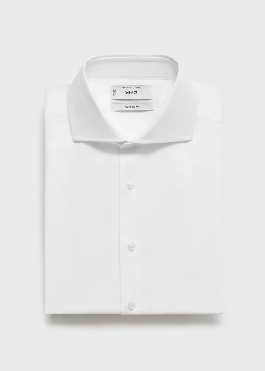 Slim-fit. Tkanina z 100% bawełny. Kołnierzyk cutaway. Zapięcie na guziki. Zaokrąglony dół. Zapinane mankiety. Model ma 185 cm wzrostu i nosi rozmiar M.