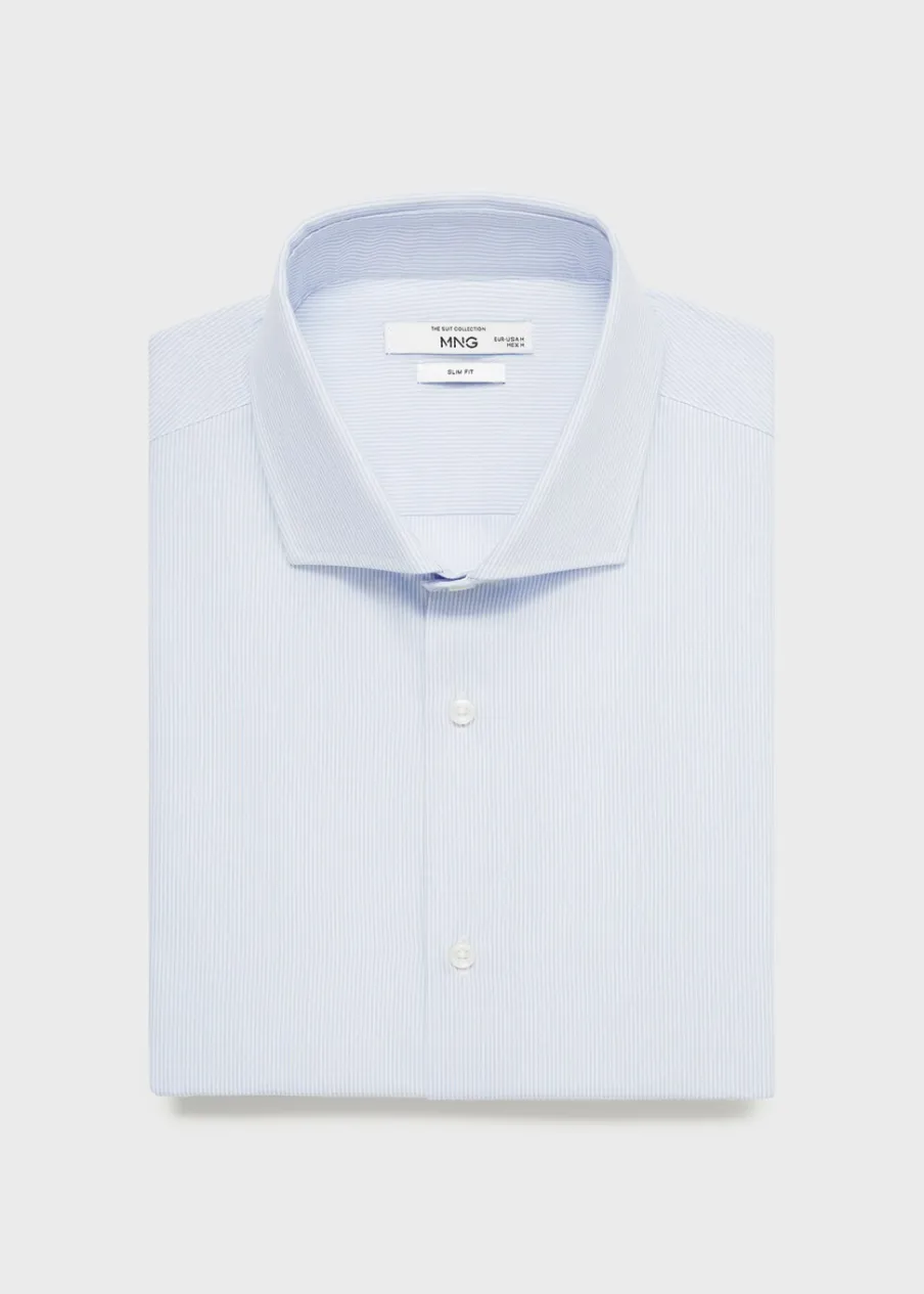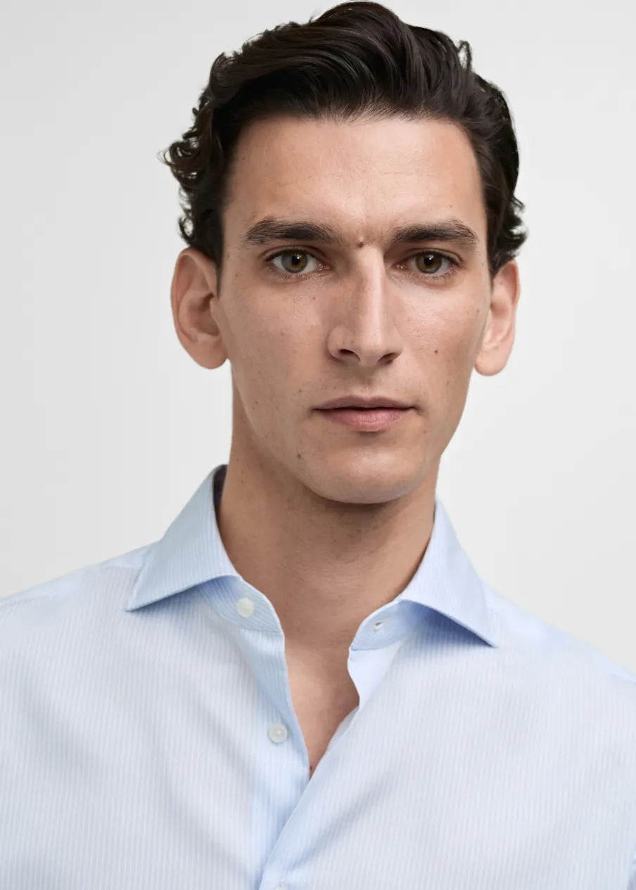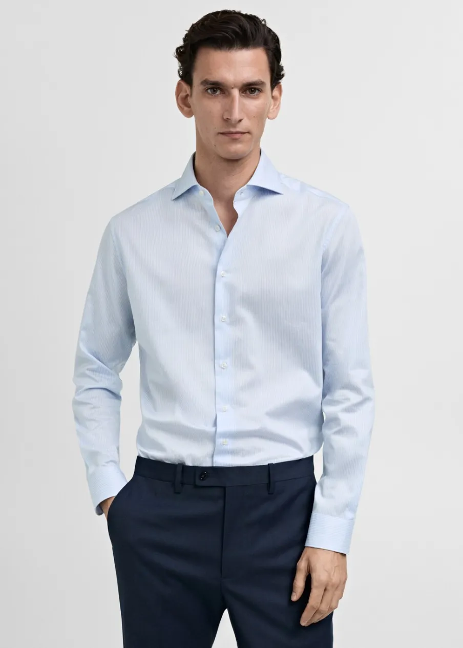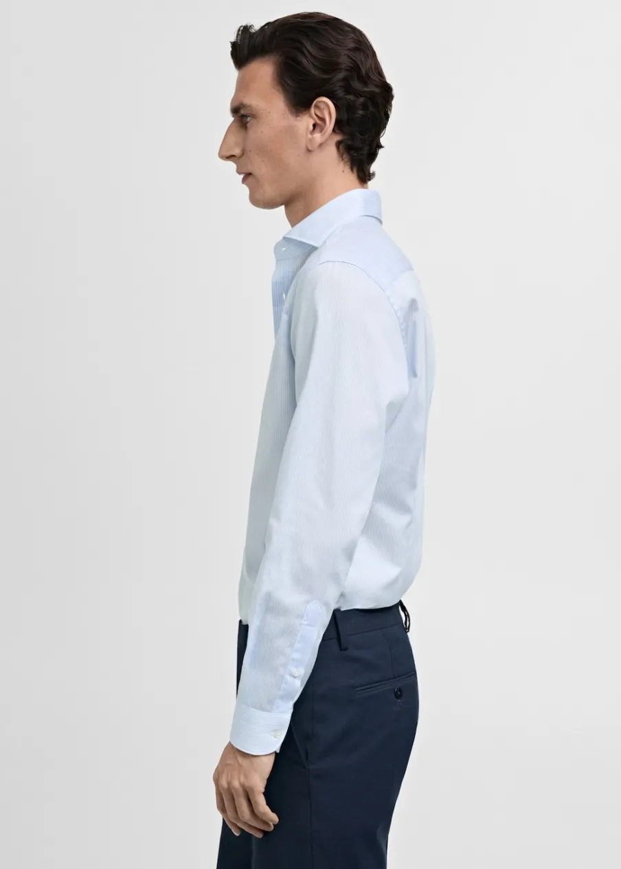 Tkanina z 100% bawełny. Kołnierzyk włoski. Wzór w drobne paseczki. Zapięcie na guziki z przodu. Długi rękaw z guzikami na mankietach. Zaokrąglony dół. Model ma 190 cm wzrostu i nosi rozmiar M.