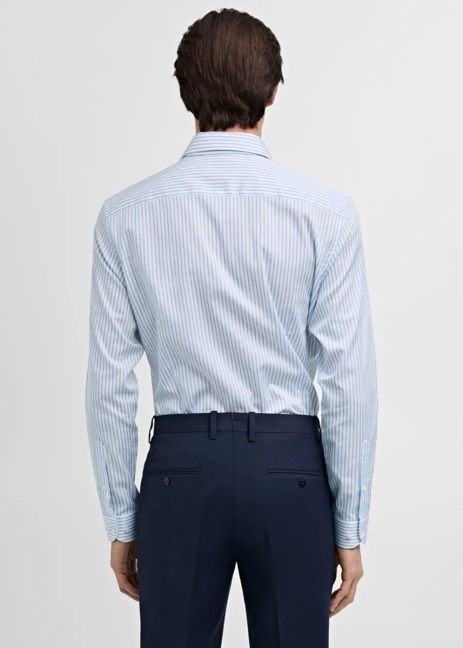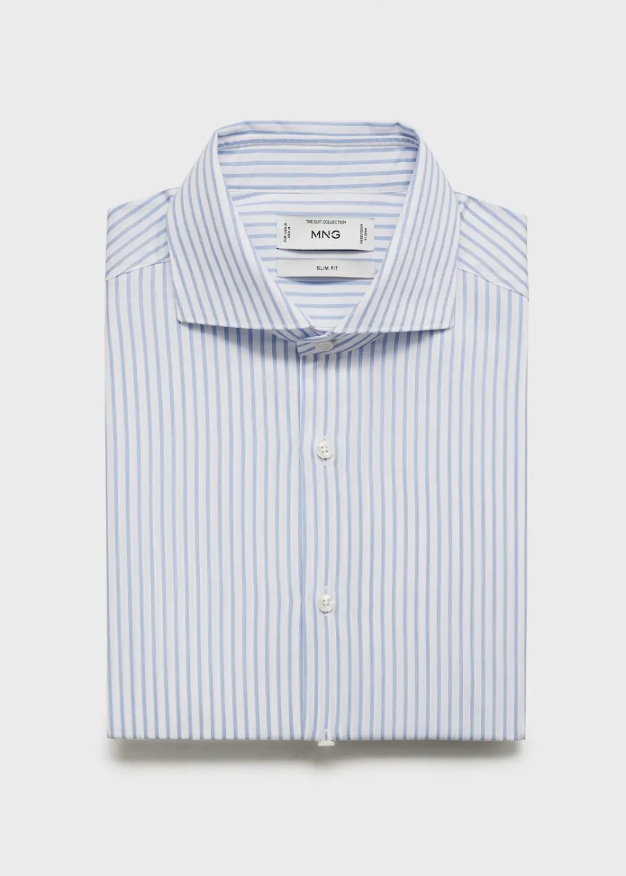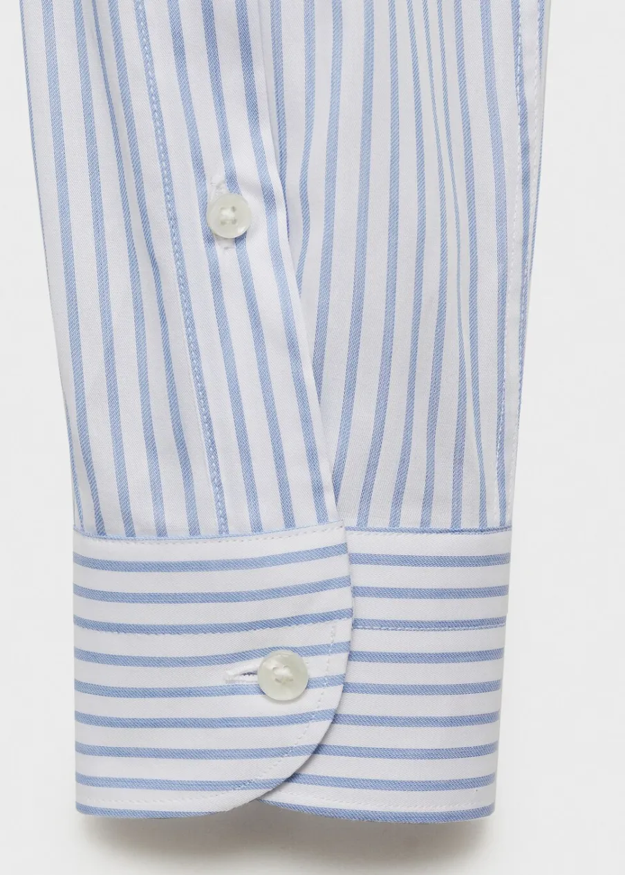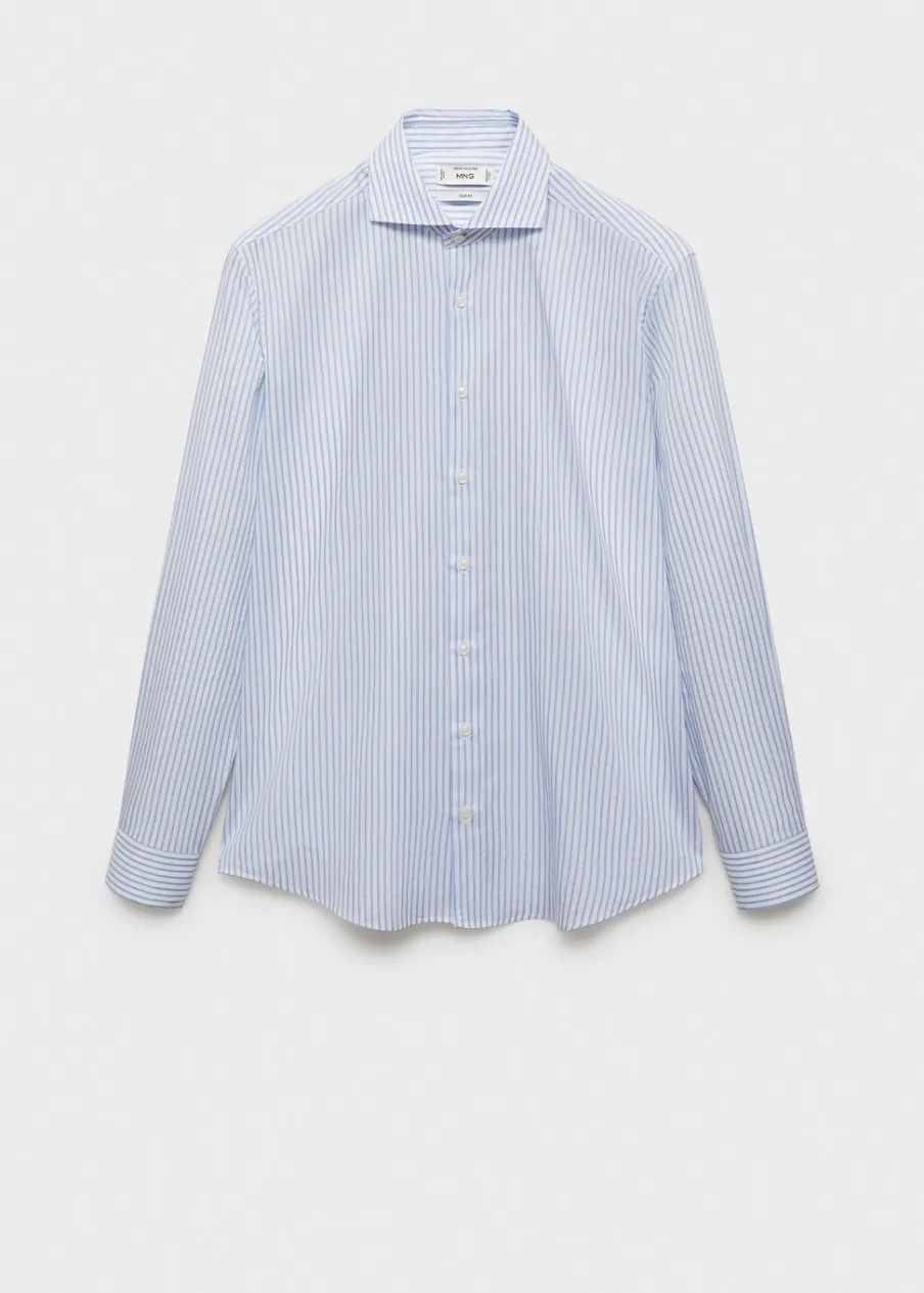 Slim-fit. Tkanina z 100% bawełny. Nadruk: paski. Kołnierzyk włoski. Długi, zapinany rękaw. Zaokrąglony dół. Model ma 190 cm wzrostu i nosi rozmiar M.