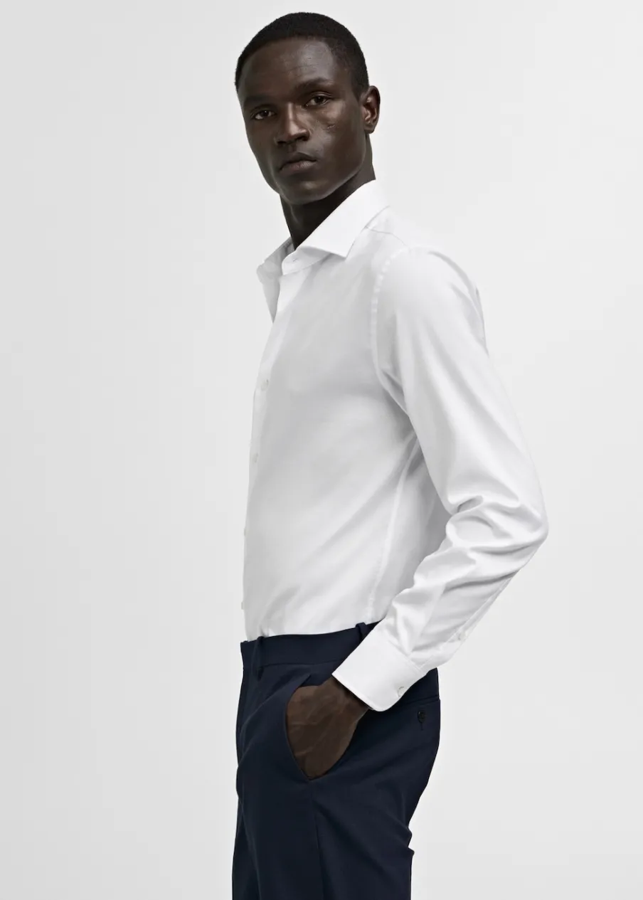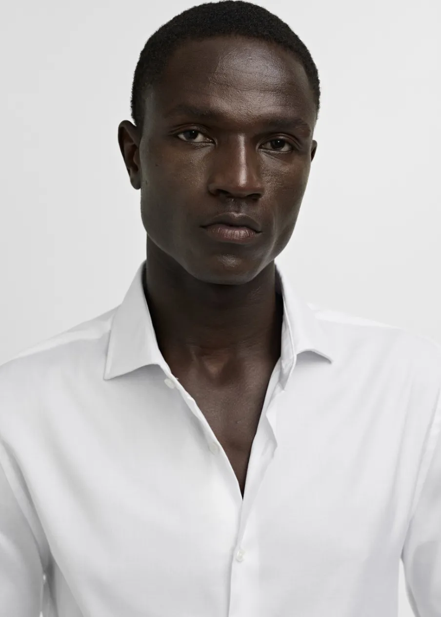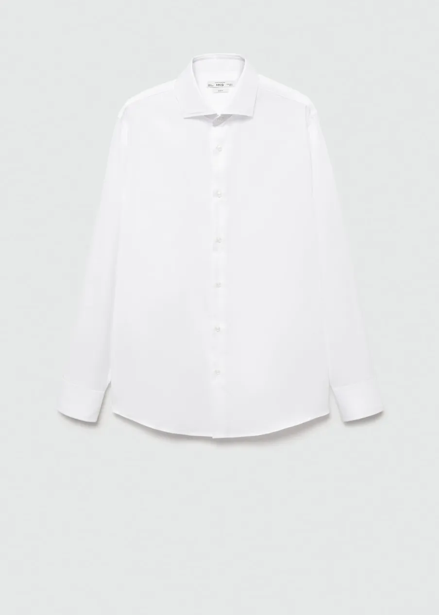 Slim-fit. Bawełniana, strukturalna tkanina. Kołnierzyk włoski. Długi rękaw z guzikami na mankietach. Model ma 187 cm wzrostu i nosi rozmiar M. Zapięcie na guziki z przodu. Zaokrąglony dół. Klasyczny kołnierzyk. Tkanina z 100% bawełny.