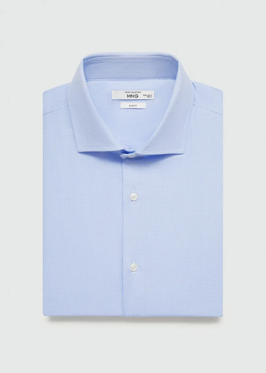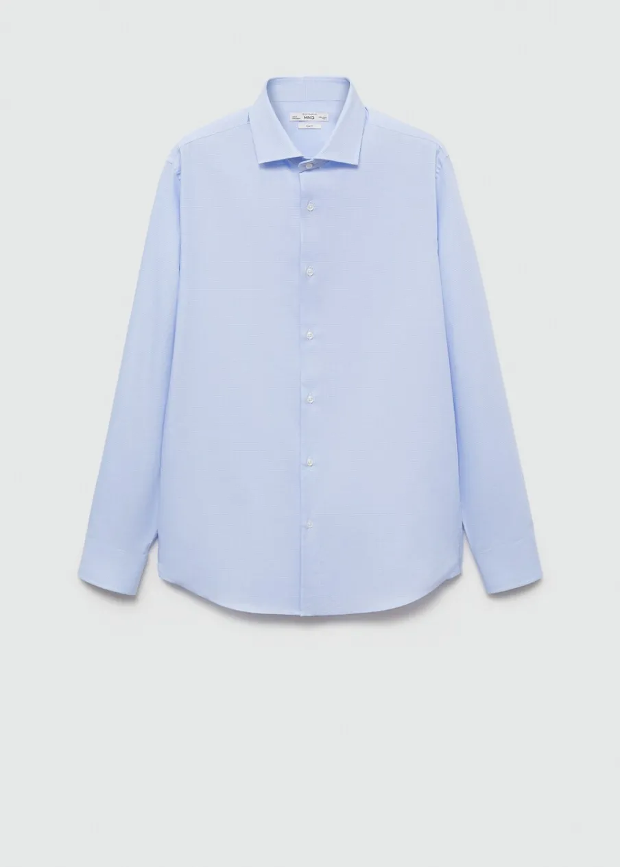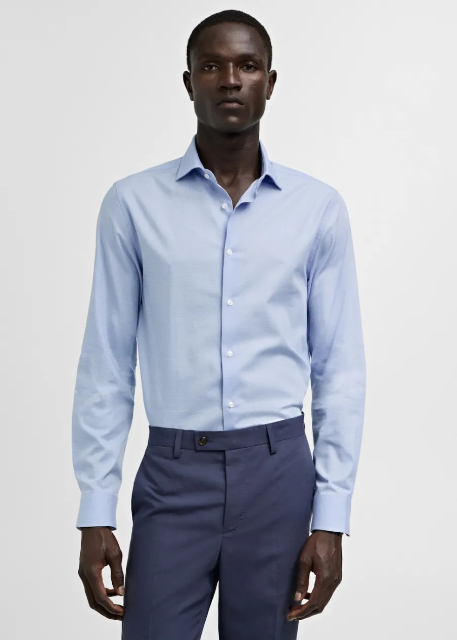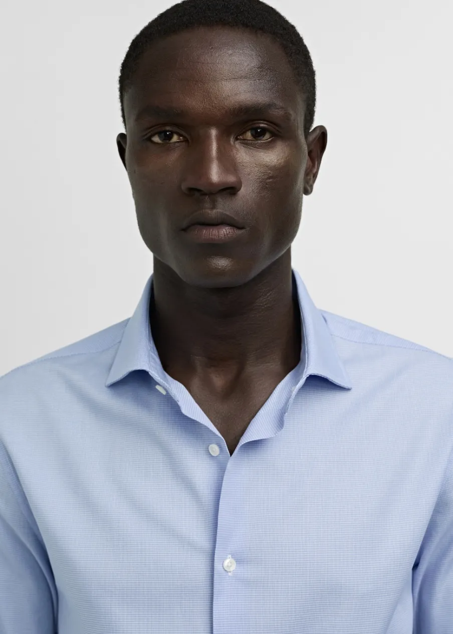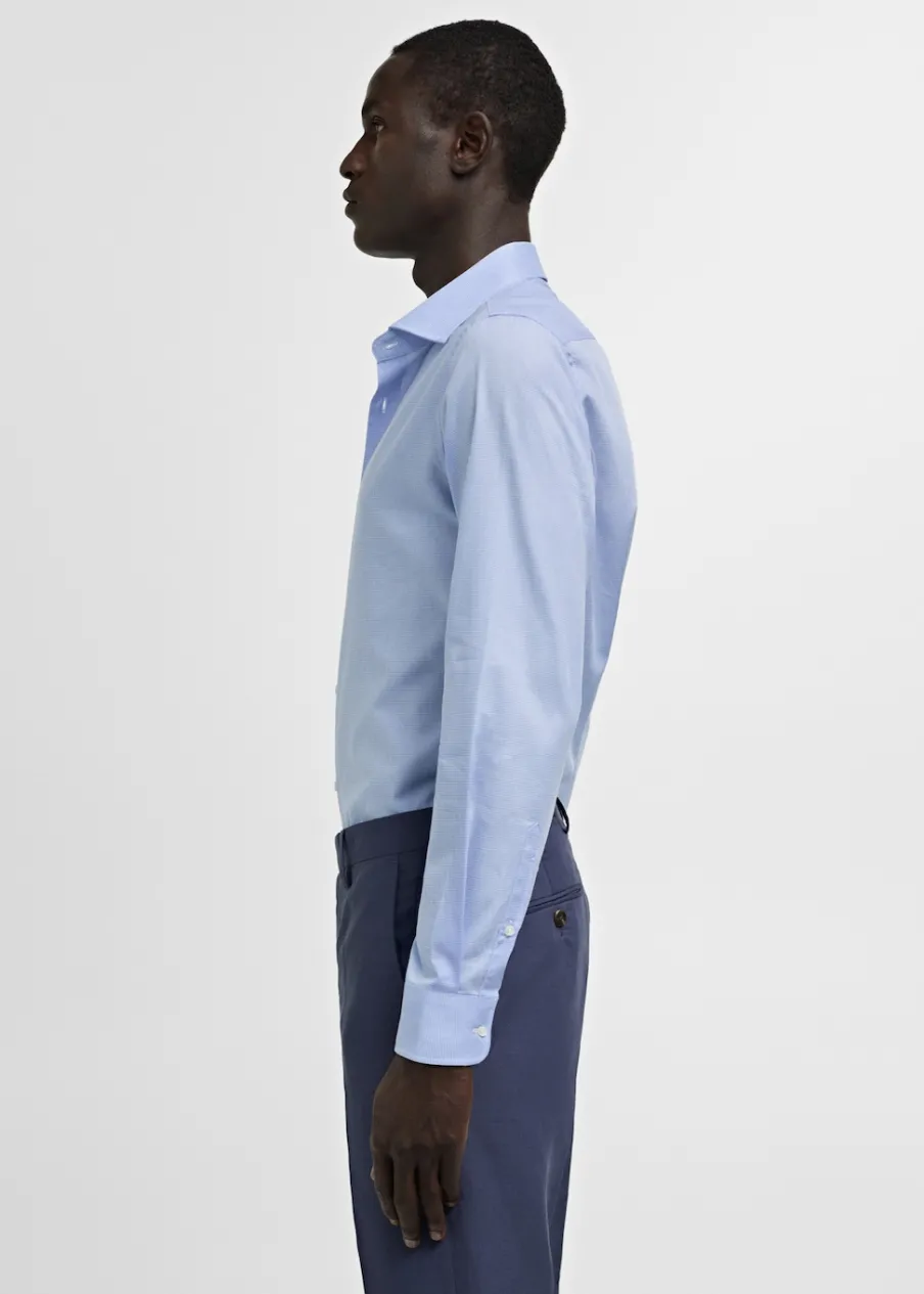 Slim-fit. Bawełna 100%. Tekstura bawełniany diagonal. Wzór w drobne paski. Kołnierzyk włoski. Model ma 187 cm wzrostu i nosi rozmiar M. Zaokrąglony dół. Zapięcie na guziki z przodu. Długi rękaw z zapięciem na guziki.