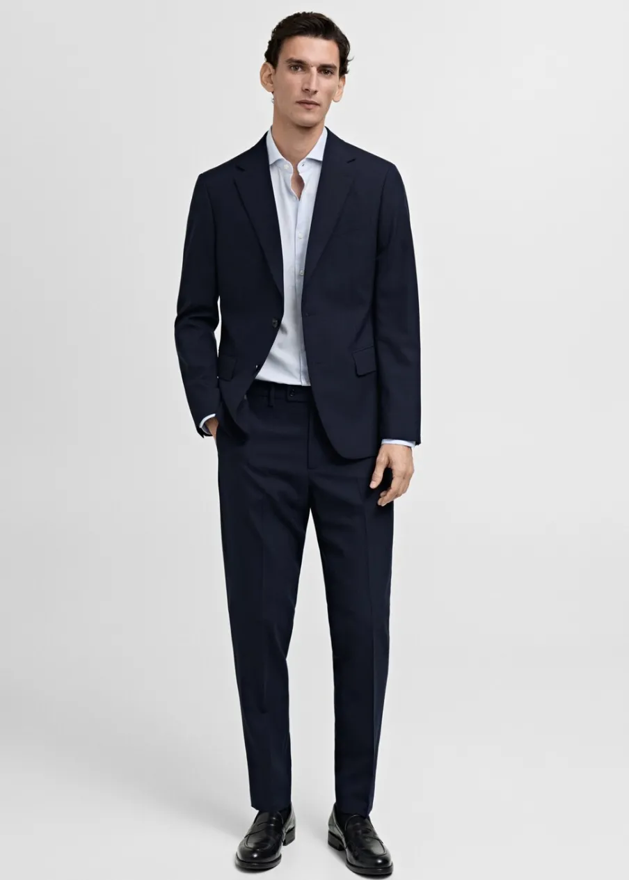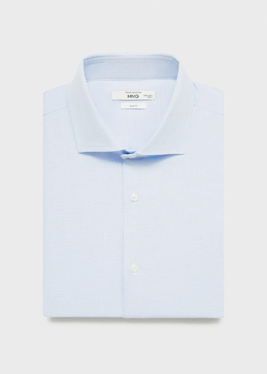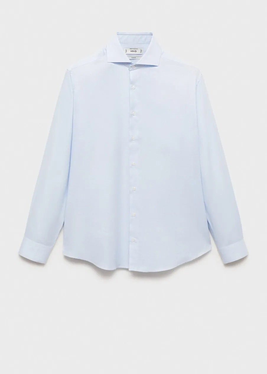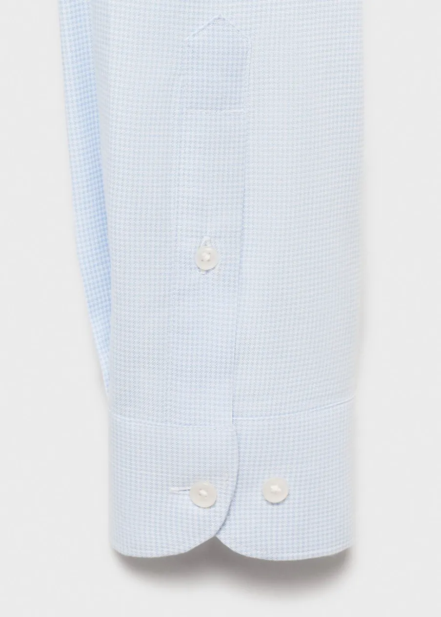 Slim-fit. Tkanina z 100% bawełny. Tekstura bawełniany diagonal. Wzór w drobną kurzą stopkę. Kołnierzyk włoski. Zapięcie na guziki z przodu. Długi rękaw z guzikami na mankietach. Zaokrąglony dół. Model ma 190 cm wzrostu i nosi rozmiar M.
