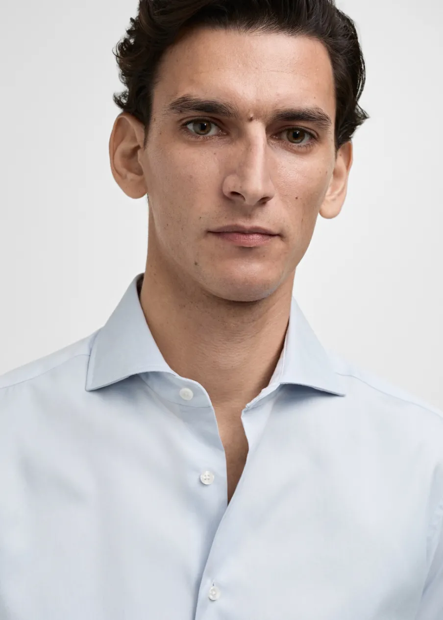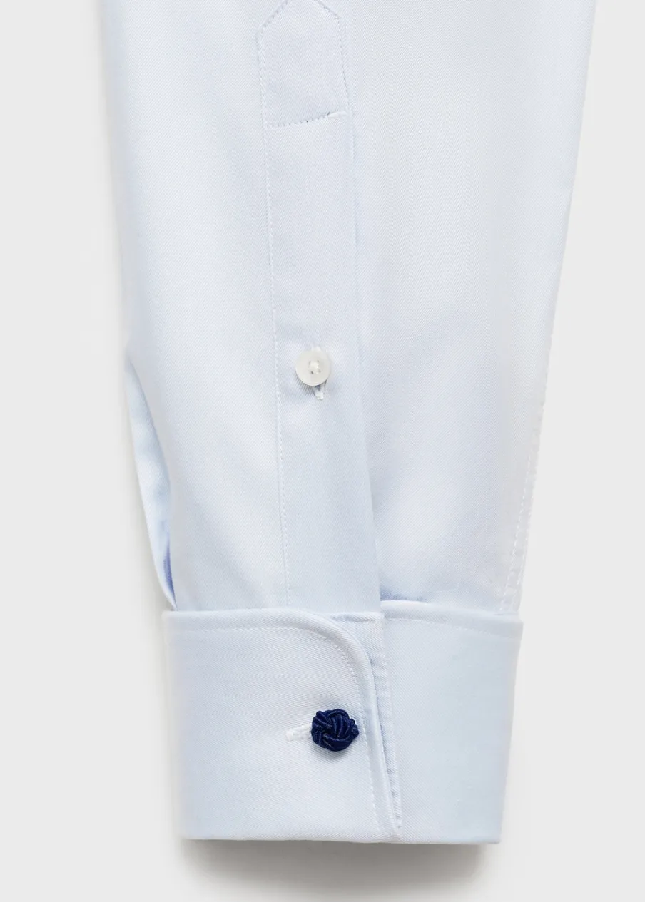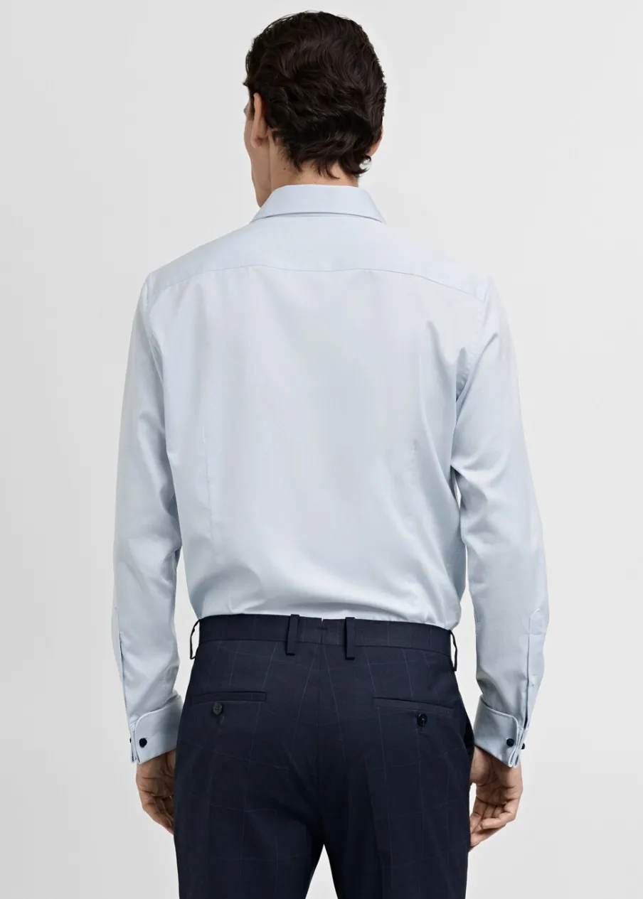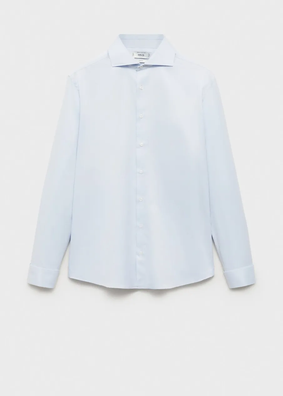 OpisSlim-fit. Tkanina z 100% bawełny. Kołnierzyk włoski. Długi rękaw z guzikami na mankietach. Podwójny mankiet ze…