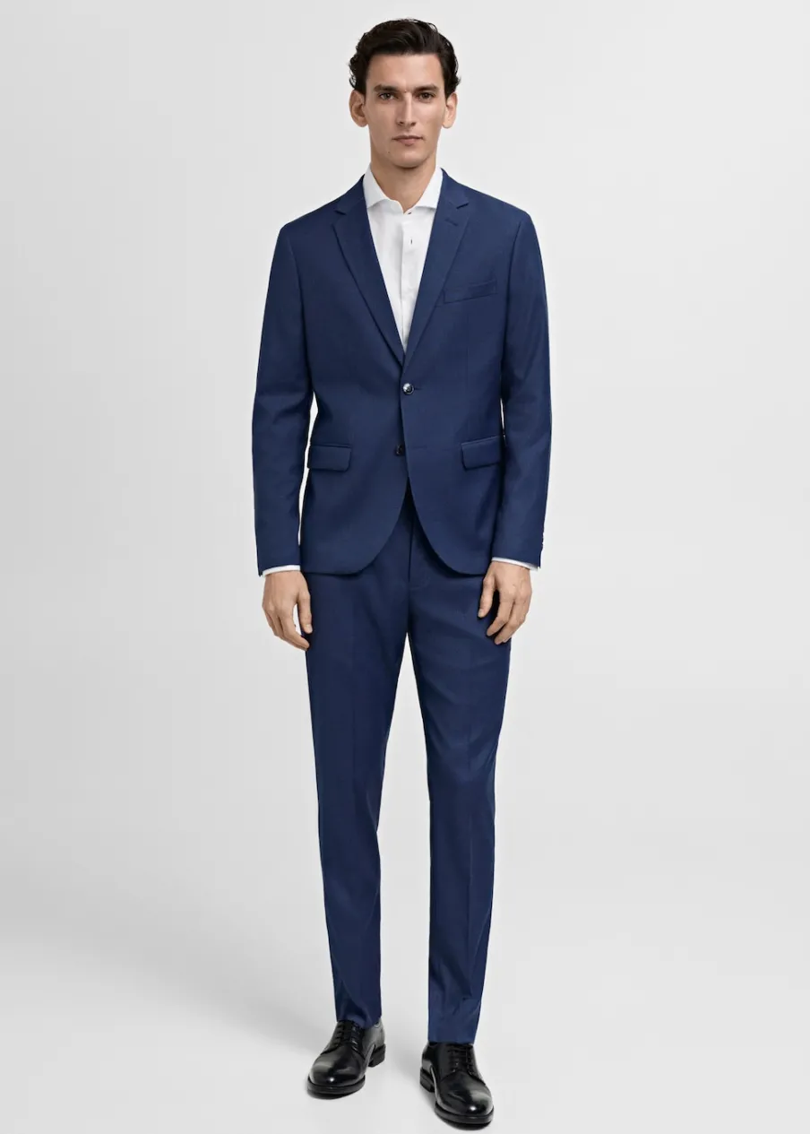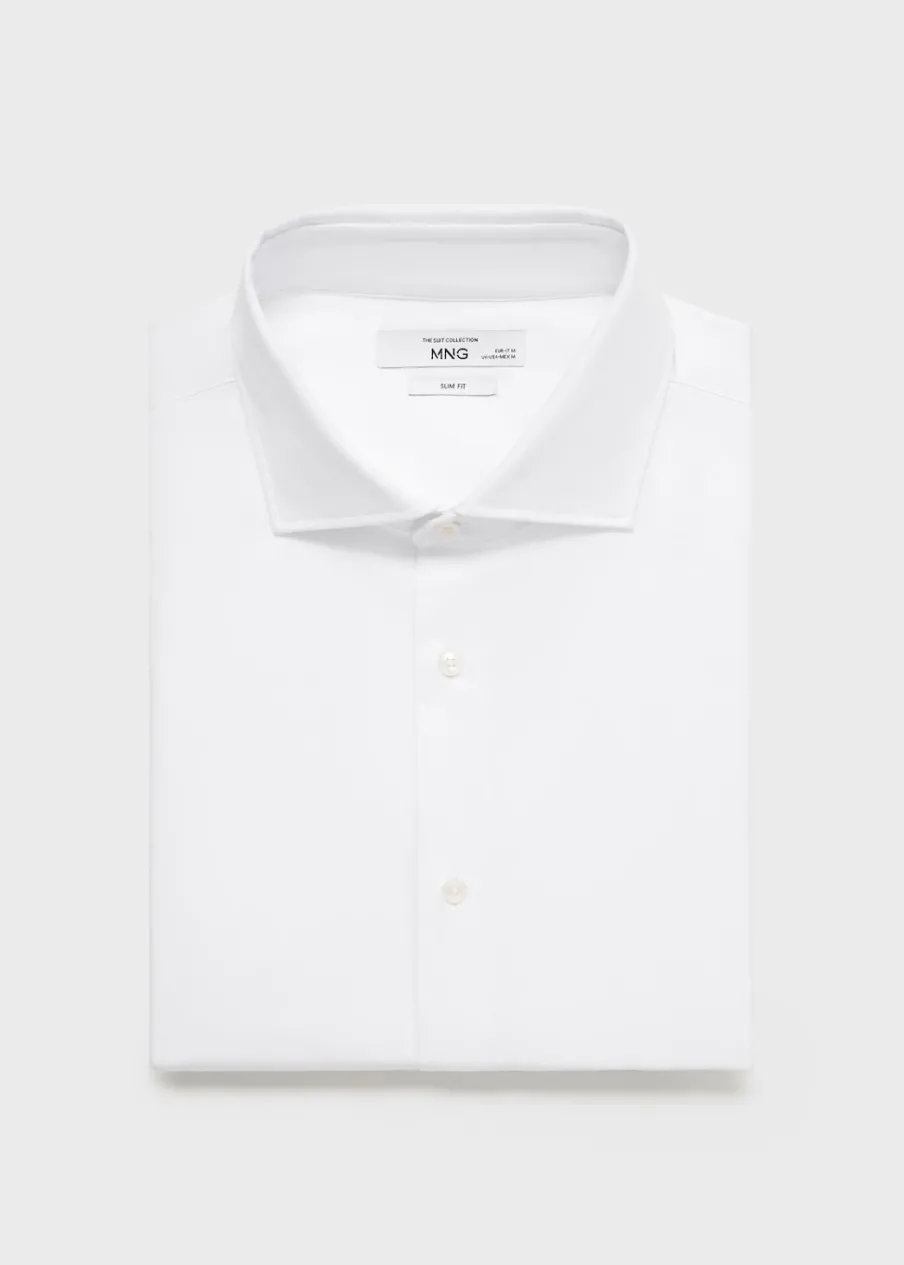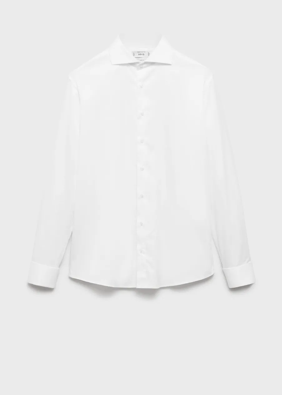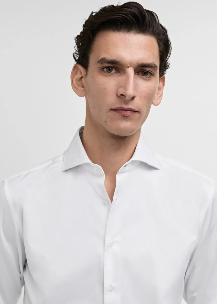 Slim-fit. Tkanina ze skośnej bawełny. Kołnierzyk włoski. Zapięcie na guziki z przodu. Podwójny mankiet ze spinką. Długi, zapinany rękaw. Zaokrąglony dół. Model ma 190 cm wzrostu i nosi rozmiar M.