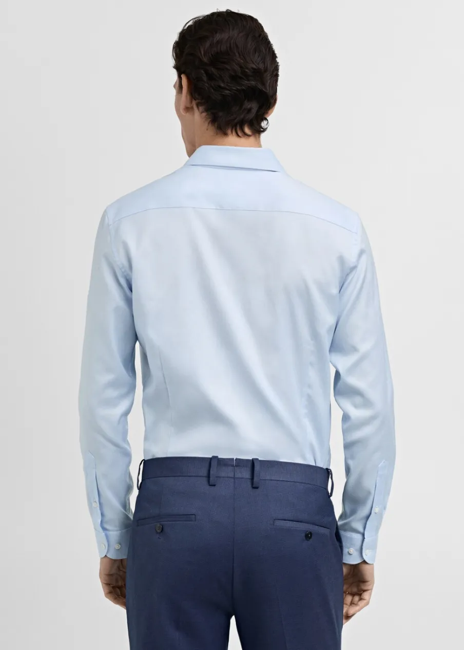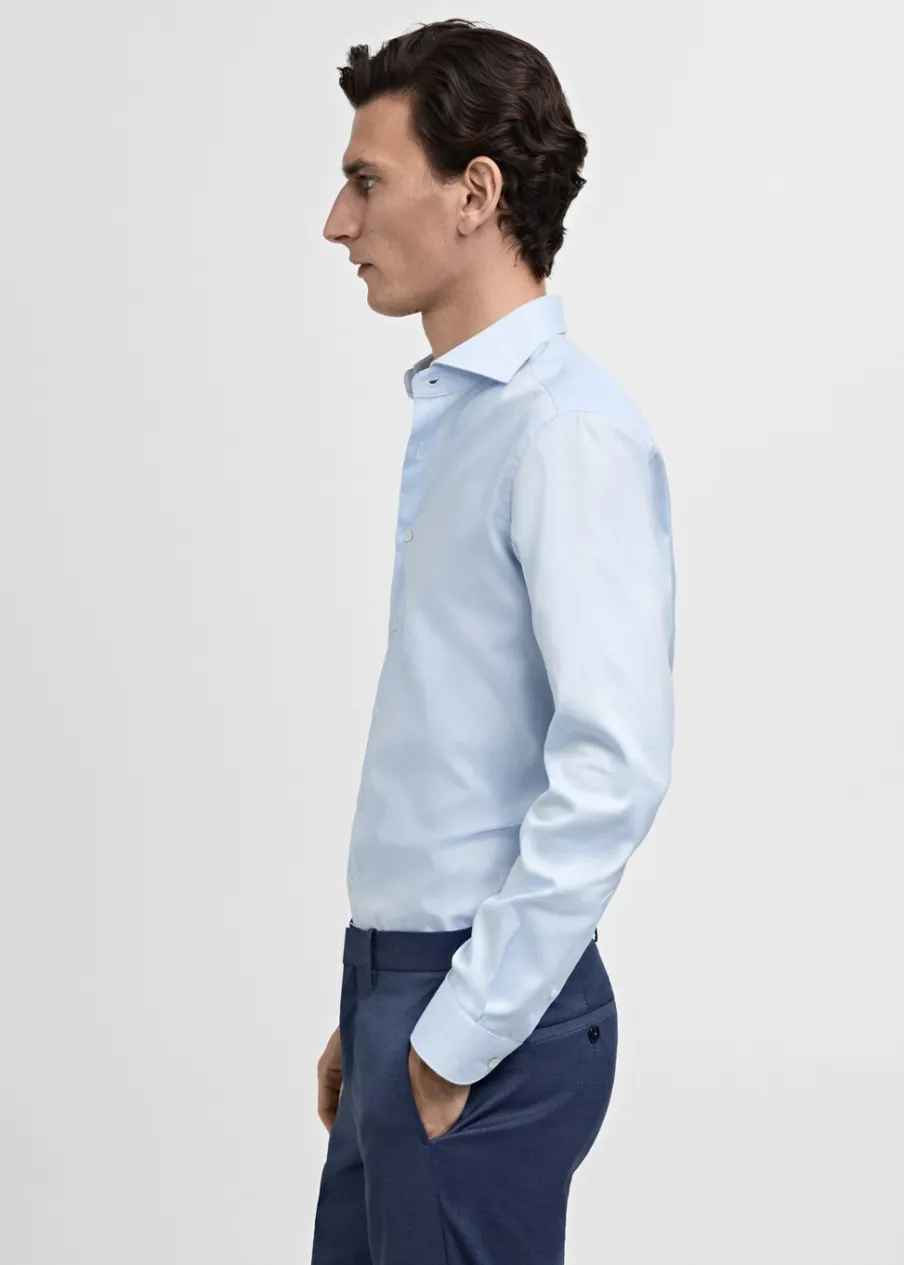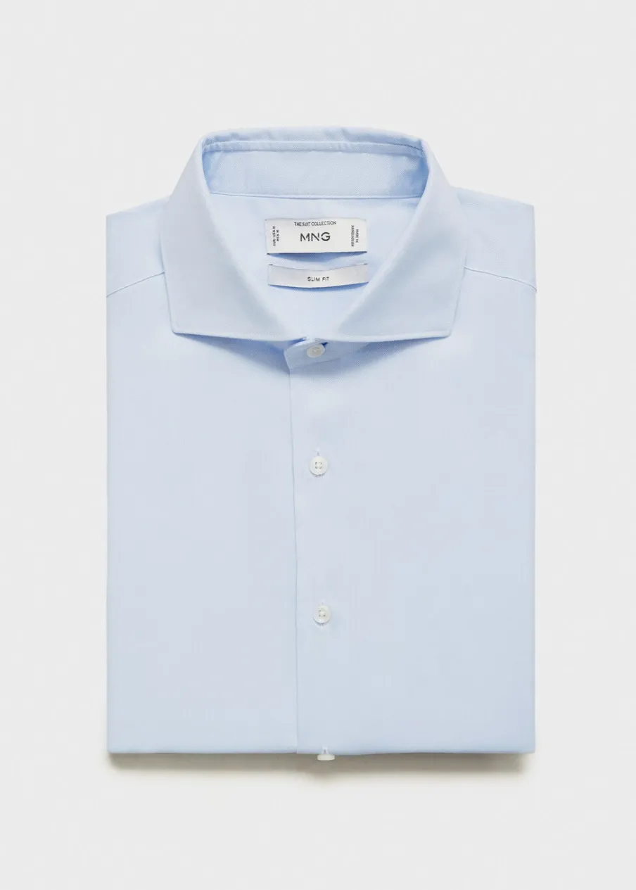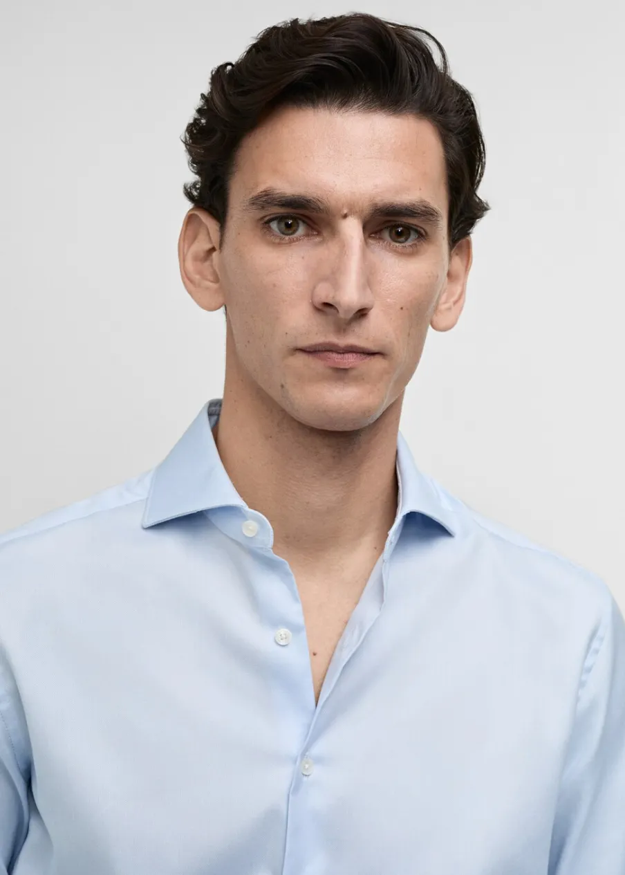 Slim-fit. Tkanina z 100% bawełny. Tkanina z mikroteksturą. Kołnierzyk włoski. Zapięcie na guziki z przodu. Długi rękaw z guzikami na mankietach. Zaokrąglony dół. Model ma 190 cm wzrostu i nosi rozmiar M.