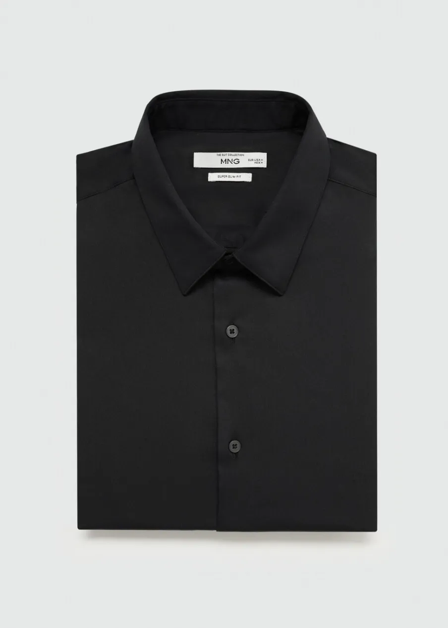 Super slim-fit. Tkanina z bawełnianej popeliny. Bawełniana tkanina stretch. Długi rękaw z guzikami na mankietach. Zapięcie z przodu na guziki. Model ma 185 cm wzrostu i nosi rozmiar M. Klasyczny kołnierzyk. Zaokrąglony dół.
