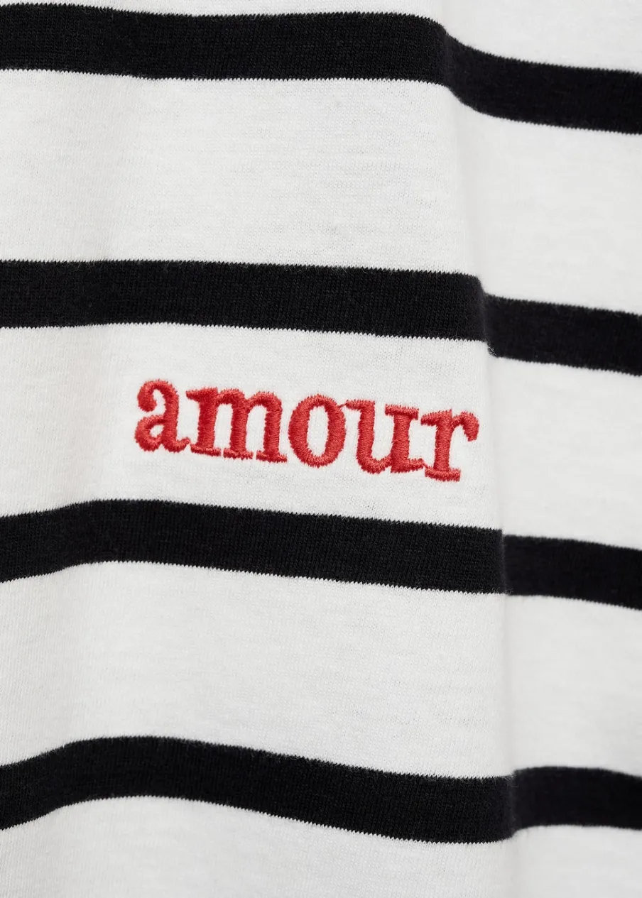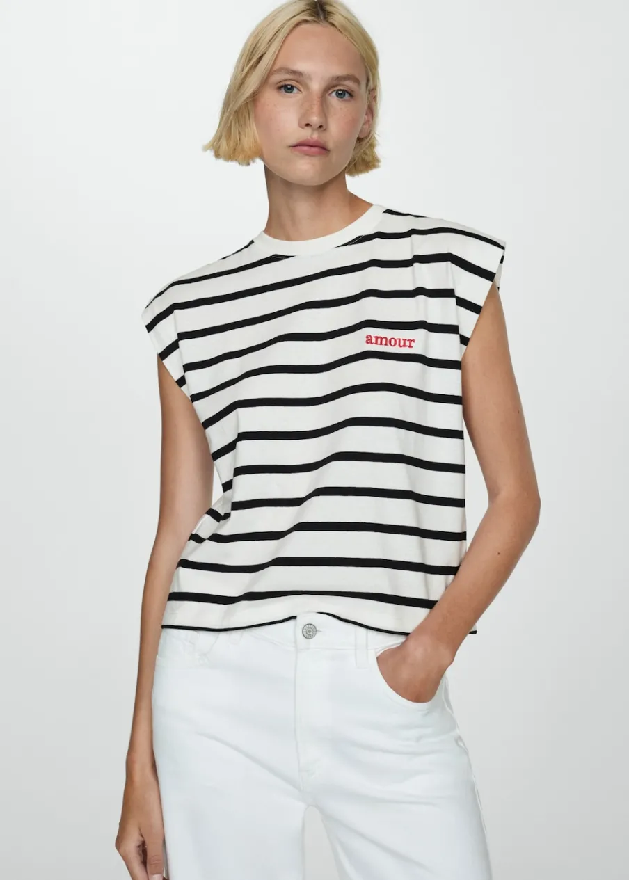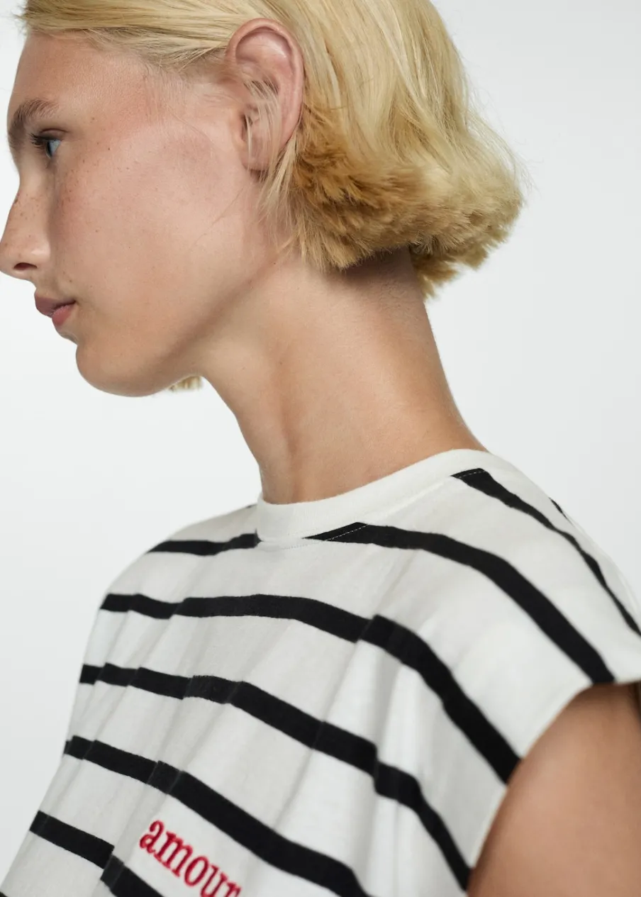 OpisModel prosty. Nadruk tekstu. Okrągły dekolt. Krótki rękaw. Tkanina z 100% bawełny. Wzór w paski.