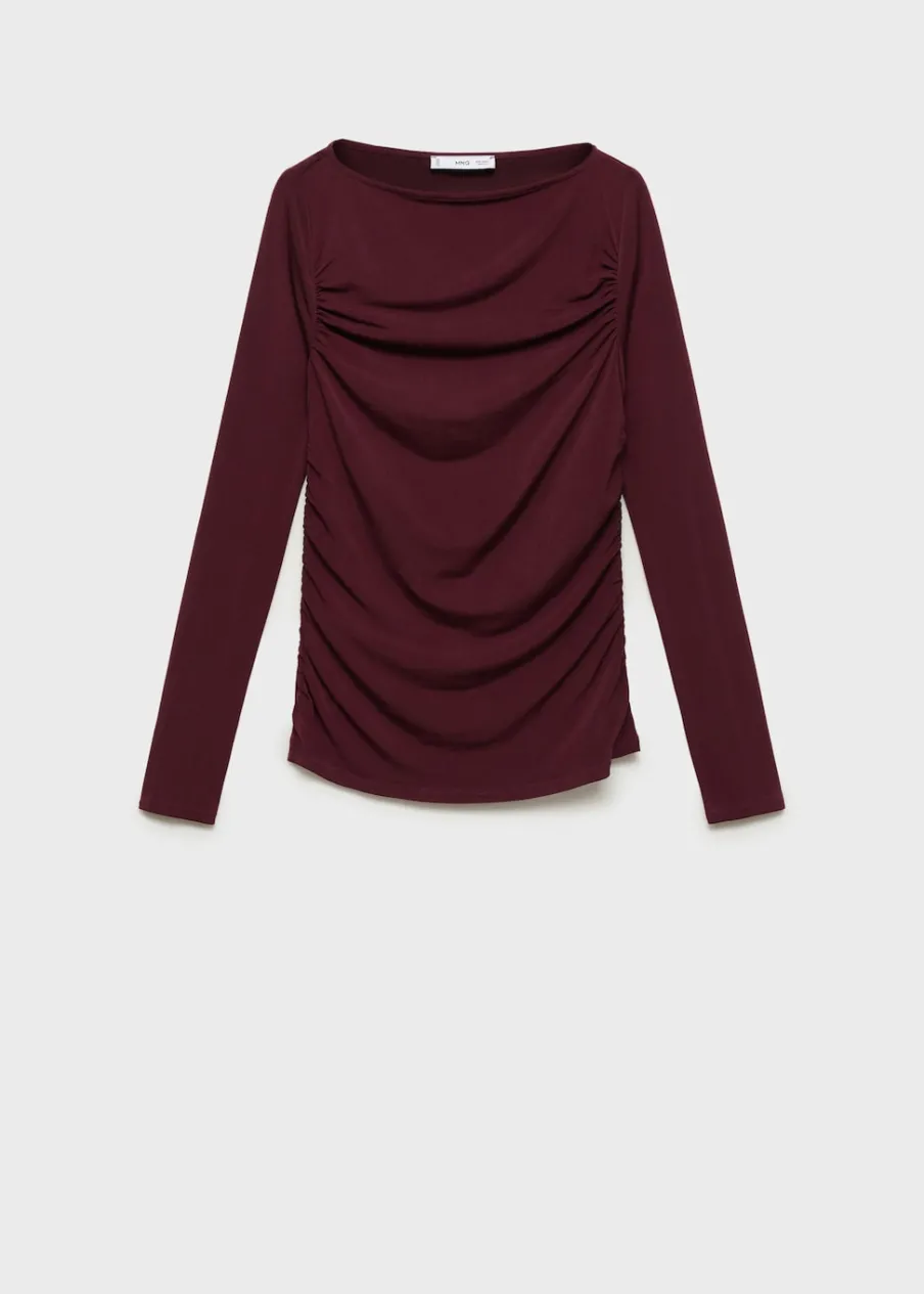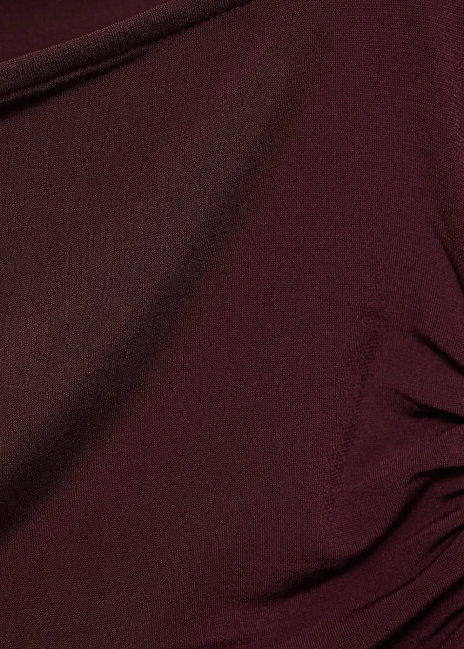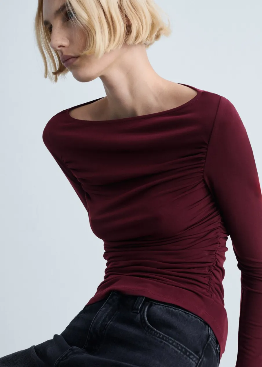 Elastyczna tkanina. Model wcięty. Model z drapowaniem. Dekolt w kształcie łódki. Długi rękaw. Bez zapięcia.