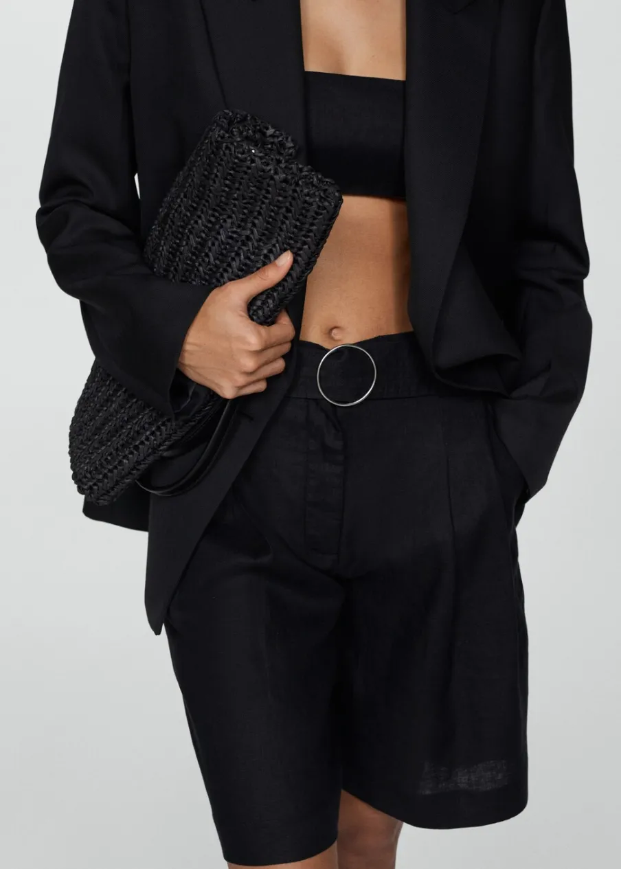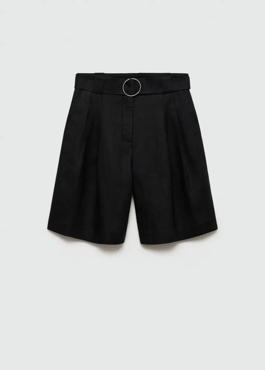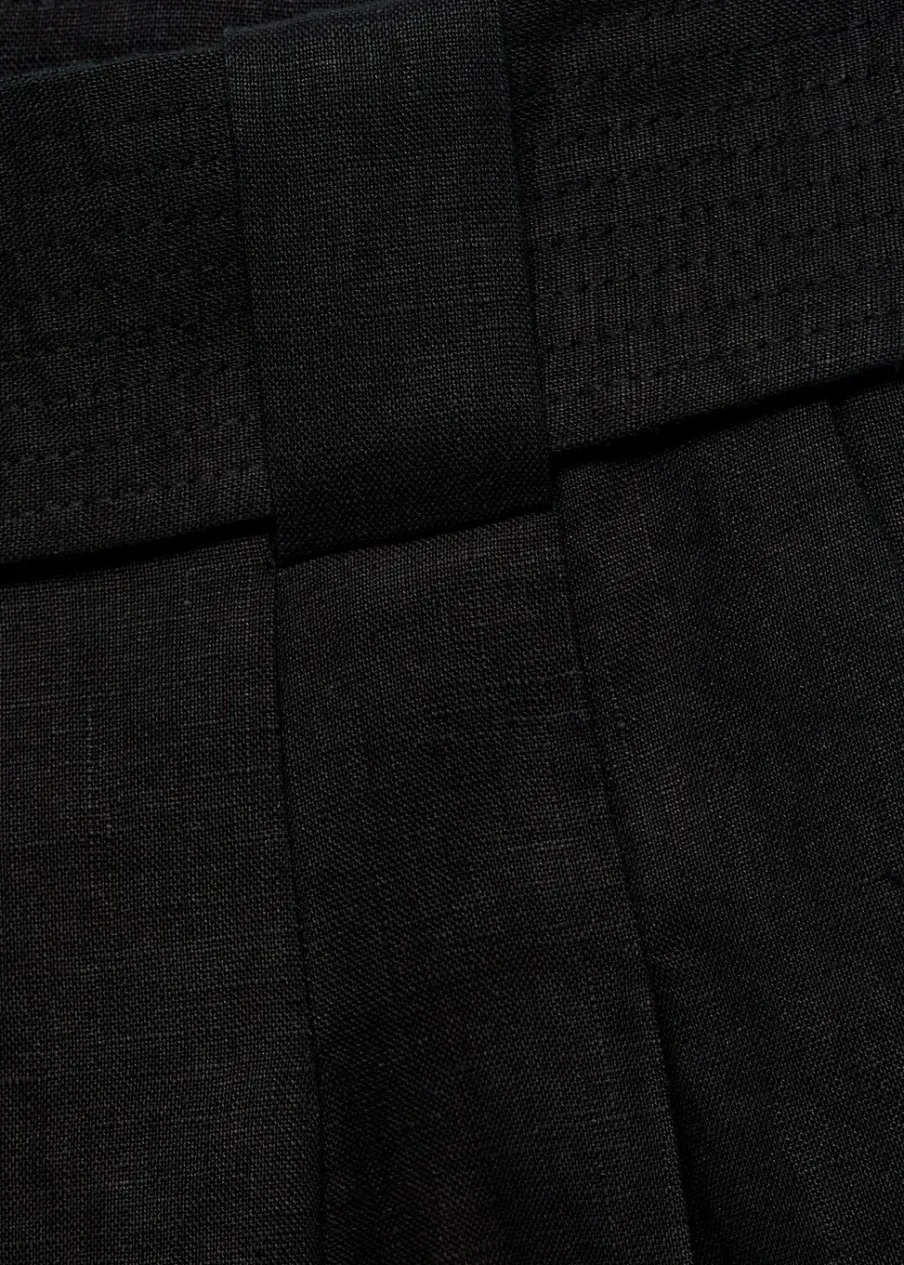Tkanina z 100% lnu. Podwyższony stan. Model prosty. Krótki krój. Dwie kieszenie boczne. Szlufki. Kryte zapięcie na guzik, haftkę i suwak. Dekoracyjny pasek.