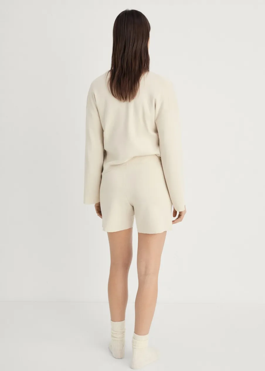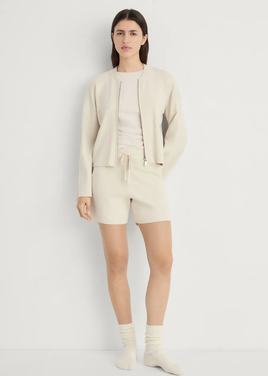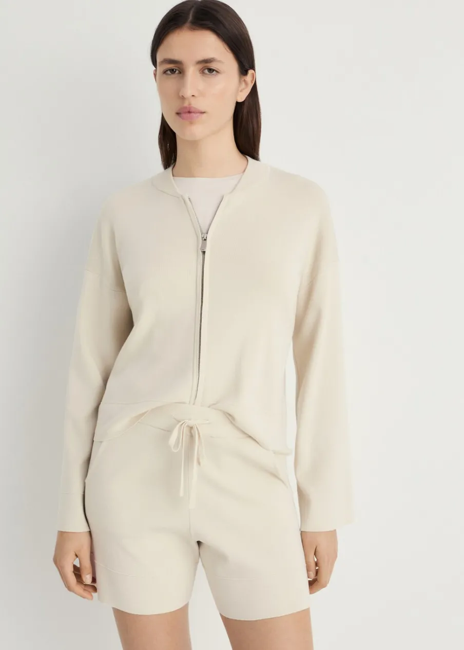 Elastyczna tkanina. Tkanina ze ściągaczowej dzianiny. Krótki krój. Regulowane zapięcie na troczki. Elastyczna gumka w pasie dla większej wygody. Model wcięty. Total look.