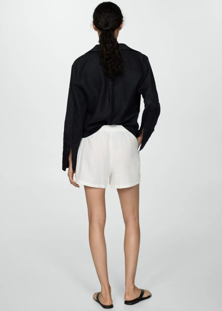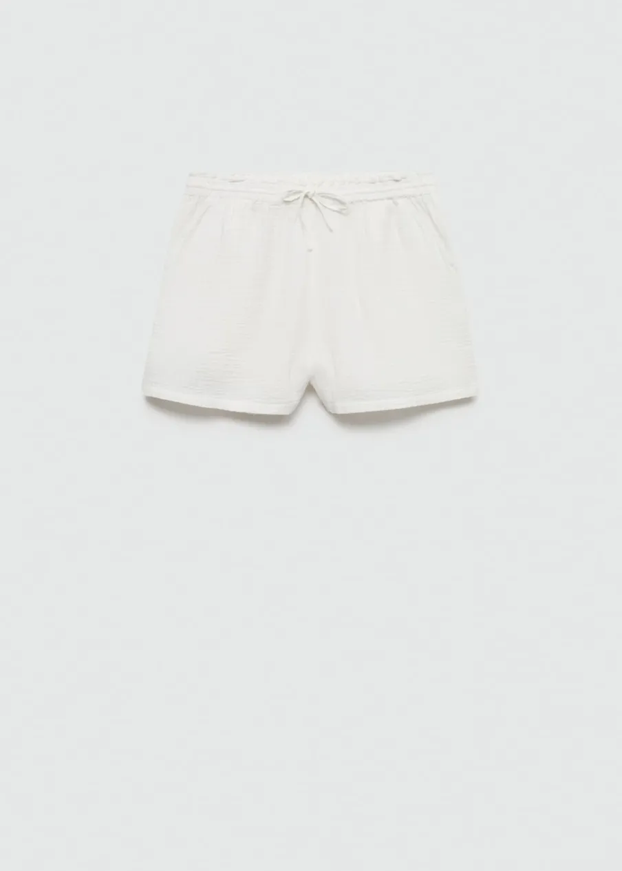 OpisKreszowana tkanina. Krótki krój. Model prosty. Elastyczny pas ze sznurkiem. Tkanina z 100% bawełny.