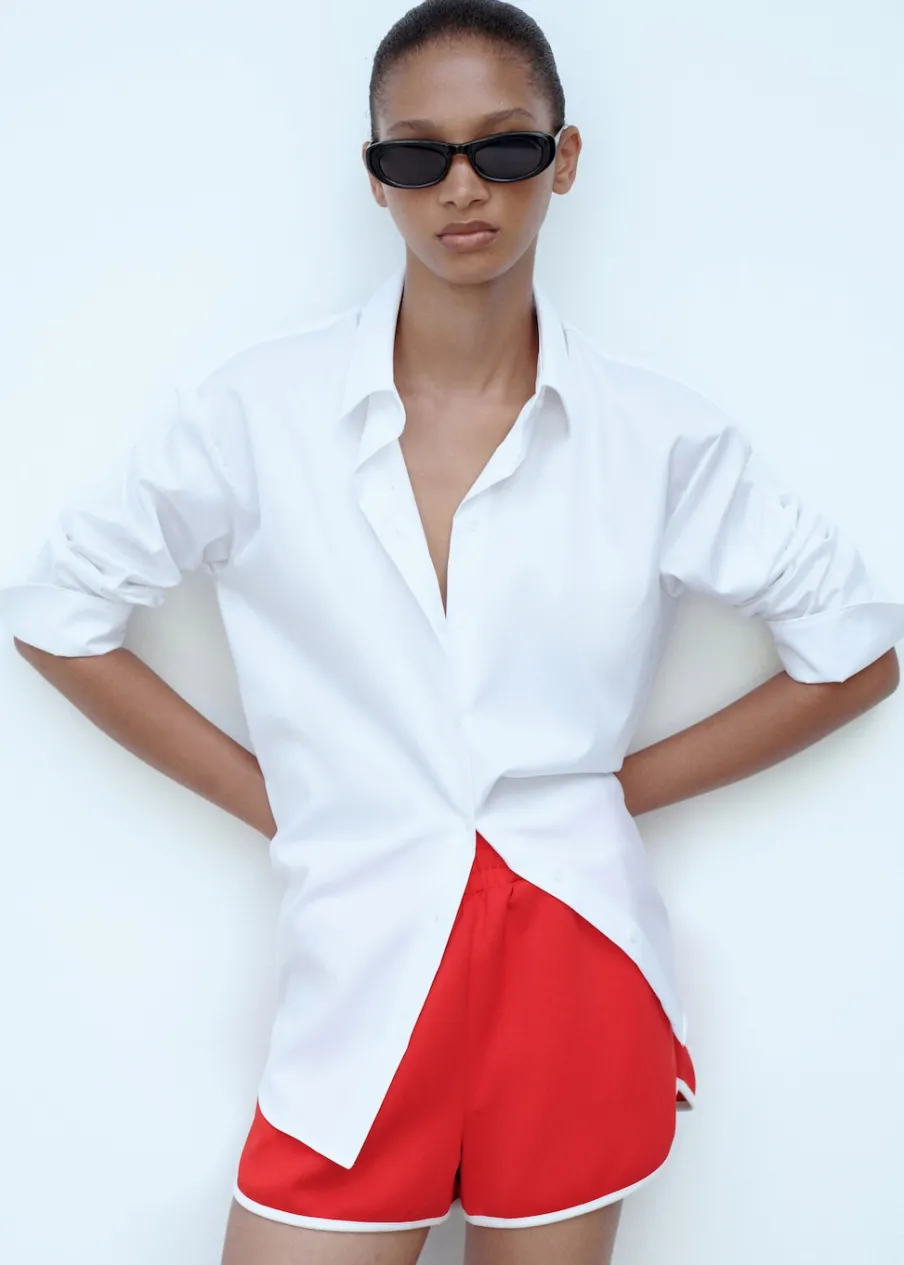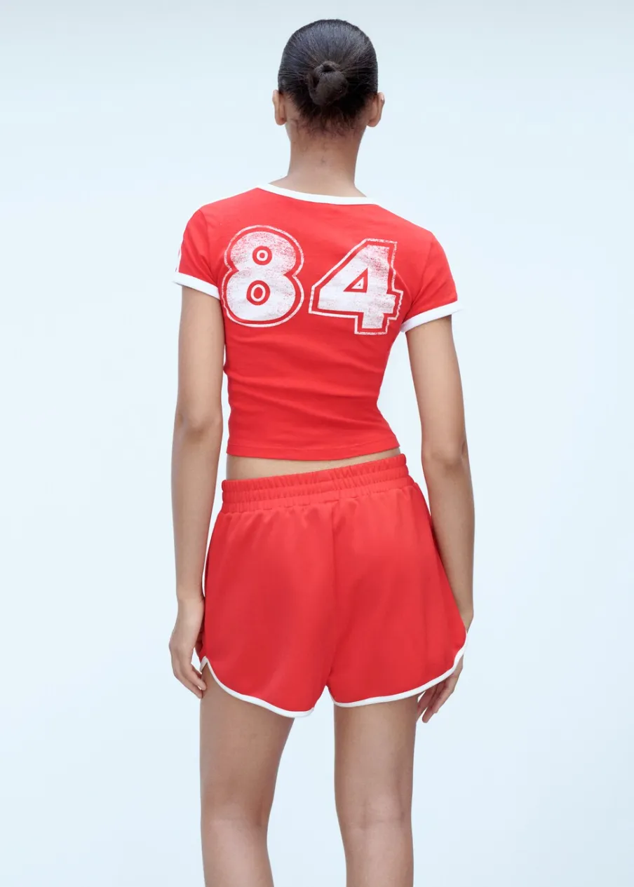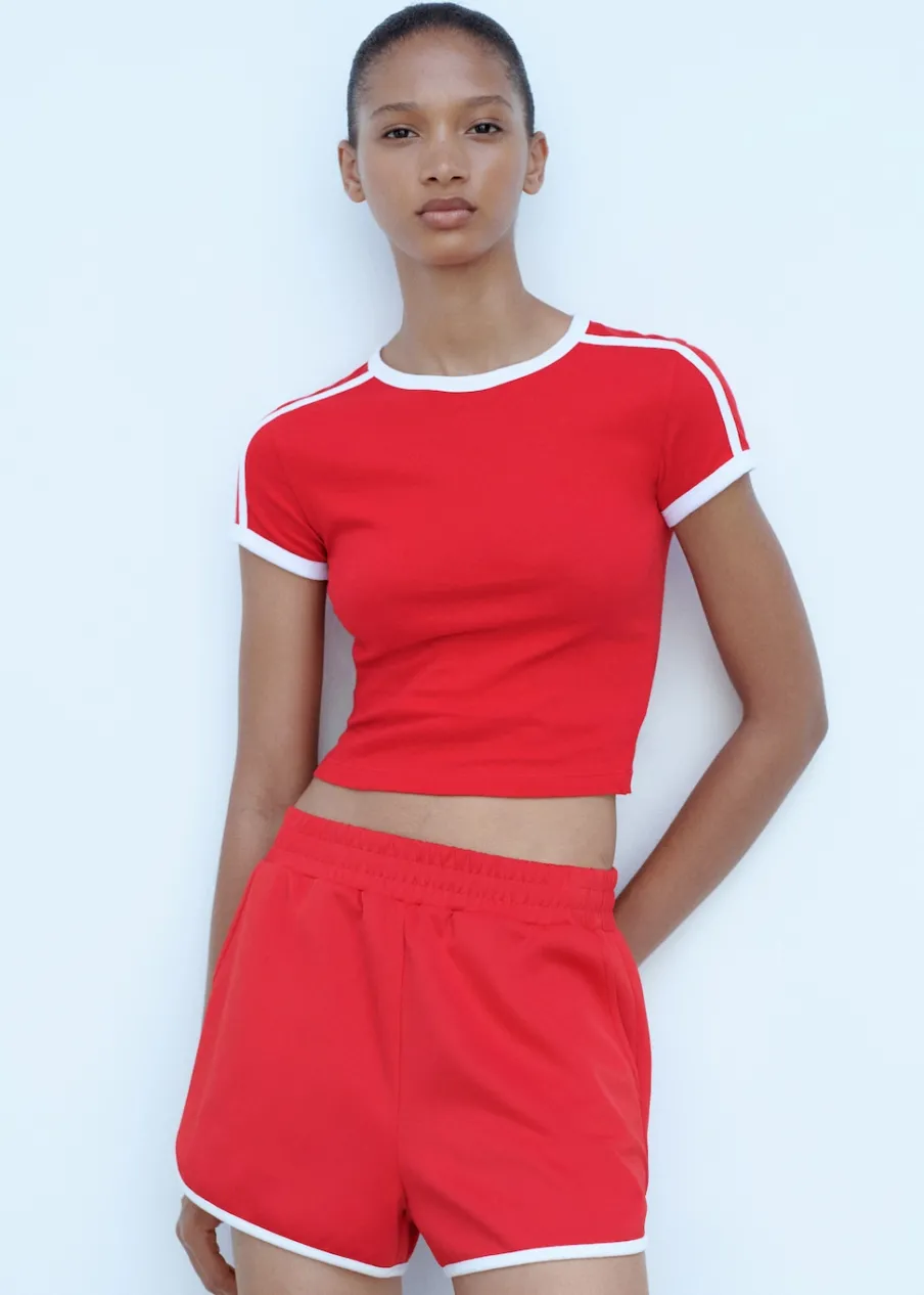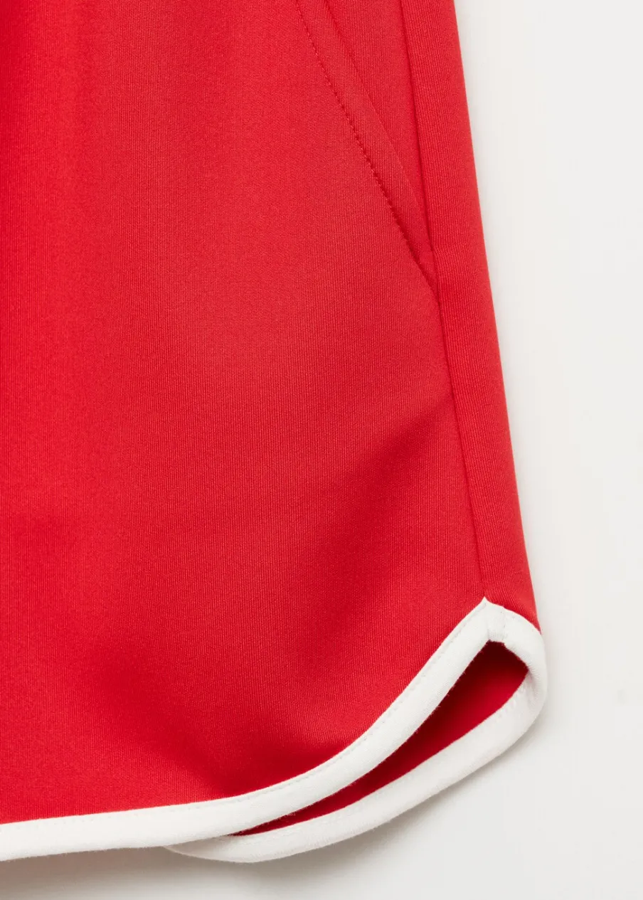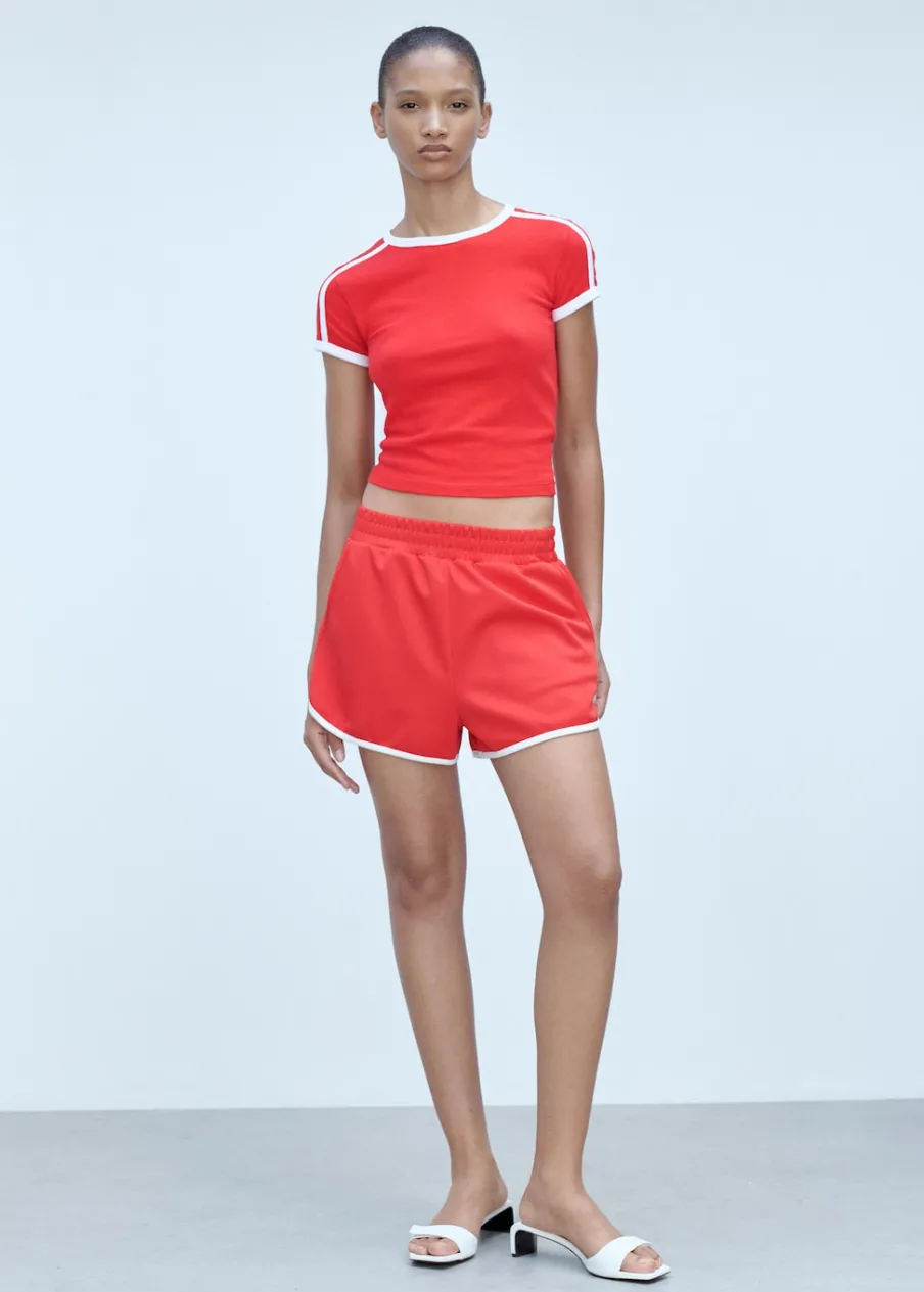 Krótki krój. Model prosty. Dwie kieszenie boczne. Elastyczny pas. Bez zapięcia. Kontrastowe wykończenia. Total look.