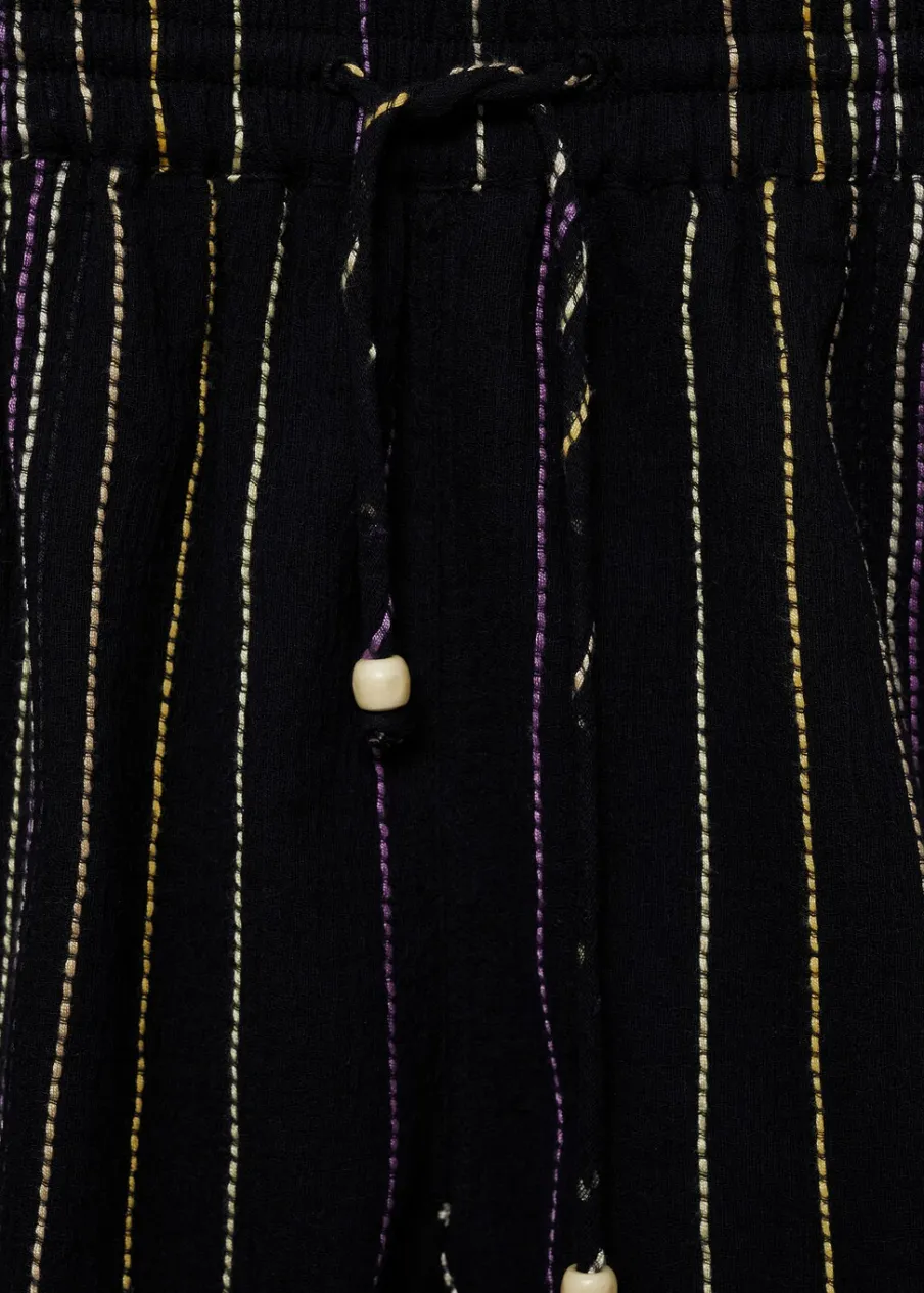 Tkanina mieszanka bawełny. Krótki krój. Model prosty. Elastyczny pas z wiązanym zapięciem. Postrzępione nogawki. Total look. Wzór w paski.