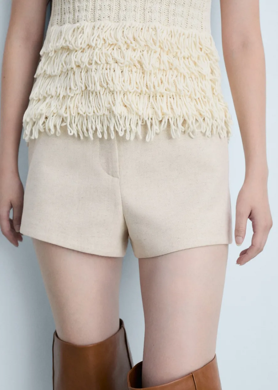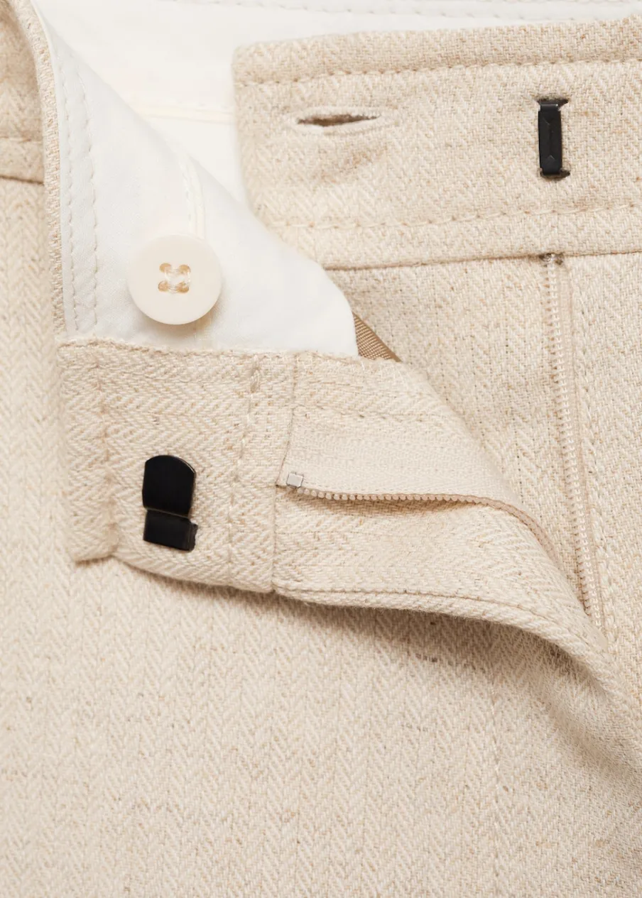 Tkanina mieszanka bawełny i lnu. Krótki krój. Model prosty. Kryte zapięcie na guzik, haftkę i suwak. Wewnętrzna podszewka. Total look. Tkanina w jodełkę.