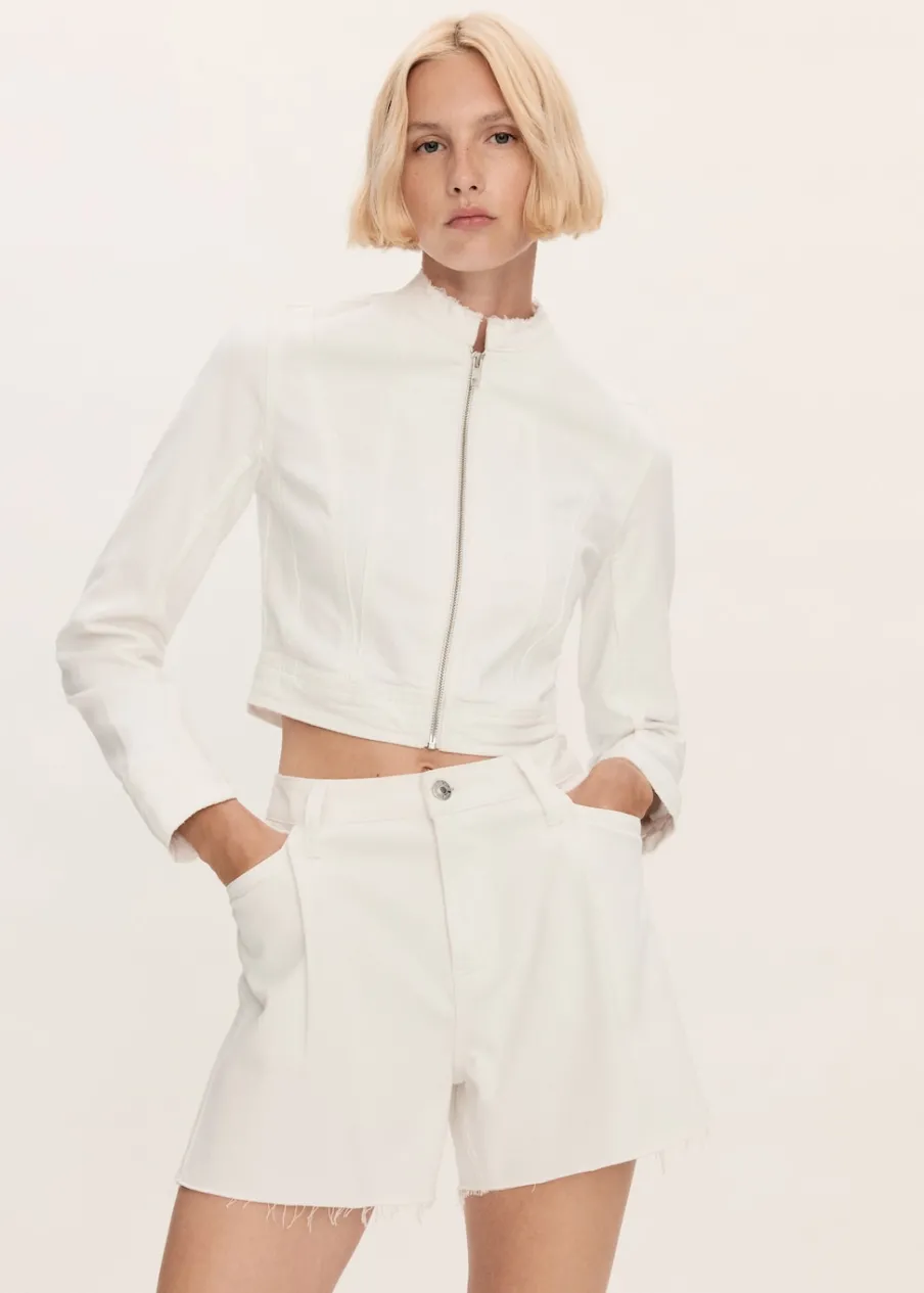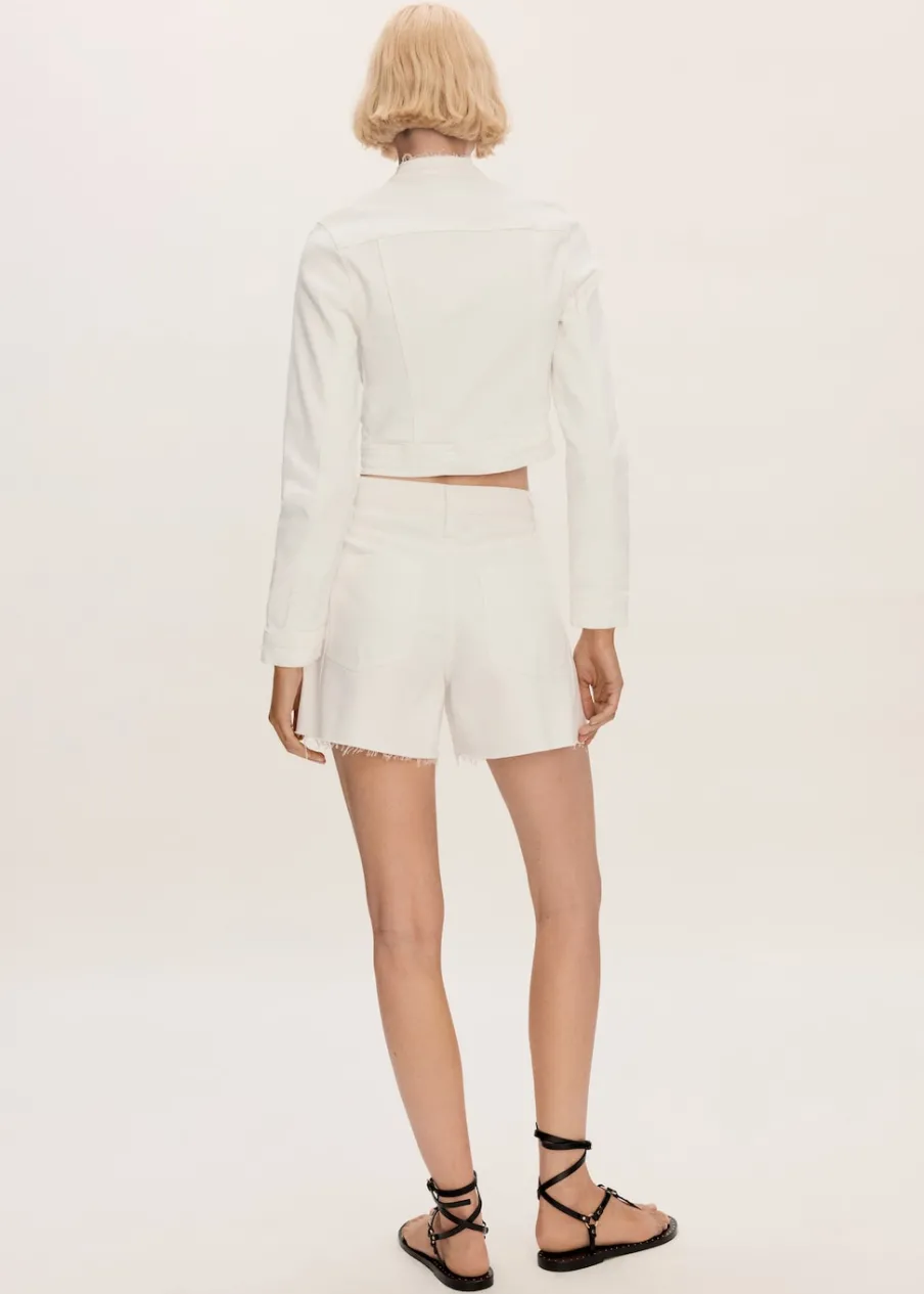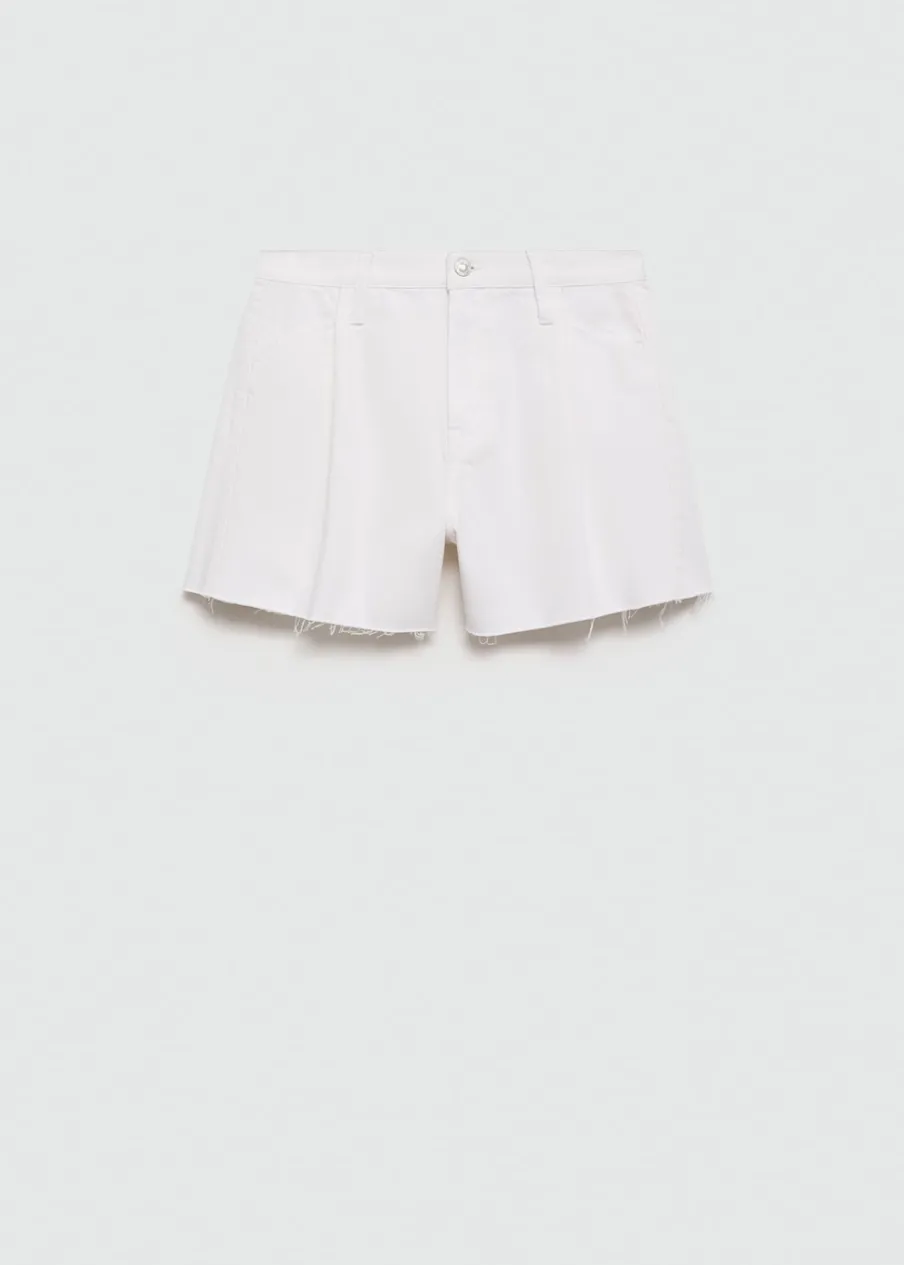Tkanina bawełniana w dżinsowym stylu. Model prosty. Krótki krój. Dwie kieszenie z przodu. Dwie kieszenie nakładane z tyłu. Szlufki. Detal z zakładkami. Postrzępione nogawki. Zapięcie na zamek i guzik z przodu.