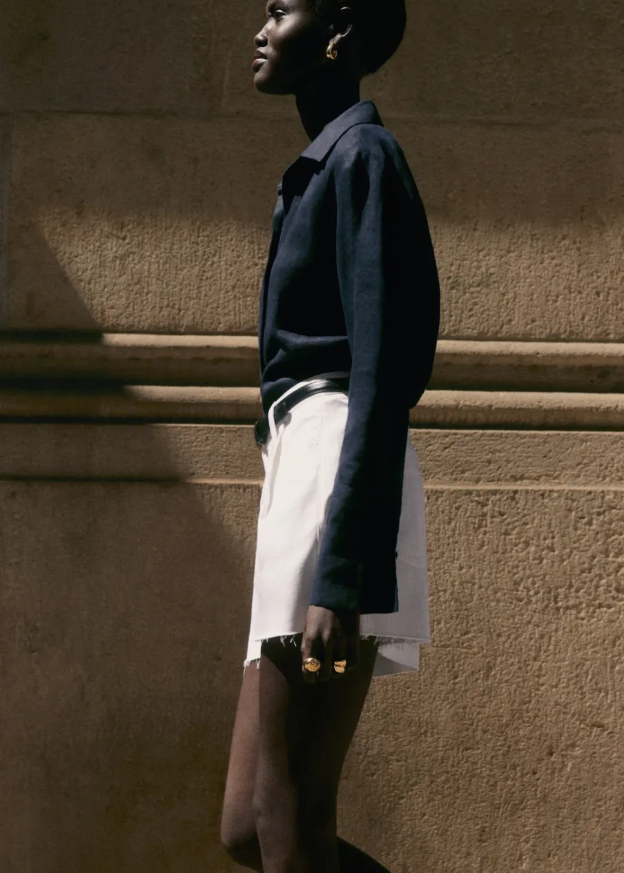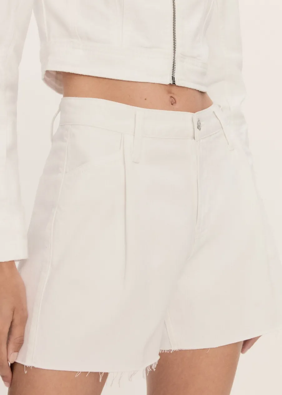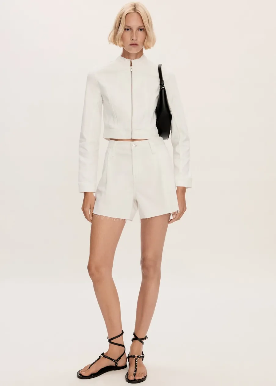Tkanina bawełniana w dżinsowym stylu. Model prosty. Krótki krój. Dwie kieszenie z przodu. Dwie kieszenie nakładane z tyłu. Szlufki. Detal z zakładkami. Postrzępione nogawki. Zapięcie na zamek i guzik z przodu.