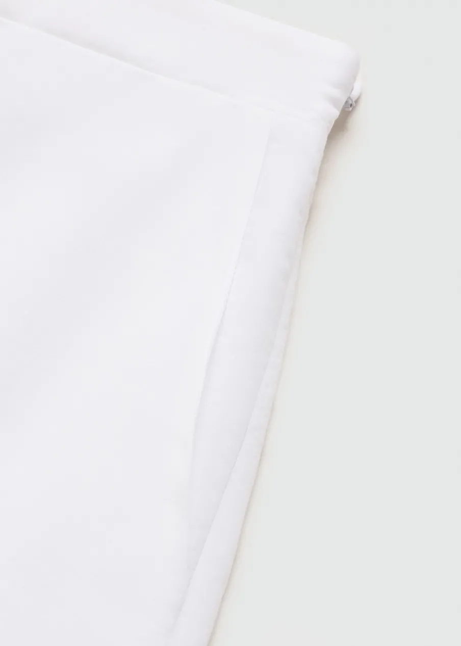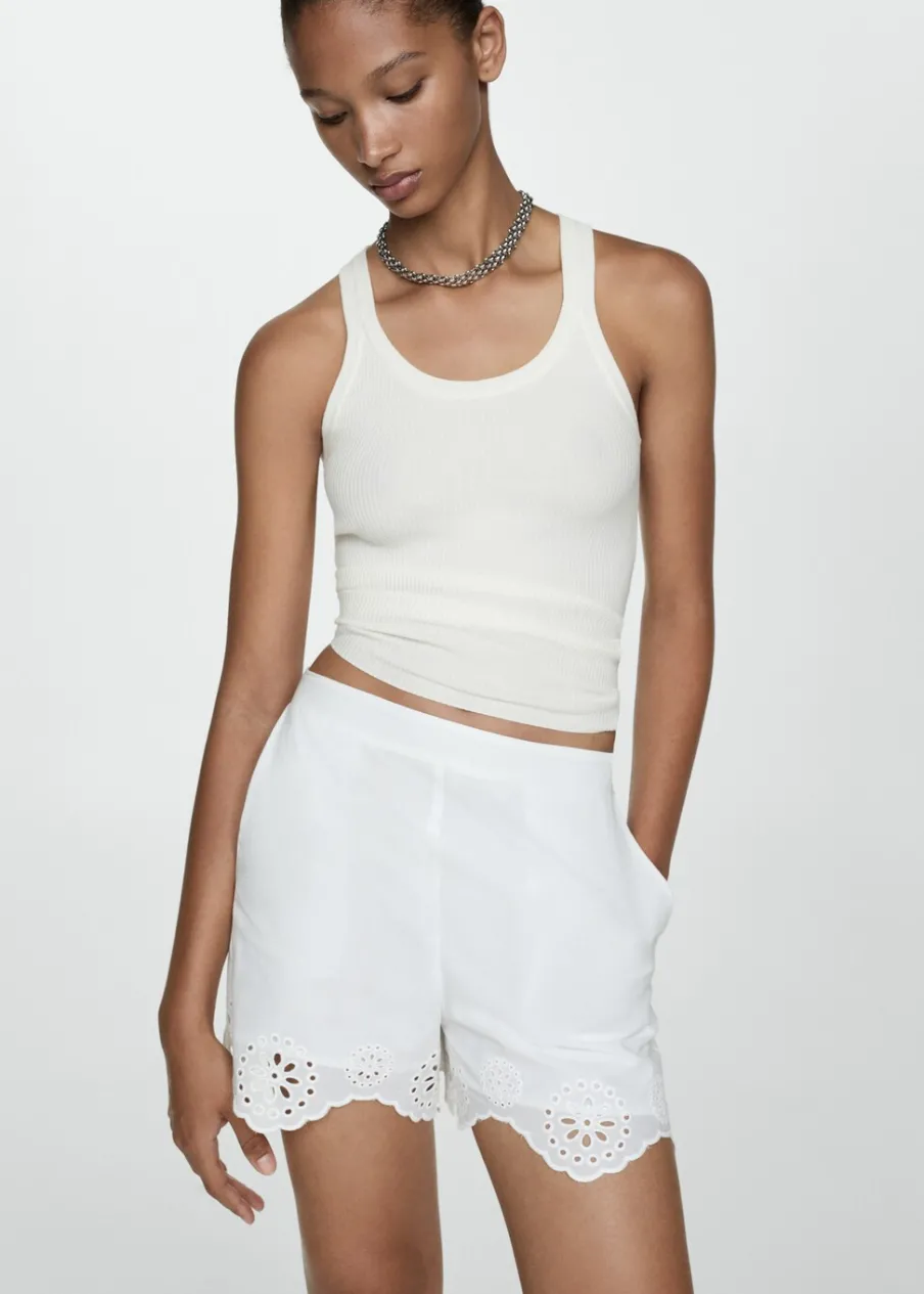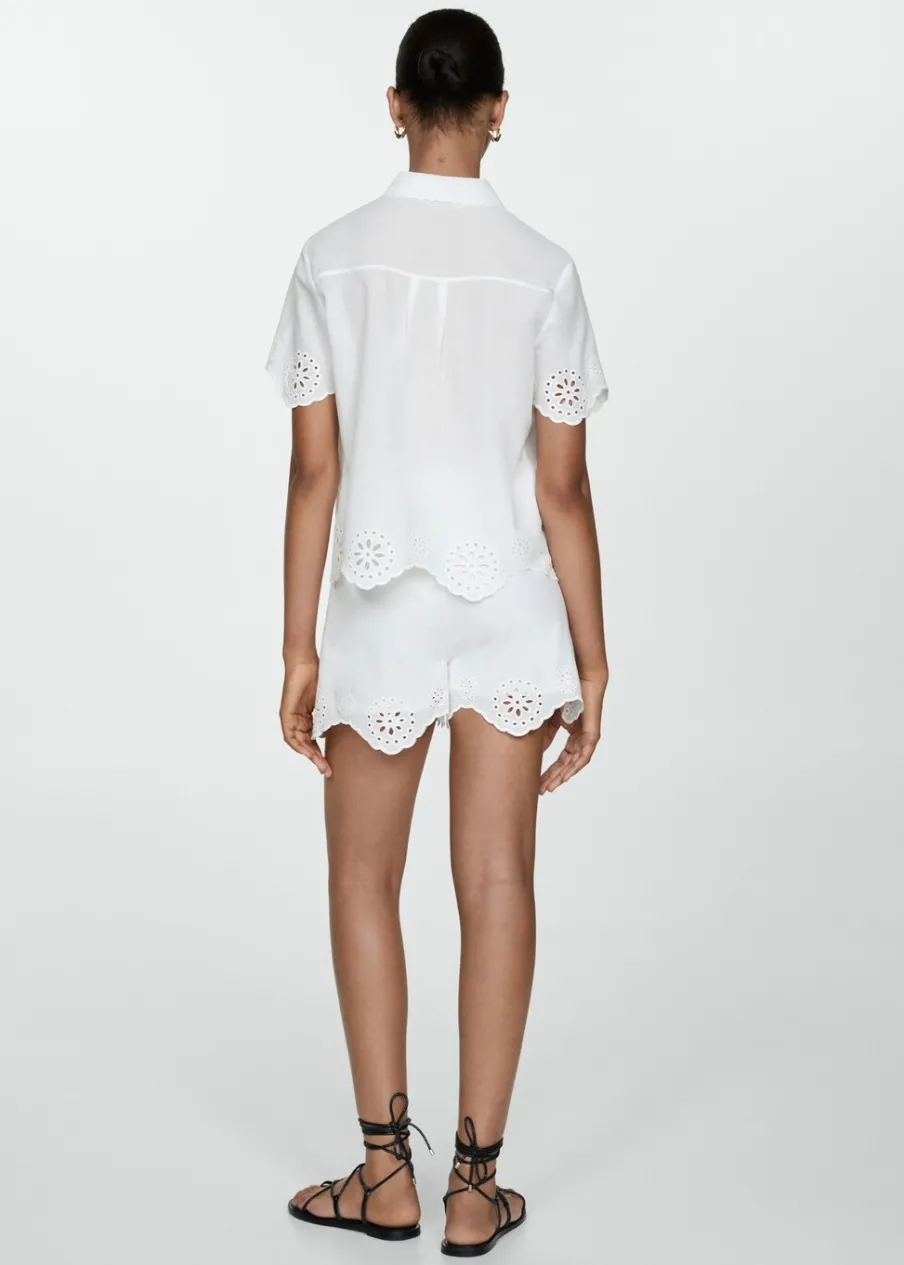Model prosty. Krótki krój. Podwyższony stan. Kieszenie boczne. Boczne zapięcie na suwak. Haftowane detale. Ażurowe detale. Wewnętrzna podszewka. Total look. Tkanina z 100% bawełny.