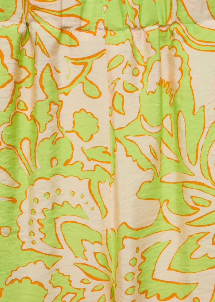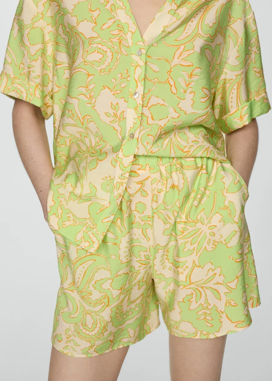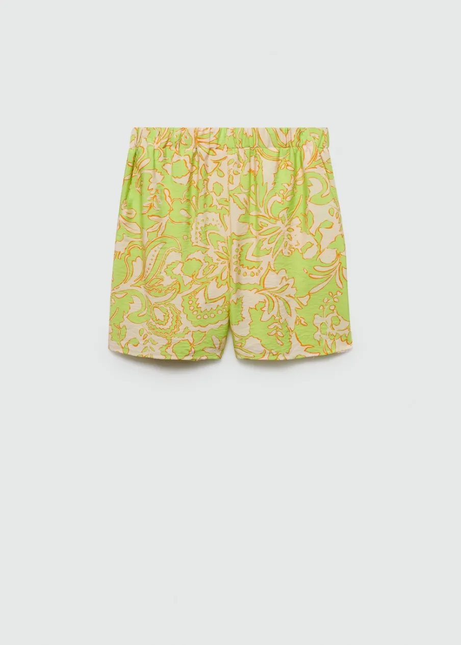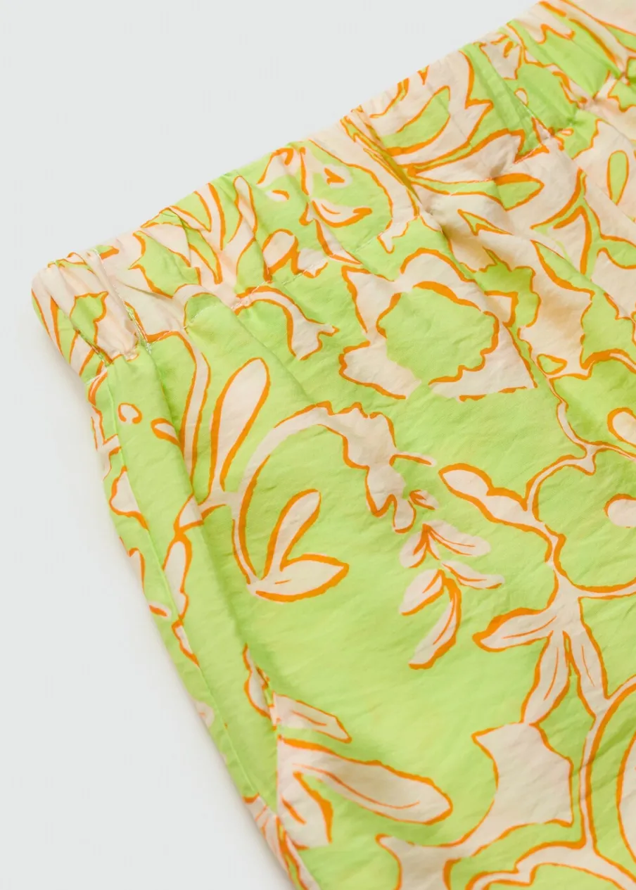 Lejąca tkanina. Krótki krój. Model prosty. Dwie kieszenie boczne. Elastyczny pas. Bez zapięcia. Total look. Nadruk.