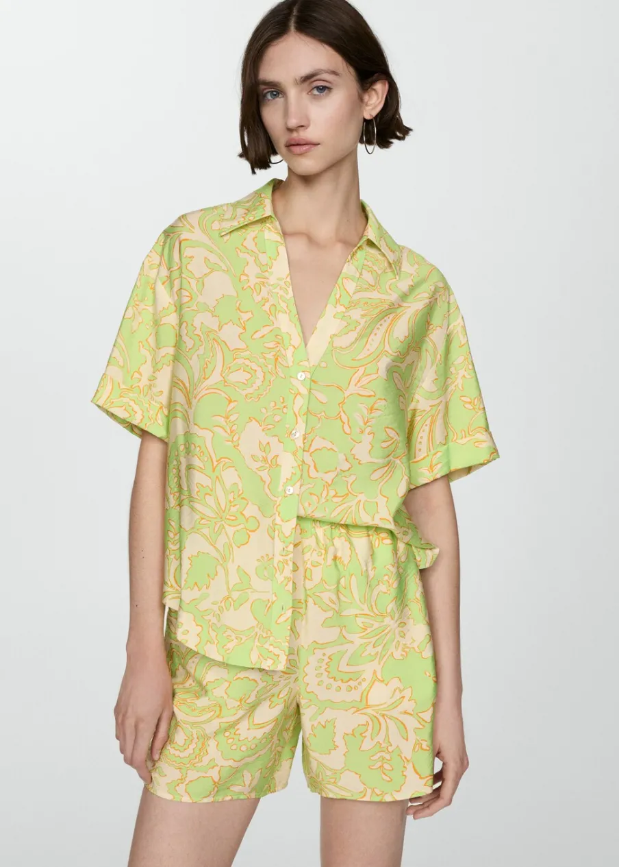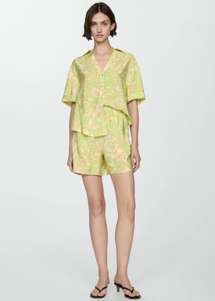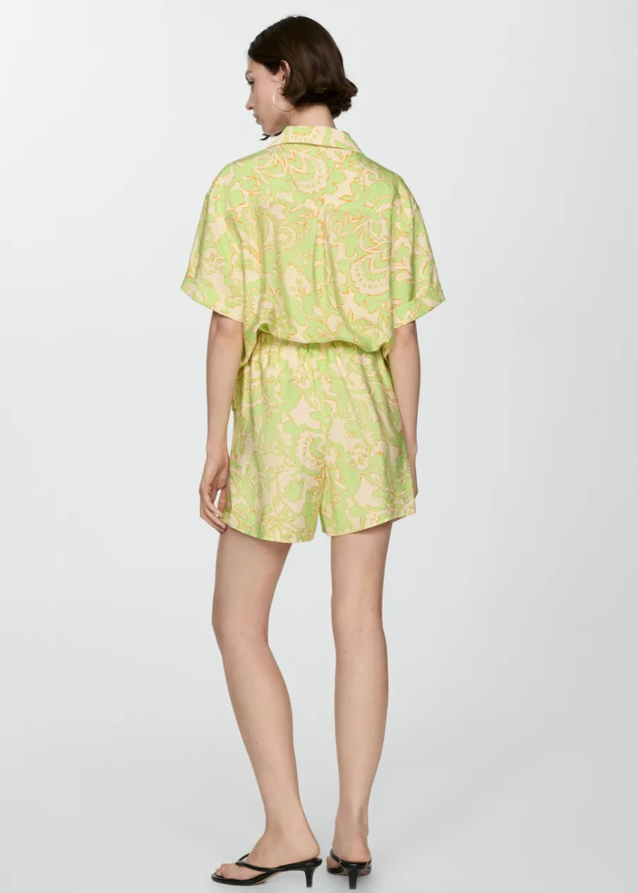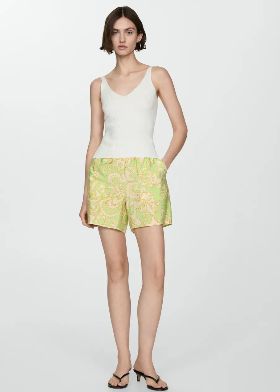 Lejąca tkanina. Krótki krój. Model prosty. Dwie kieszenie boczne. Elastyczny pas. Bez zapięcia. Total look. Nadruk.