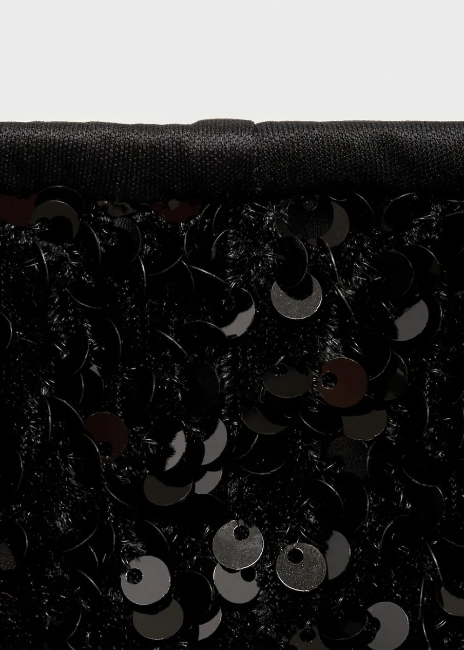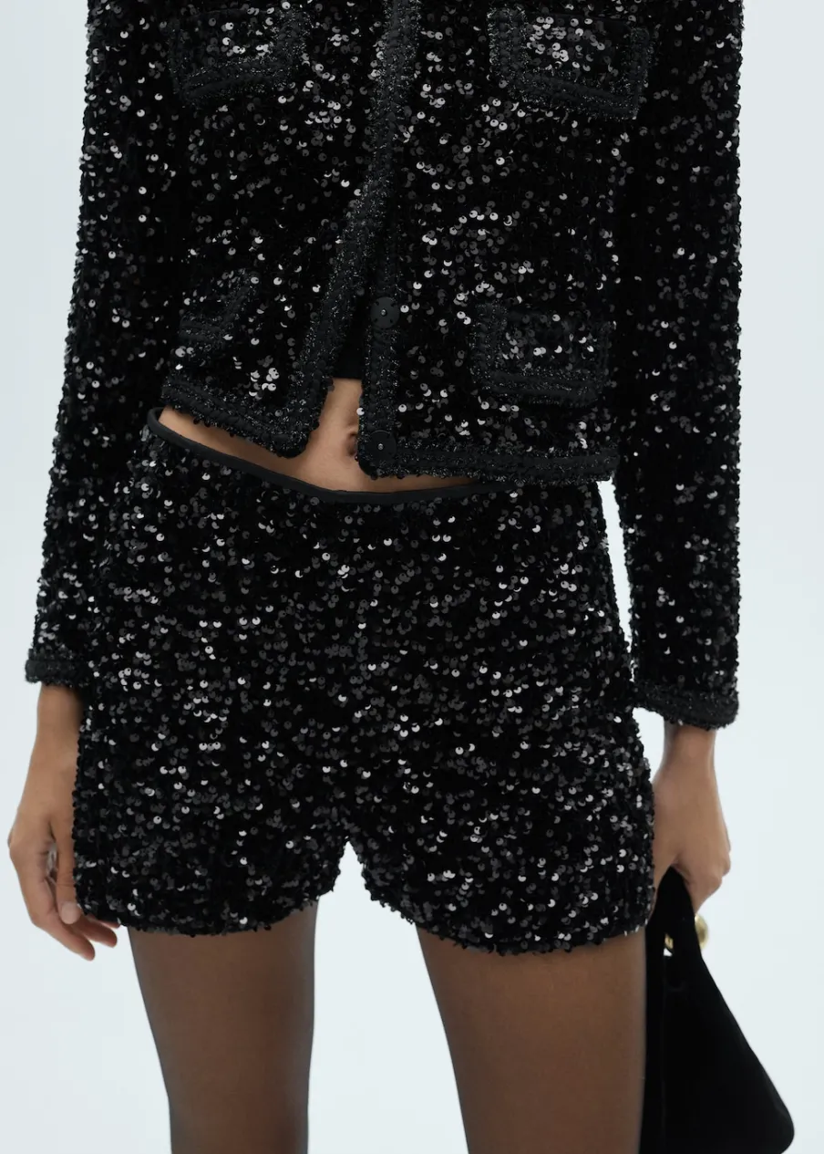 Cekinowa tkanina. Model prosty. Krótki krój. Elastyczny pas. Bez zapięcia. Total look. Kolekcja wizytowa.