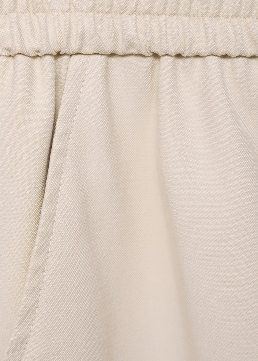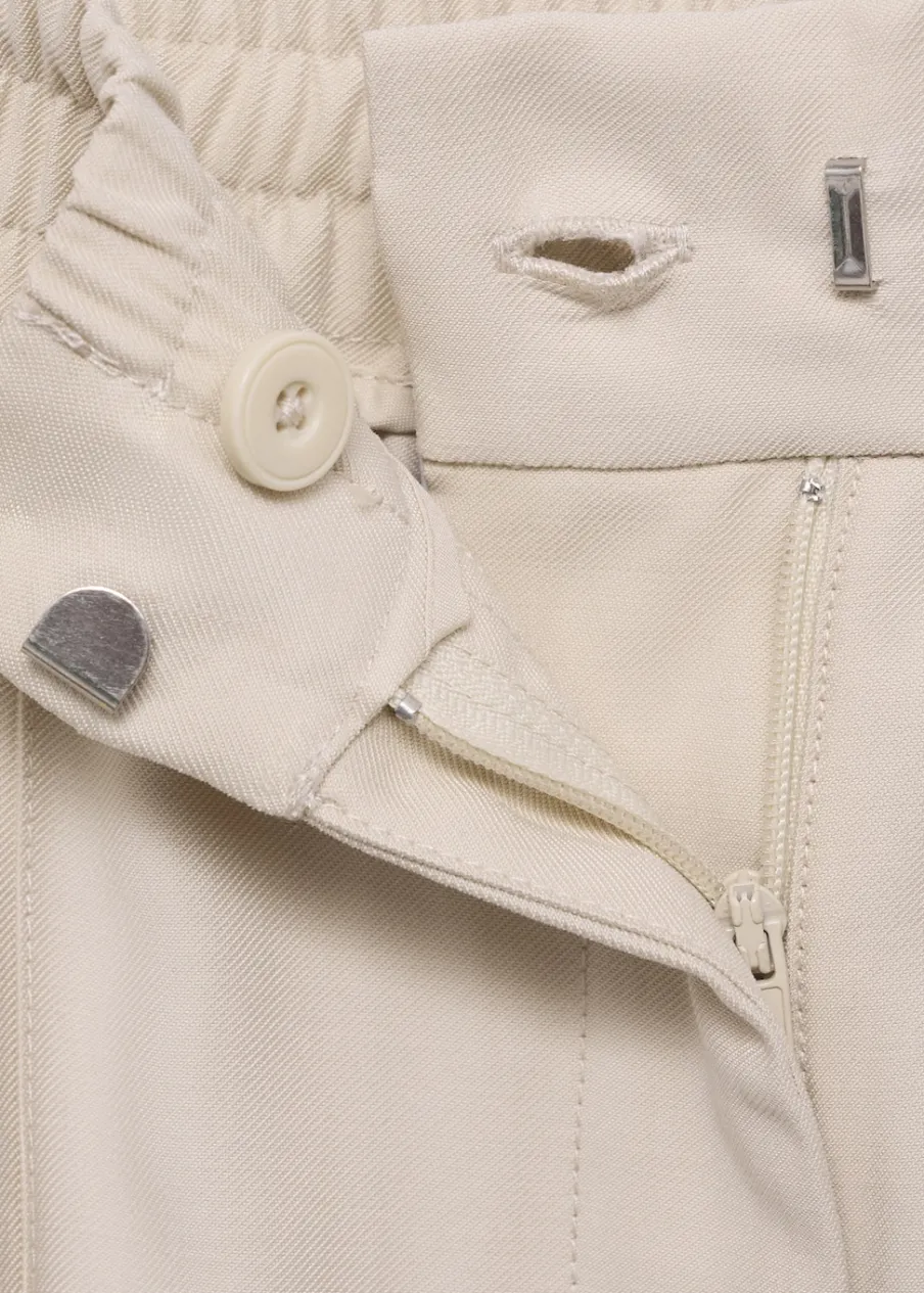 Lejąca tkanina. Model prosty. Krótki krój. Kryte zapięcie na guzik, haftkę i suwak. Elastyczny pas.
