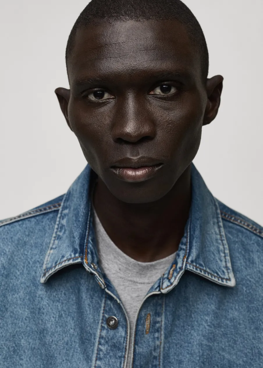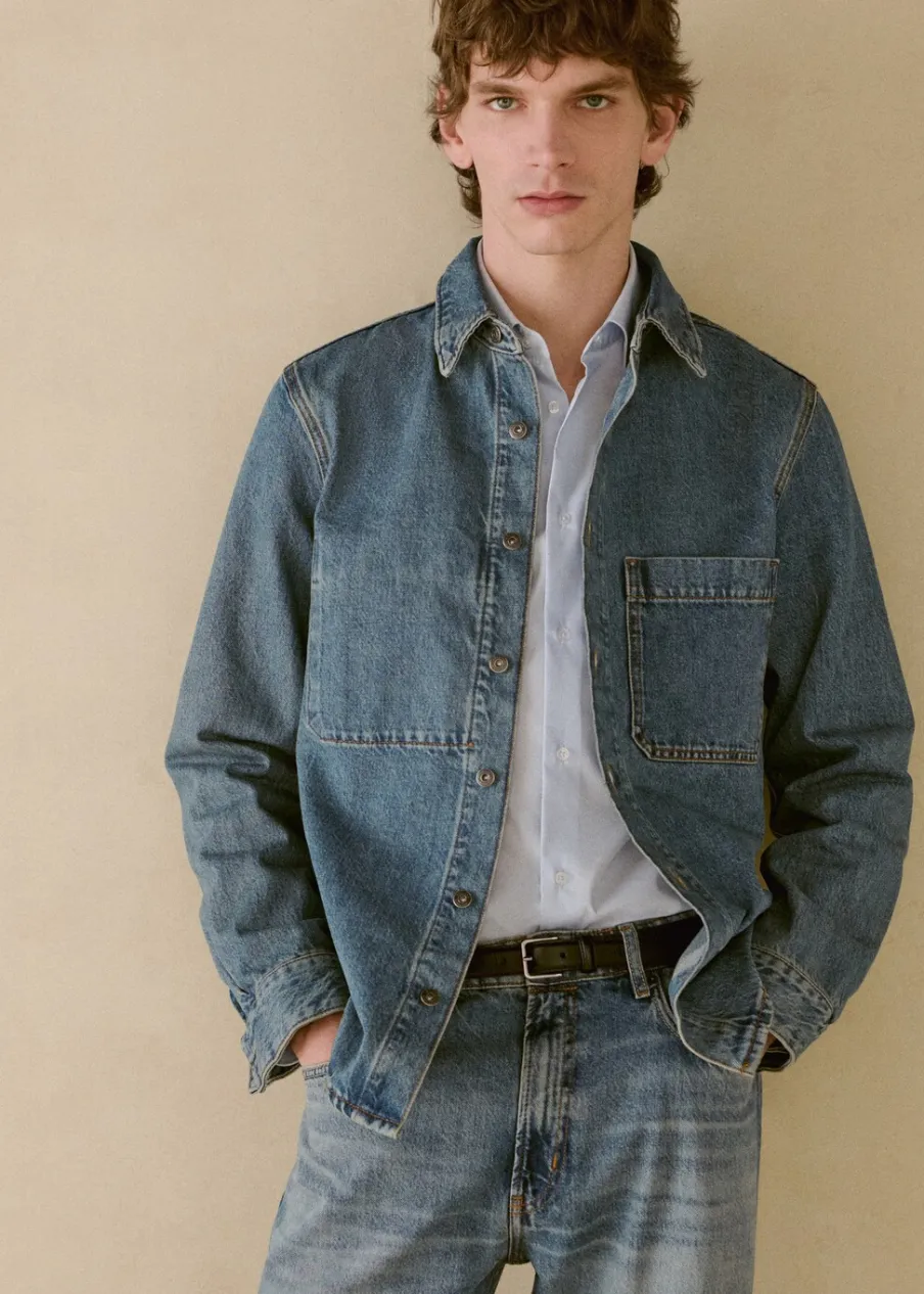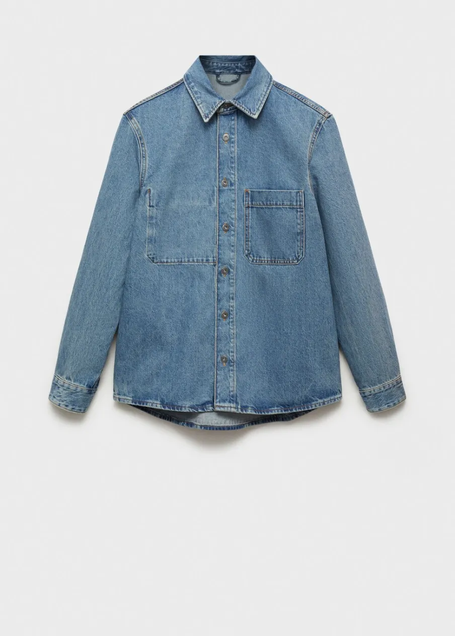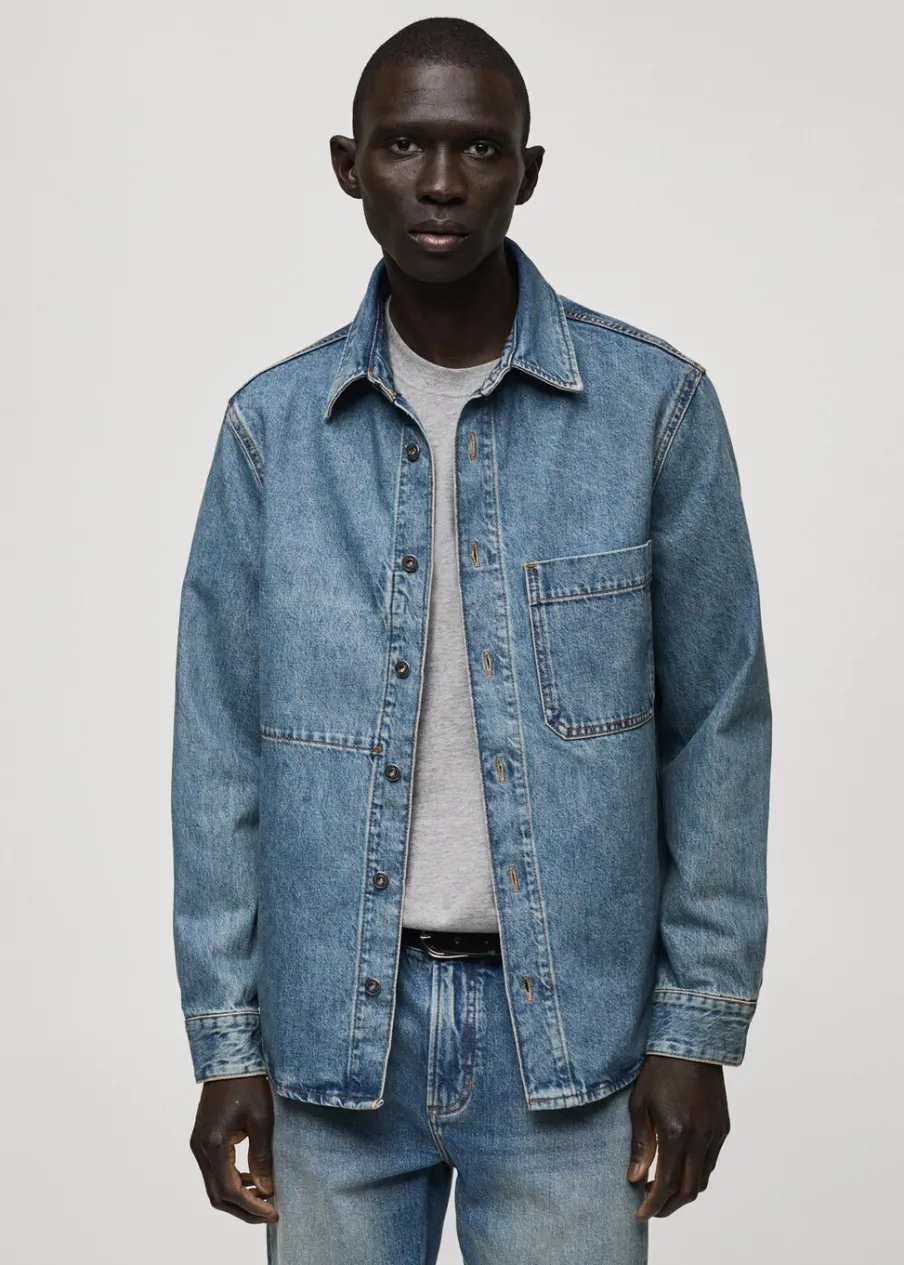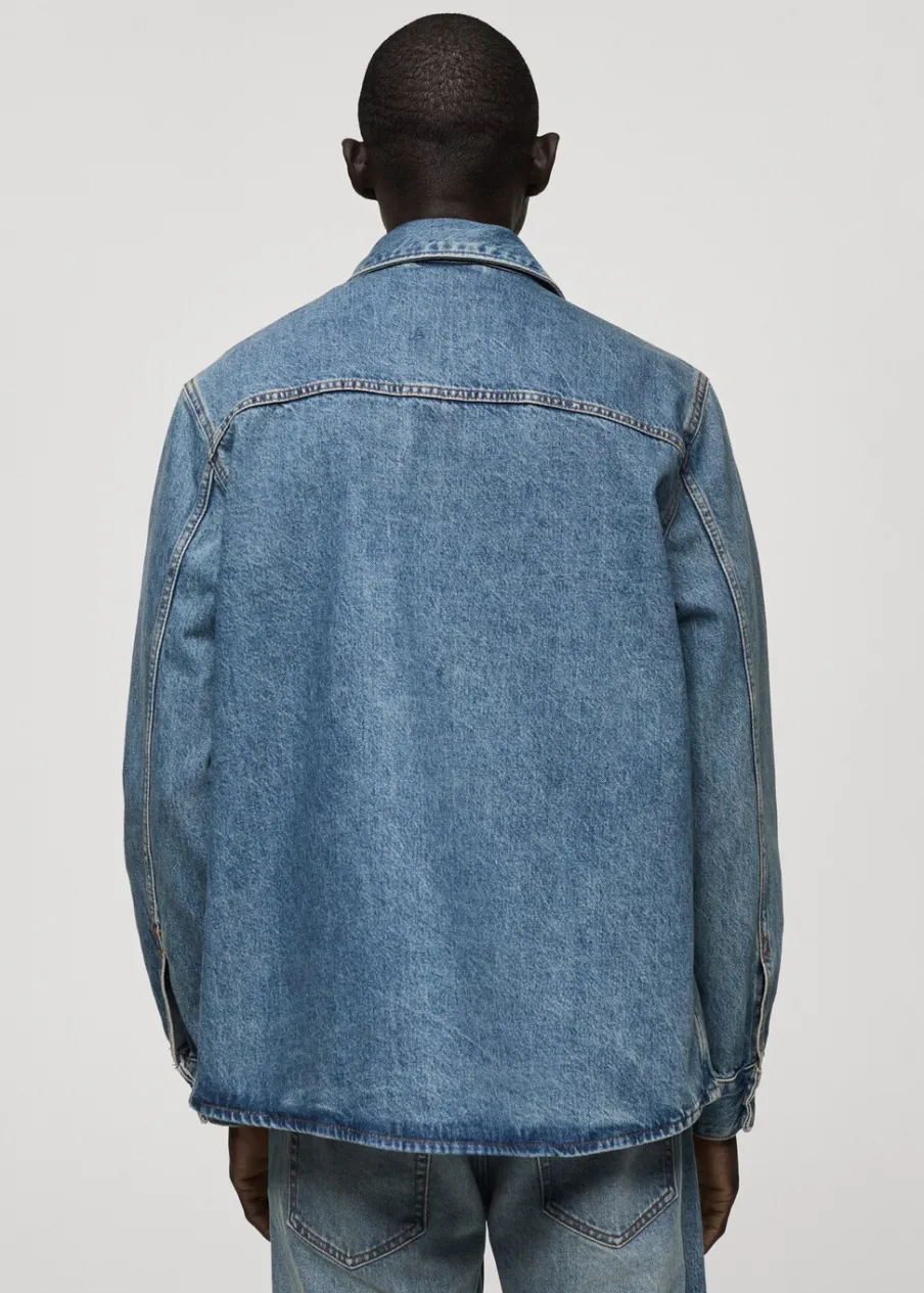 Krój regular. Tkanina dżinsowa. Wytarty efekt. Koszulowy kołnierz. Zapięcie na metalowe guziki z przodu. Długi rękaw z guzikami na mankietach. Kieszeń nakładana na piersi. Zaokrąglony dół. Model ma 190 cm wzrostu i nosi rozmiar M.