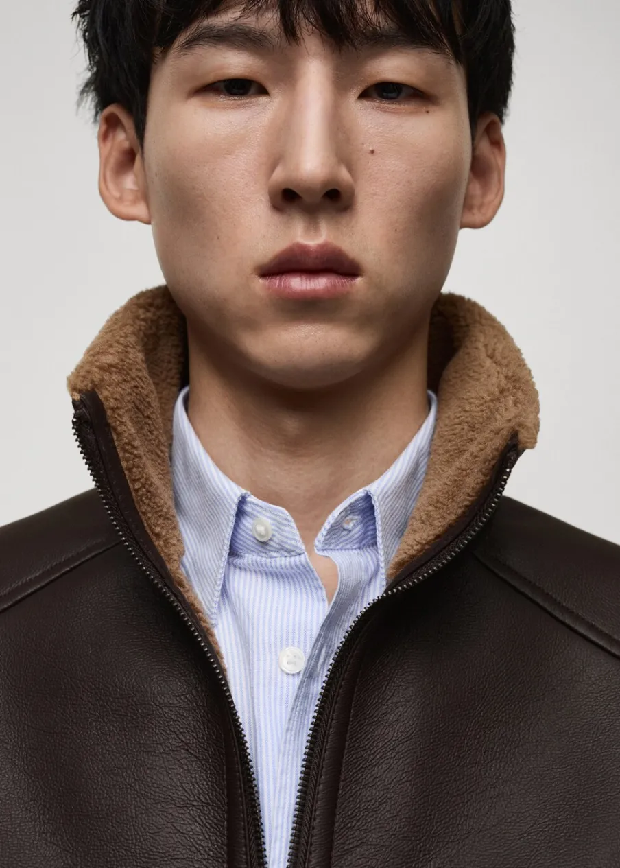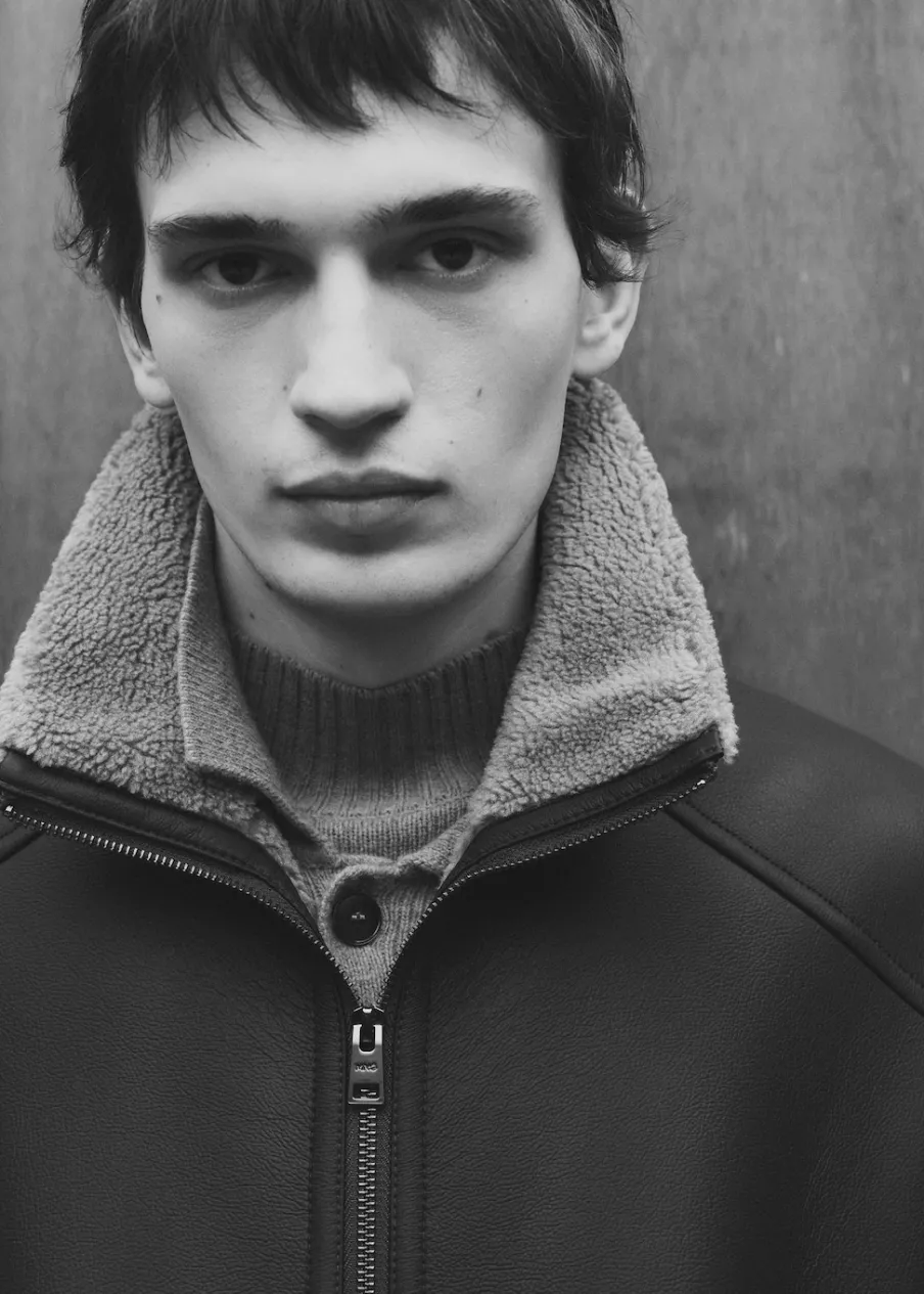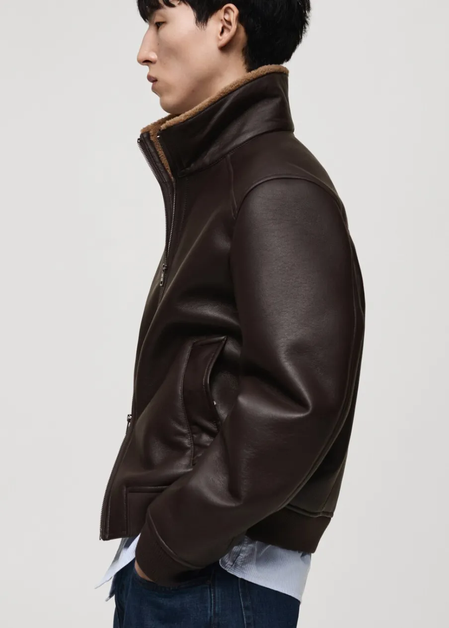 Kominowy kołnierz. Zapięcie na suwak. Dwie kieszenie boczne. Mankiety i dół wykończone kontrastowym ściągaczem. Model ma 185 cm wzrostu i nosi rozmiar M. Wyłącznie online. Efekt skóry. Futrzana podszewka z baranka.
