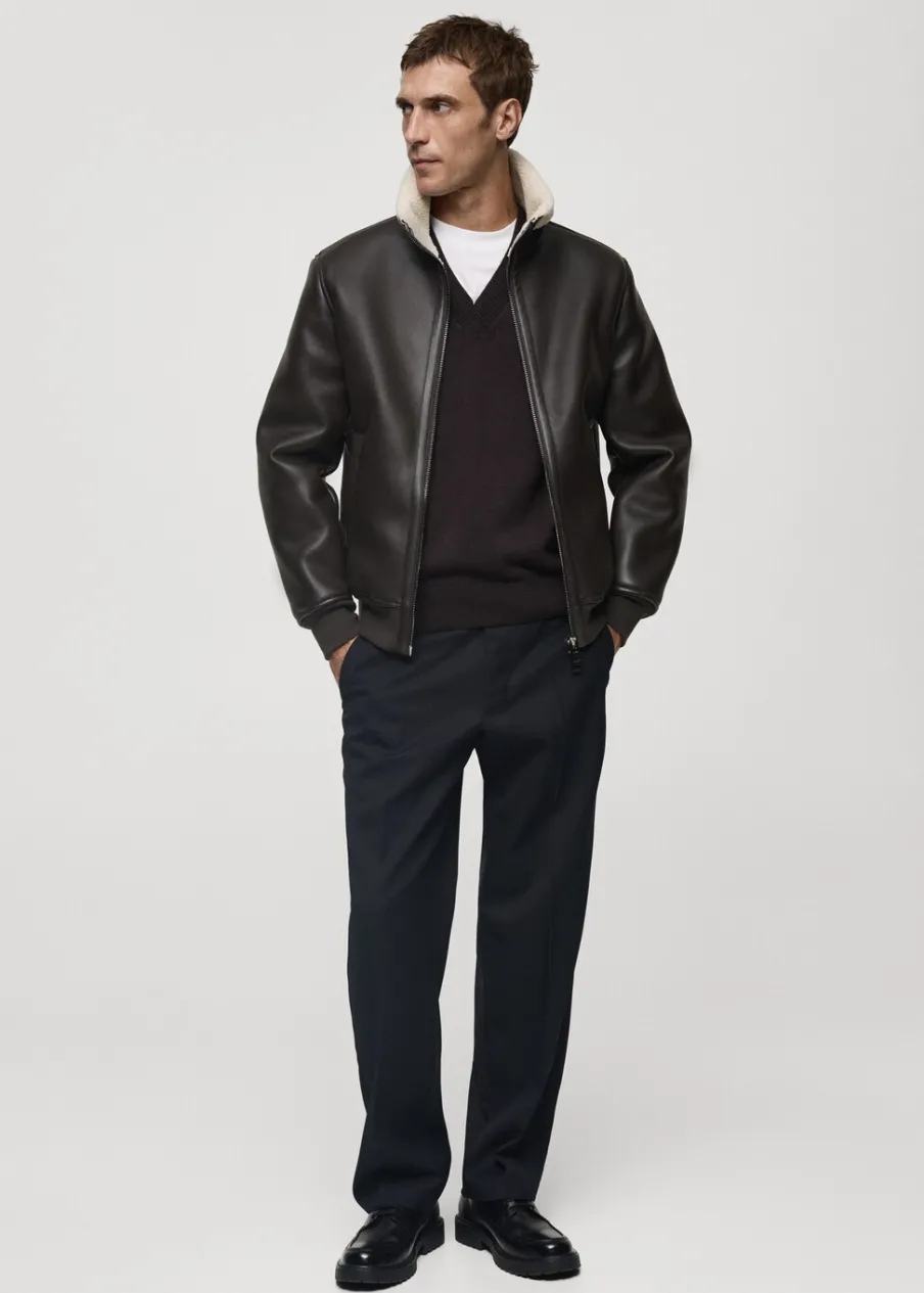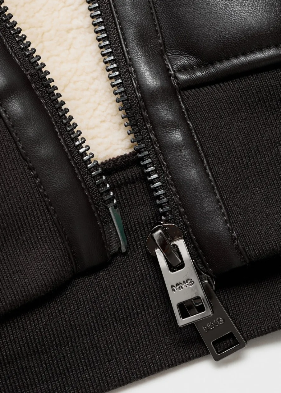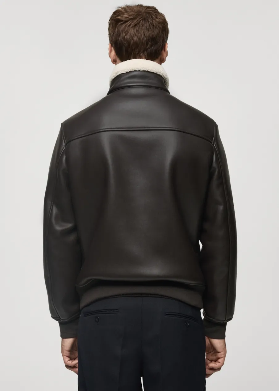 Kominowy kołnierz. Model ma 185 cm wzrostu i nosi rozmiar 50. Efekt skóry. Dwie boczne kieszenie z lamówką i zapięciem na zatrzask. Zapięcie na suwak. Podszewka z baranka. Elastyczne ściągacze.