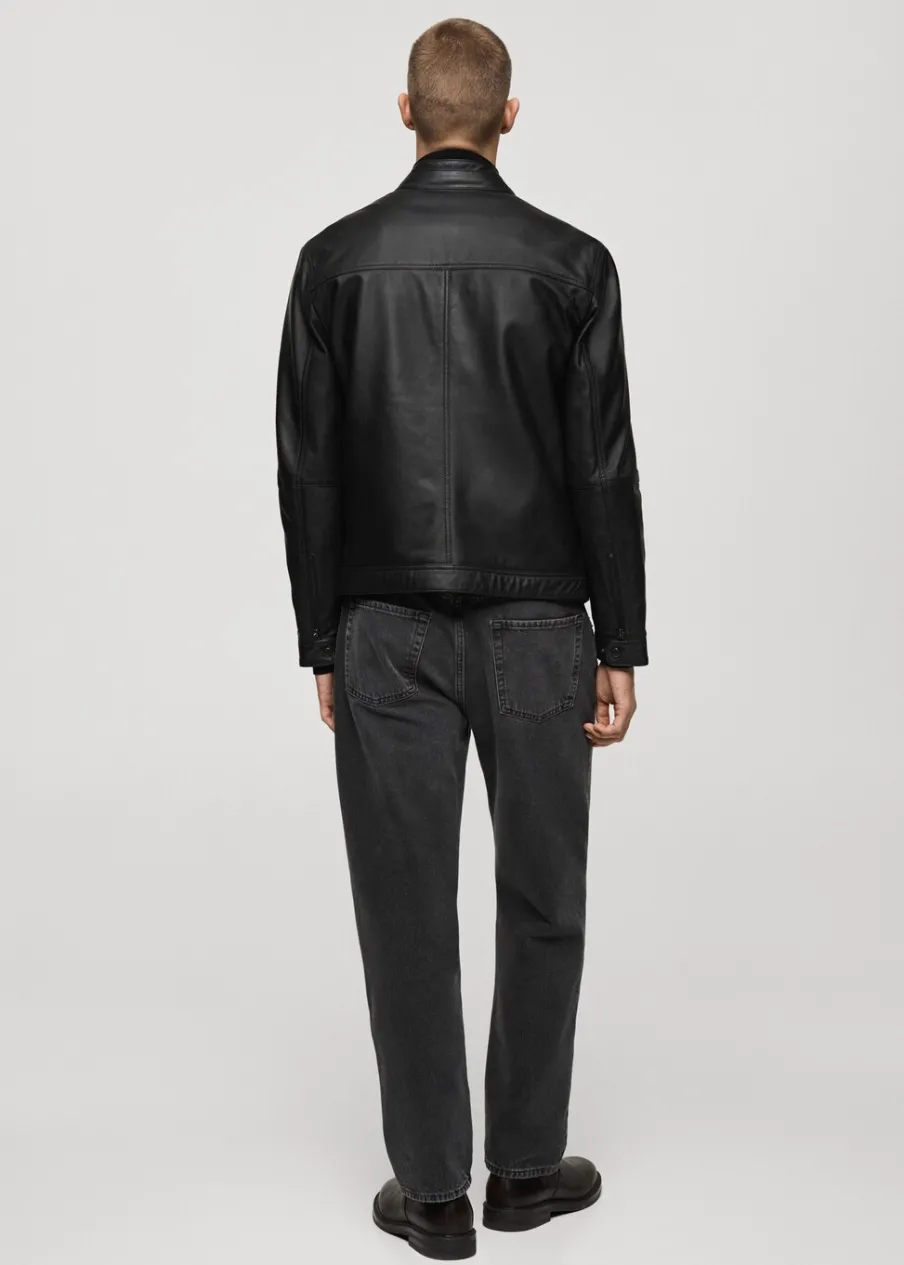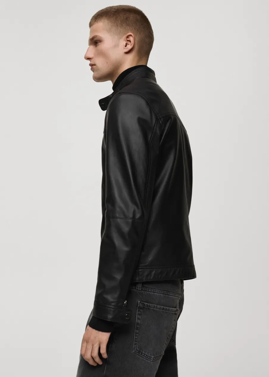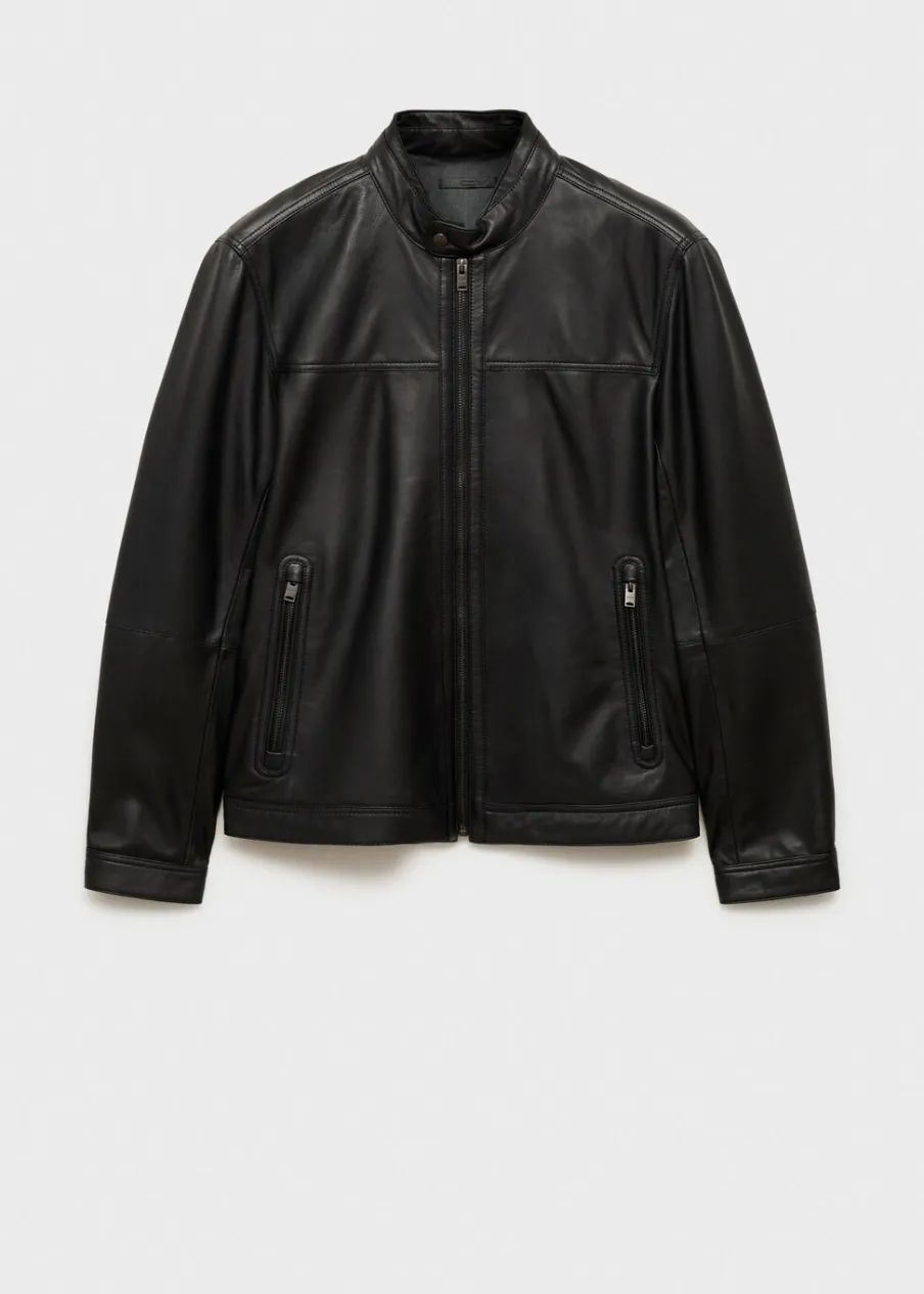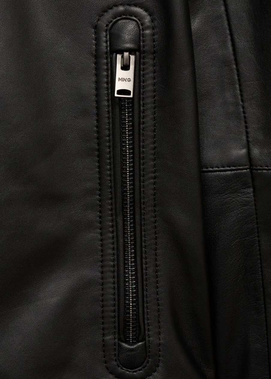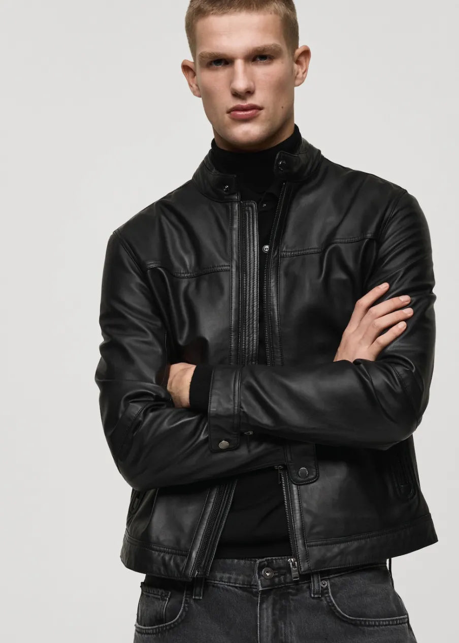 100% skóra nappa. Model biker. Krótki krój. Pikowane wstawki na ramionach. Okrągły dekolt z zapięciem na guzik. Zasuwane kieszenie z przodu. Długi rękaw z suwakiem. Kryte zapięcie z przodu na suwak. Wewnętrzna podszewka. Wewnętrzna kieszeń. Model ma 190 cm wzrostu i nosi rozmiar M.