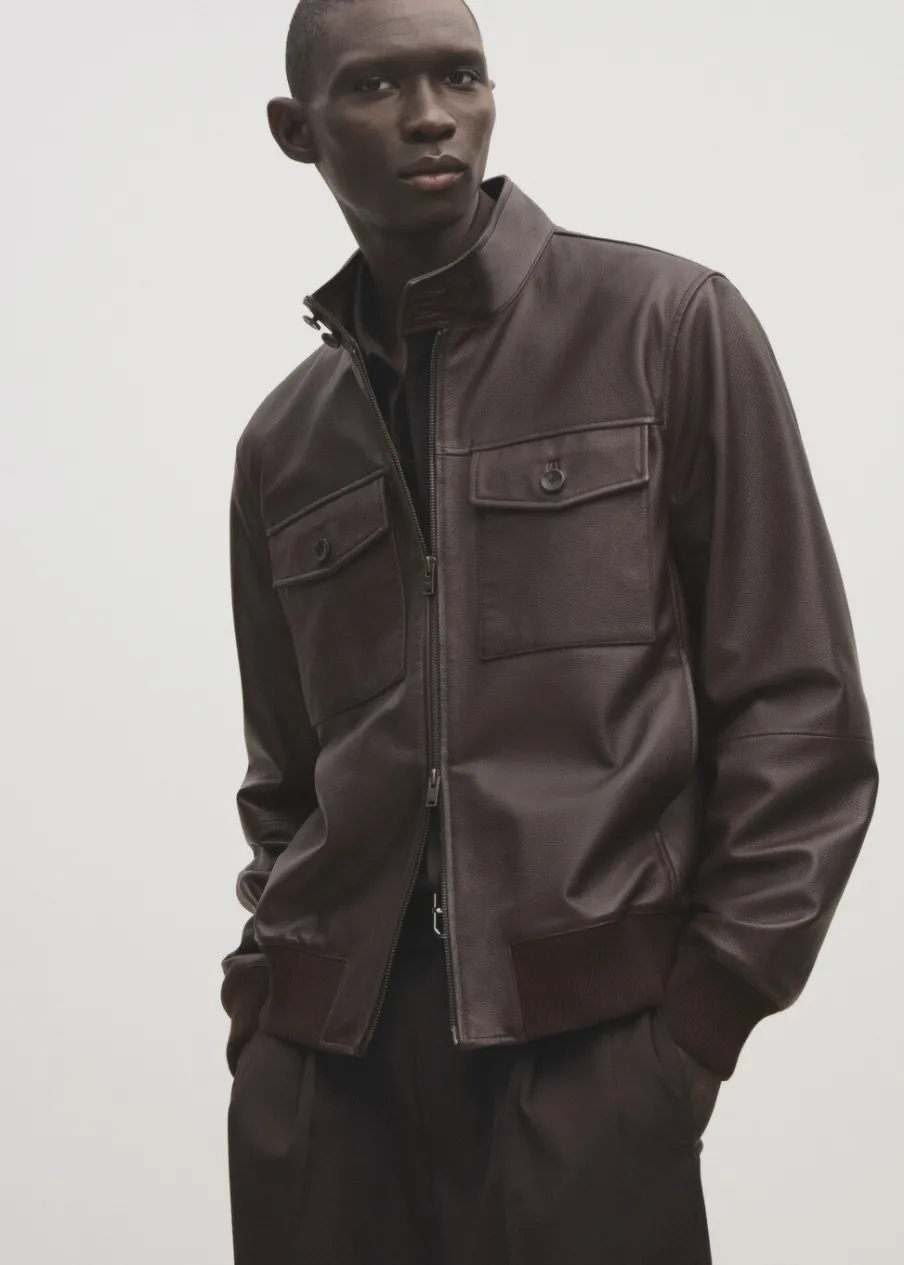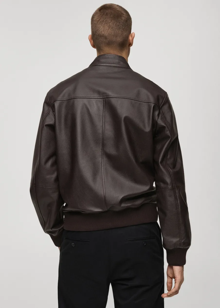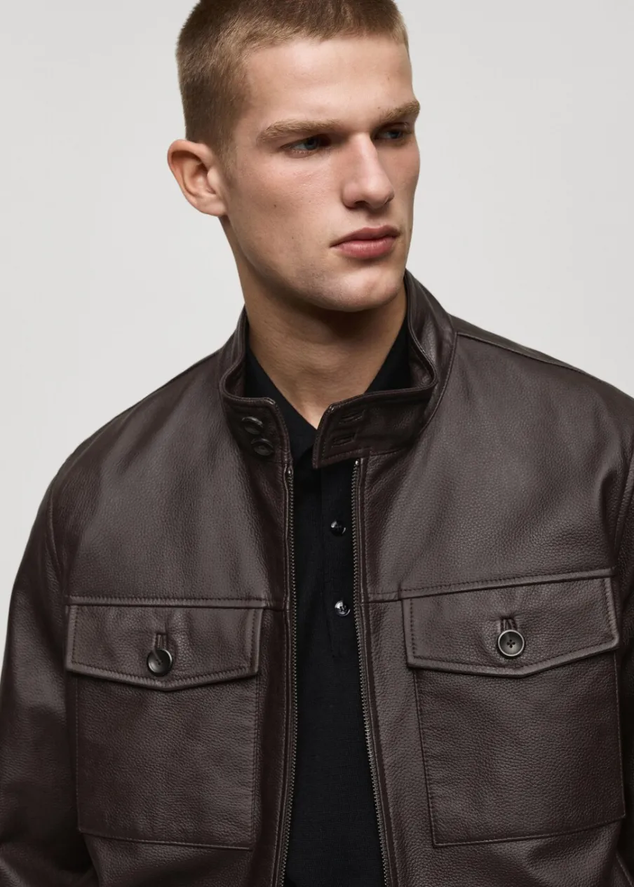 Skóra owcza 100%. Gnieciona skóra. Model biker. Krótki krój. Długi rękaw z guzikami na mankietach. Dwie kieszenie na zamek z boku. Zapięcie na suwak. Wewnętrzna podszewka. Wewnętrzna kieszeń. Model ma 190 cm wzrostu i nosi rozmiar M.