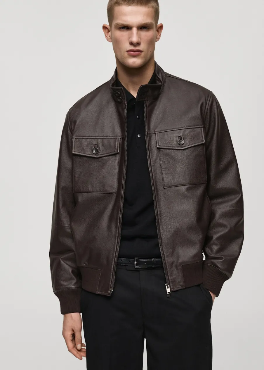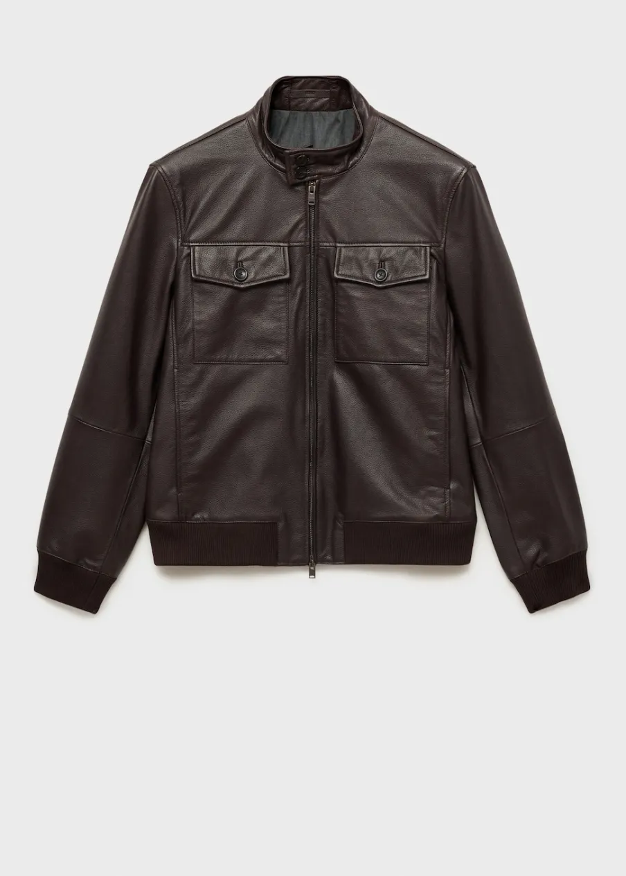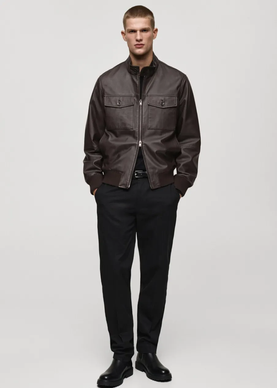 Skóra owcza 100%. Gnieciona skóra. Model biker. Krótki krój. Długi rękaw z guzikami na mankietach. Dwie kieszenie na zamek z boku. Zapięcie na suwak. Wewnętrzna podszewka. Wewnętrzna kieszeń. Model ma 190 cm wzrostu i nosi rozmiar M.