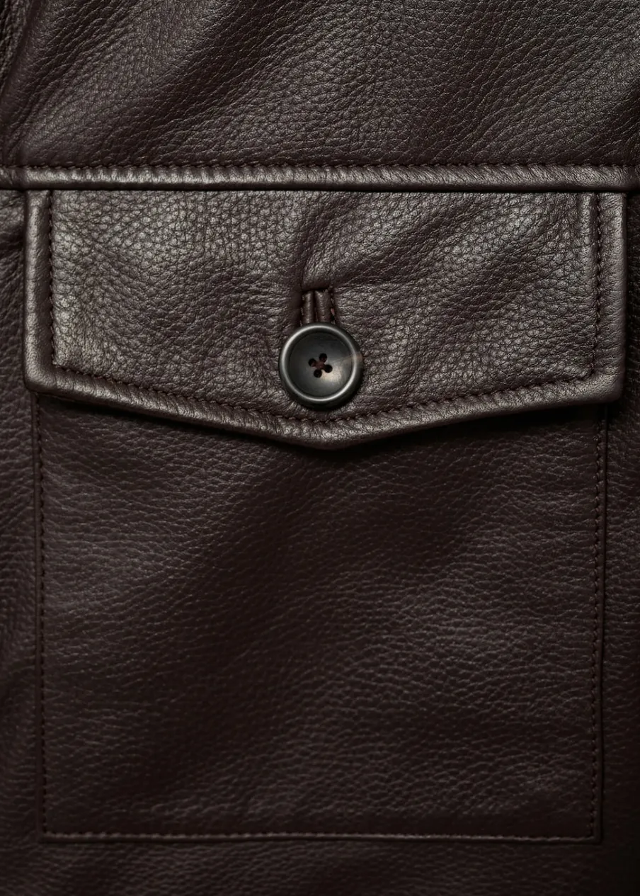 OpisSkóra owcza 100%. Gnieciona skóra. Model biker. Krótki krój. Długi rękaw z guzikami na mankietach. Dwie kiesze…