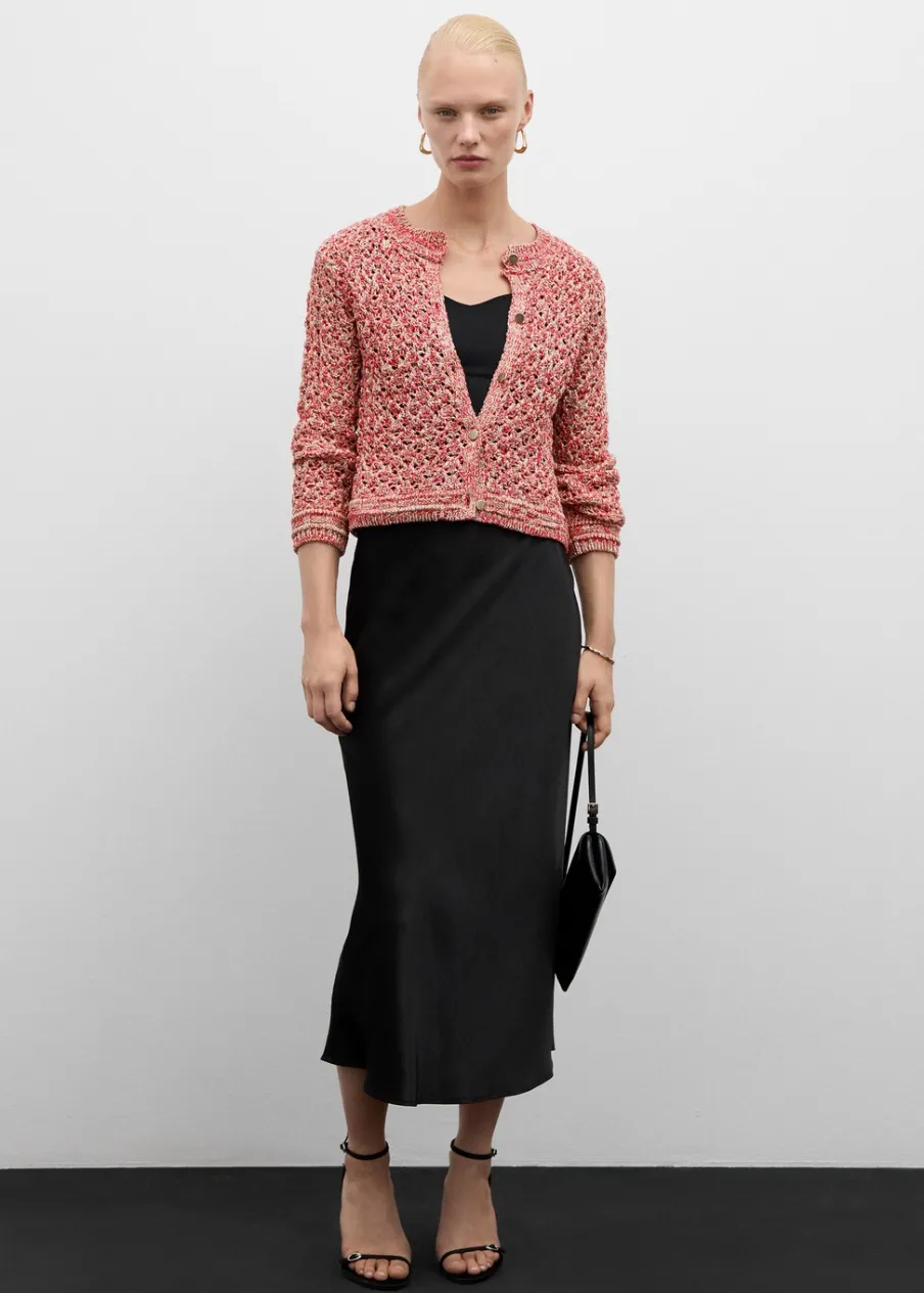 Dzianina średniej grubości. Tkanina mieszanka bawełny. Tkanina lureks. Model prosty. Deseń melanżowy. Okrągły dekolt. Długi rękaw. Zapięcie z przodu na guziki. Ściągaczowe wykończenia. Ażurowe detale.