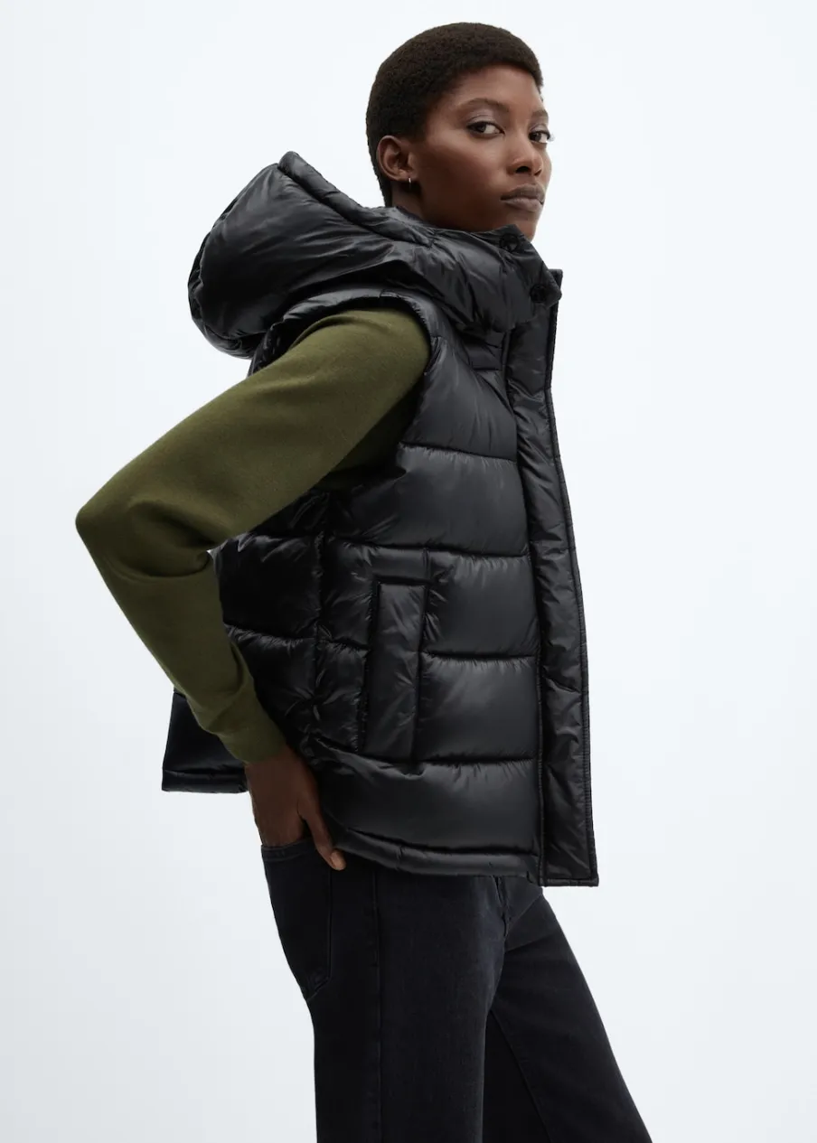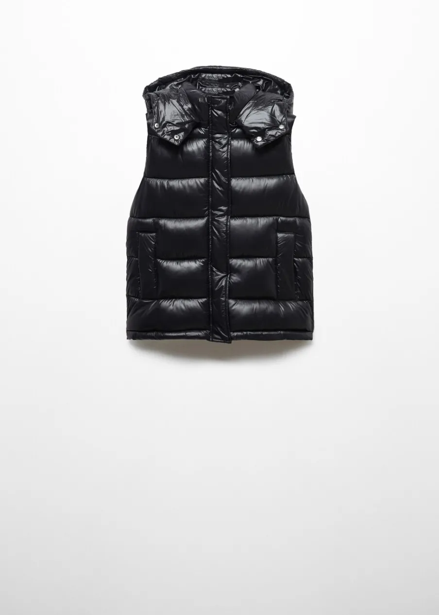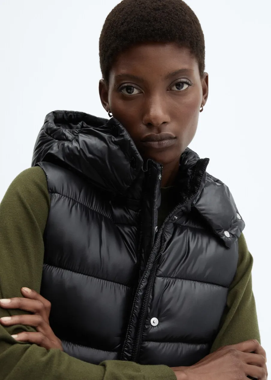 Nylonowa tkanina. Wypełnienie z 100% poliestru z recyklingu. Model pikowany. Model prosty. Krótki krój. Golf. Odpinany kaptur. Bez rękawów. Zapięcie na zamek i zatrzaski z przodu. Dwie kieszenie boczne. Wewnętrzna podszewka. Water Repellent: trwałe wykończenie tego modelu chroni przed lekkim deszczem, odpycha cząsteczki wody i krople deszczu.