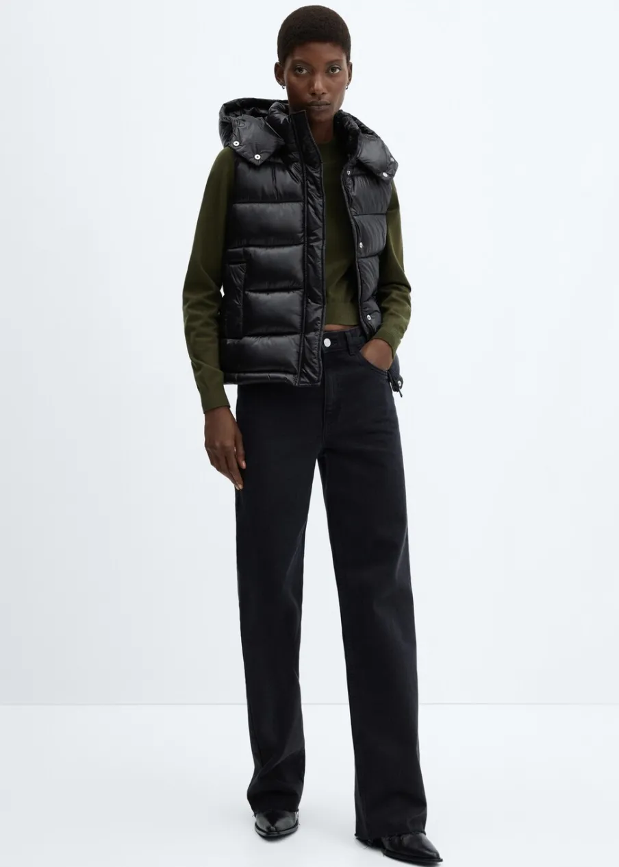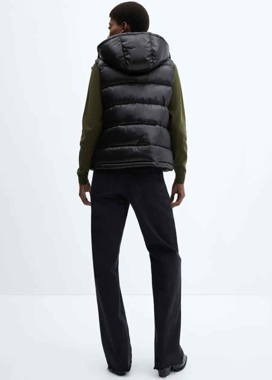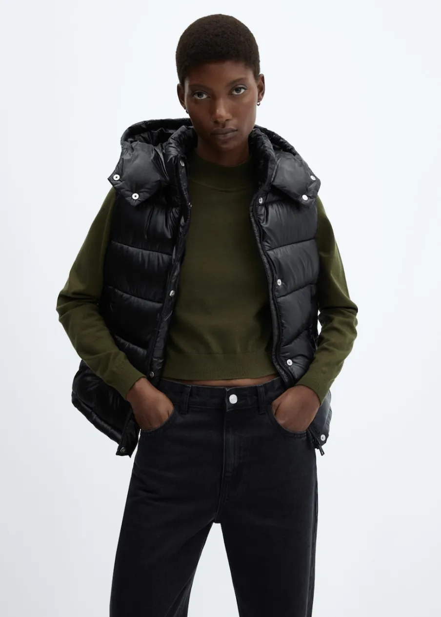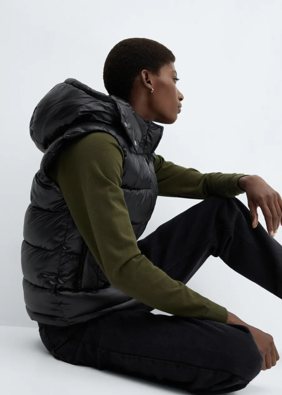 Nylonowa tkanina. Wypełnienie z 100% poliestru z recyklingu. Model pikowany. Model prosty. Krótki krój. Golf. Odpinany kaptur. Bez rękawów. Zapięcie na zamek i zatrzaski z przodu. Dwie kieszenie boczne. Wewnętrzna podszewka. Water Repellent: trwałe wykończenie tego modelu chroni przed lekkim deszczem, odpycha cząsteczki wody i krople deszczu.