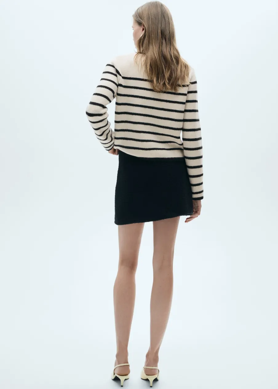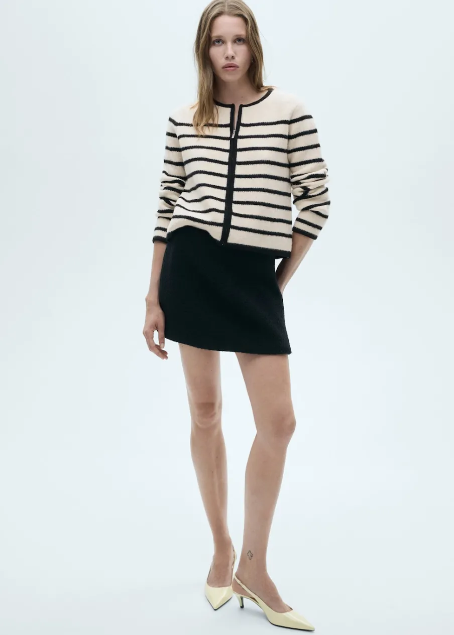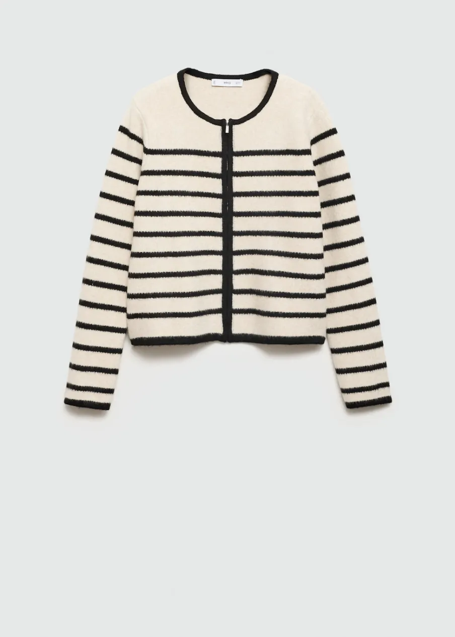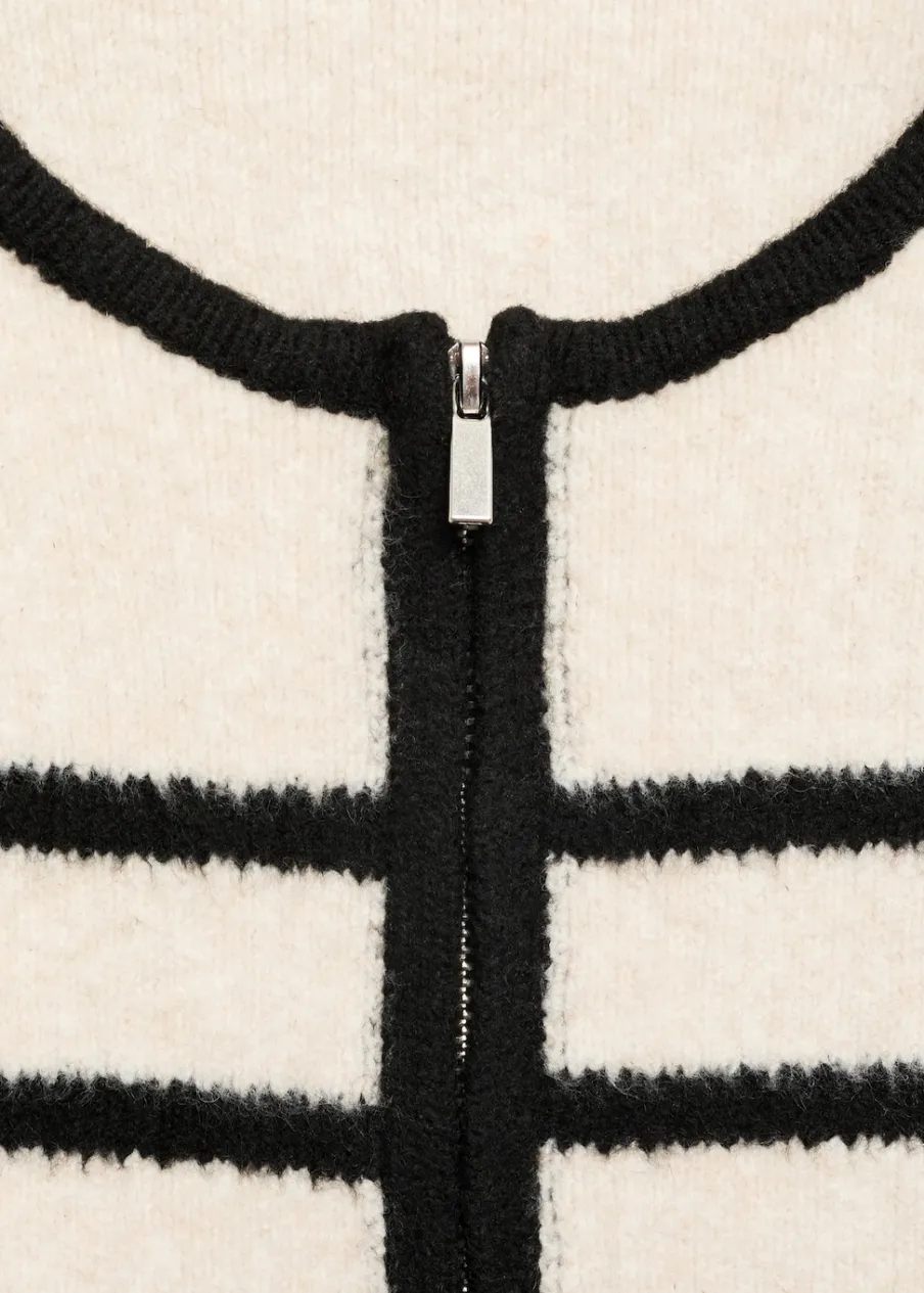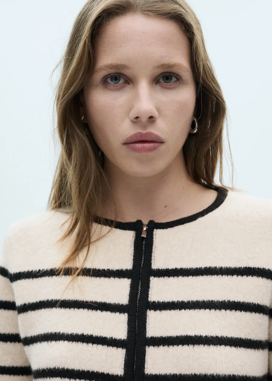 Dzianinowa tkanina. Model prosty. Okrągły dekolt. Długi rękaw. Zapięcie z przodu na suwak. Modelka ma 175 cm wzrostu i nosi rozmiar S/36. Wzór w paski.