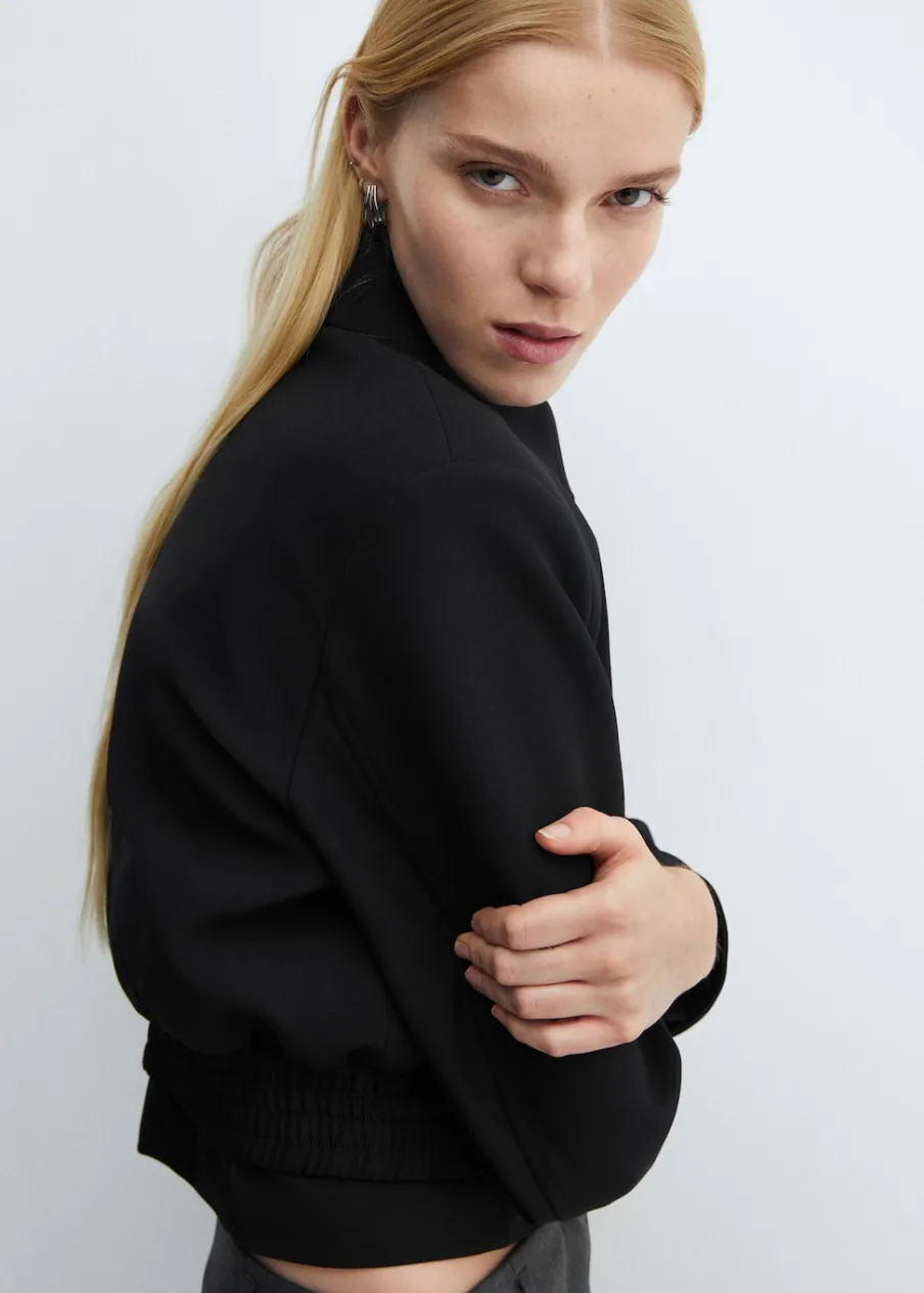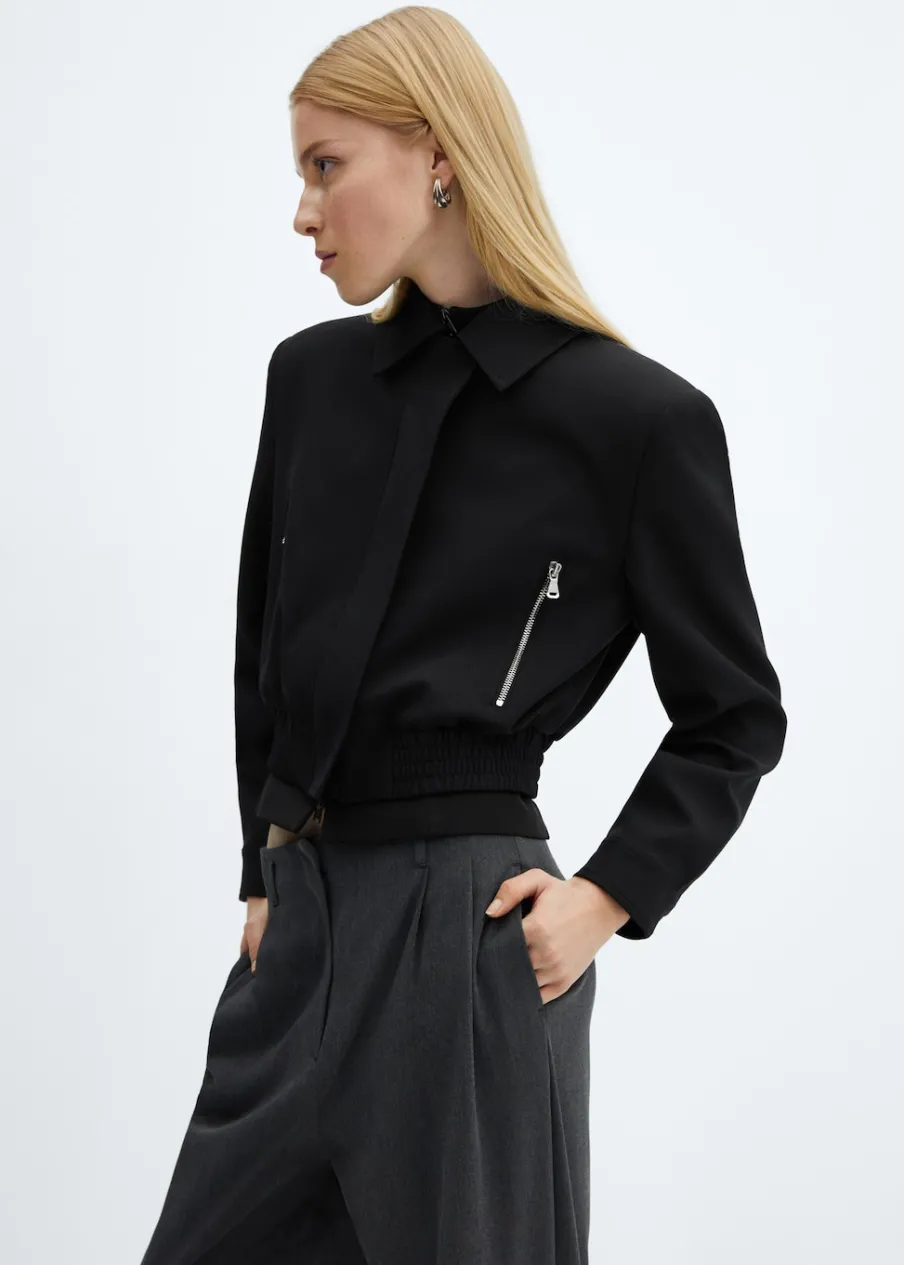 Model prosty. Krótki krój. Koszulowy kołnierz. Długi rękaw z guzikami na mankietach. Dwie kieszenie na zamek z boku. Kryte zapięcie z przodu na suwak. Elastyczna gumka u dołu. Wewnętrzna podszewka. Stylizacje biurowe.