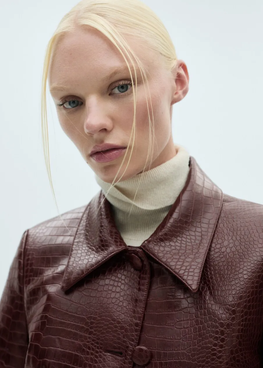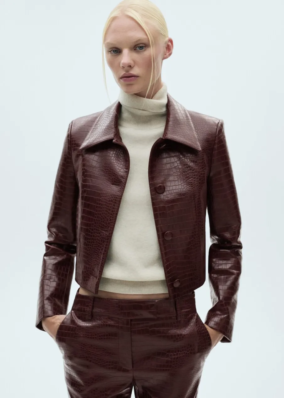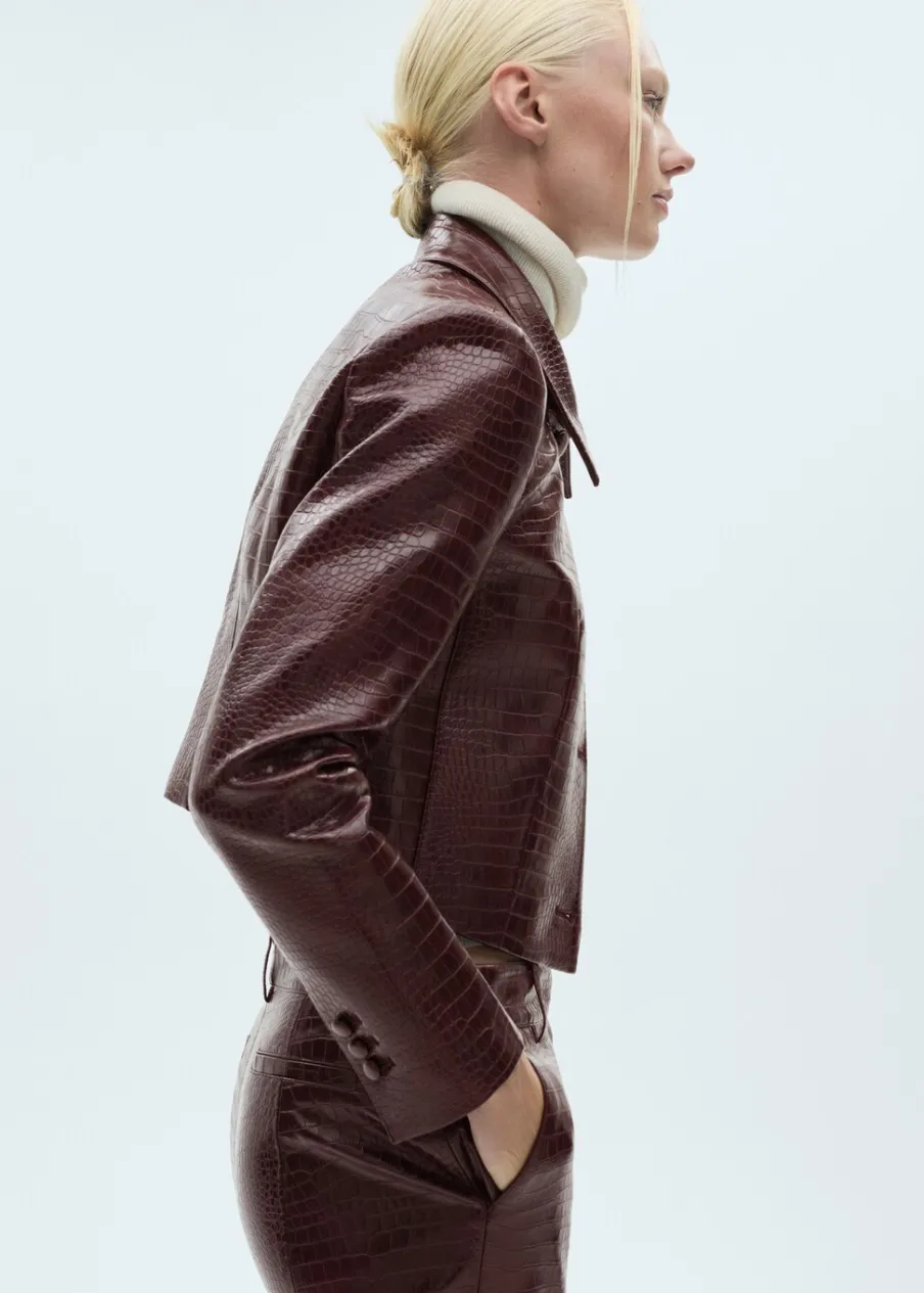 Efekt krokodylej skóry. Krótki krój. Model prosty. Koszulowy kołnierz. Długi rękaw. Zapięcie z przodu na guziki. Wewnętrzna podszewka. Total look. Modelka ma 178 cm wzrostu i nosi rozmiar S/36.