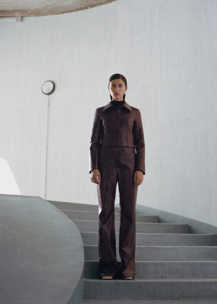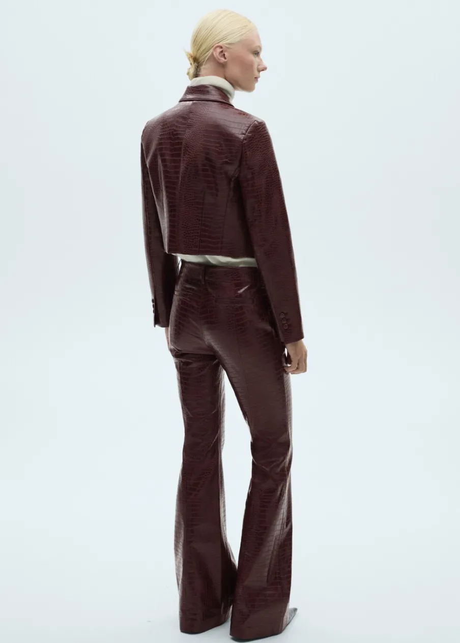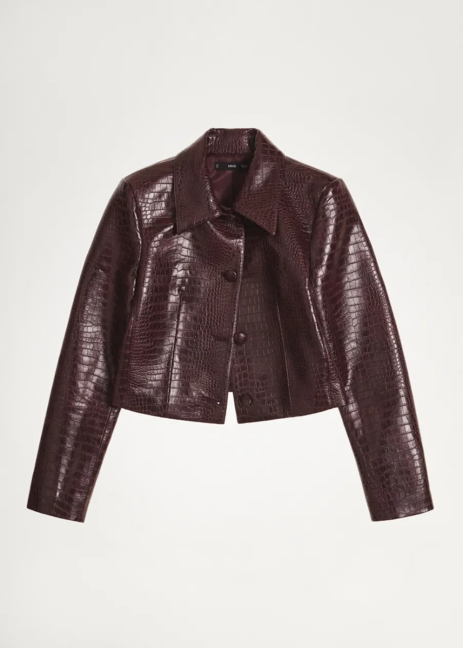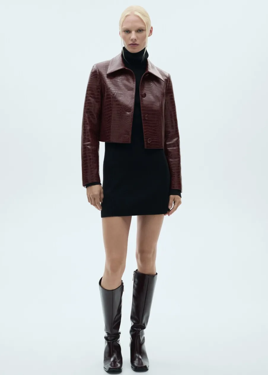 Efekt krokodylej skóry. Krótki krój. Model prosty. Koszulowy kołnierz. Długi rękaw. Zapięcie z przodu na guziki. Wewnętrzna podszewka. Total look. Modelka ma 178 cm wzrostu i nosi rozmiar S/36.