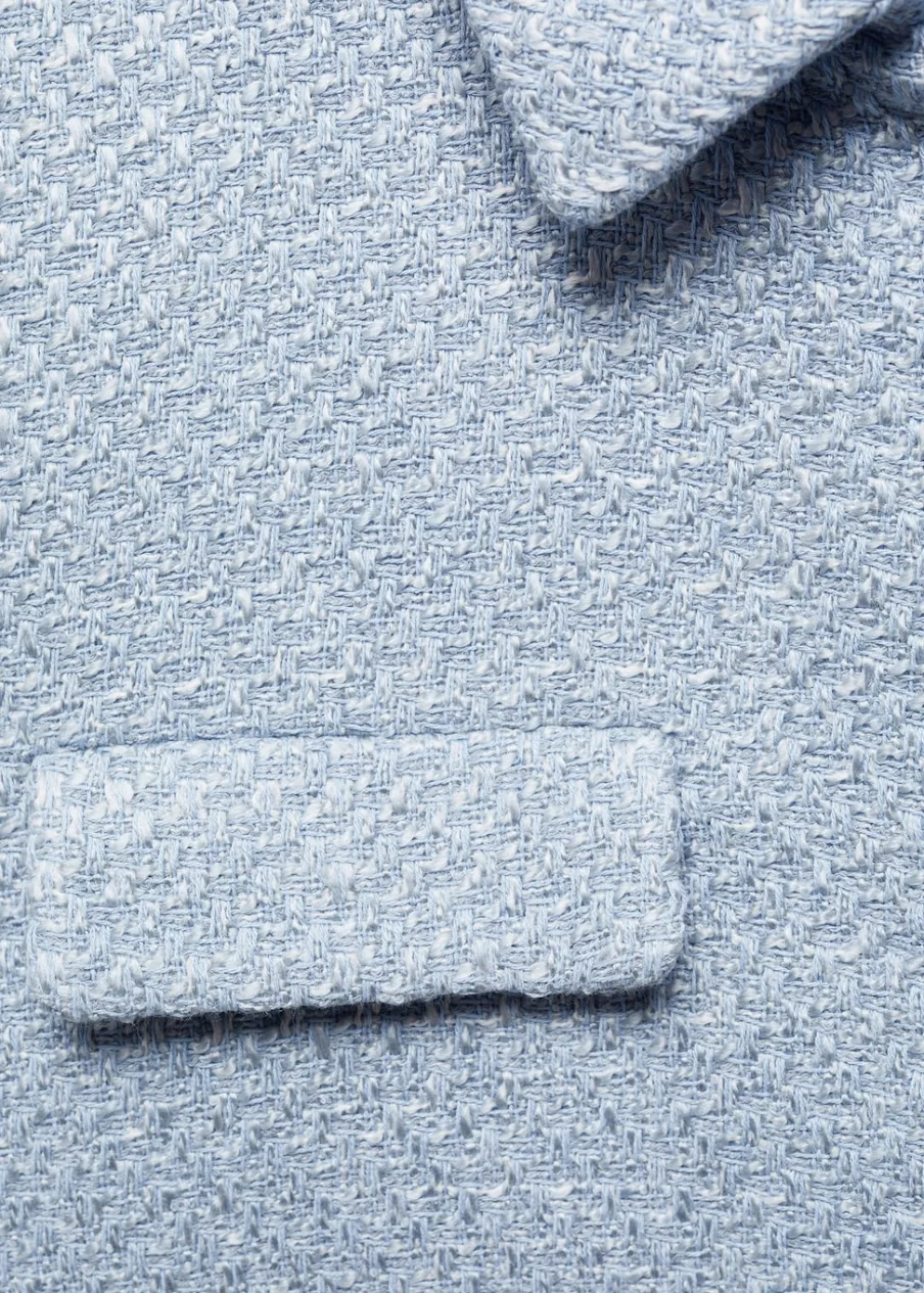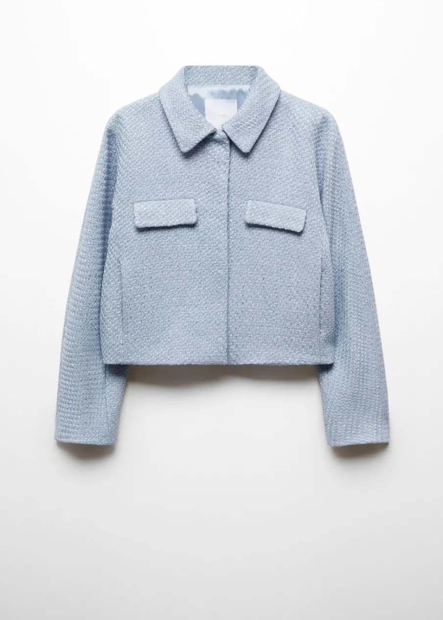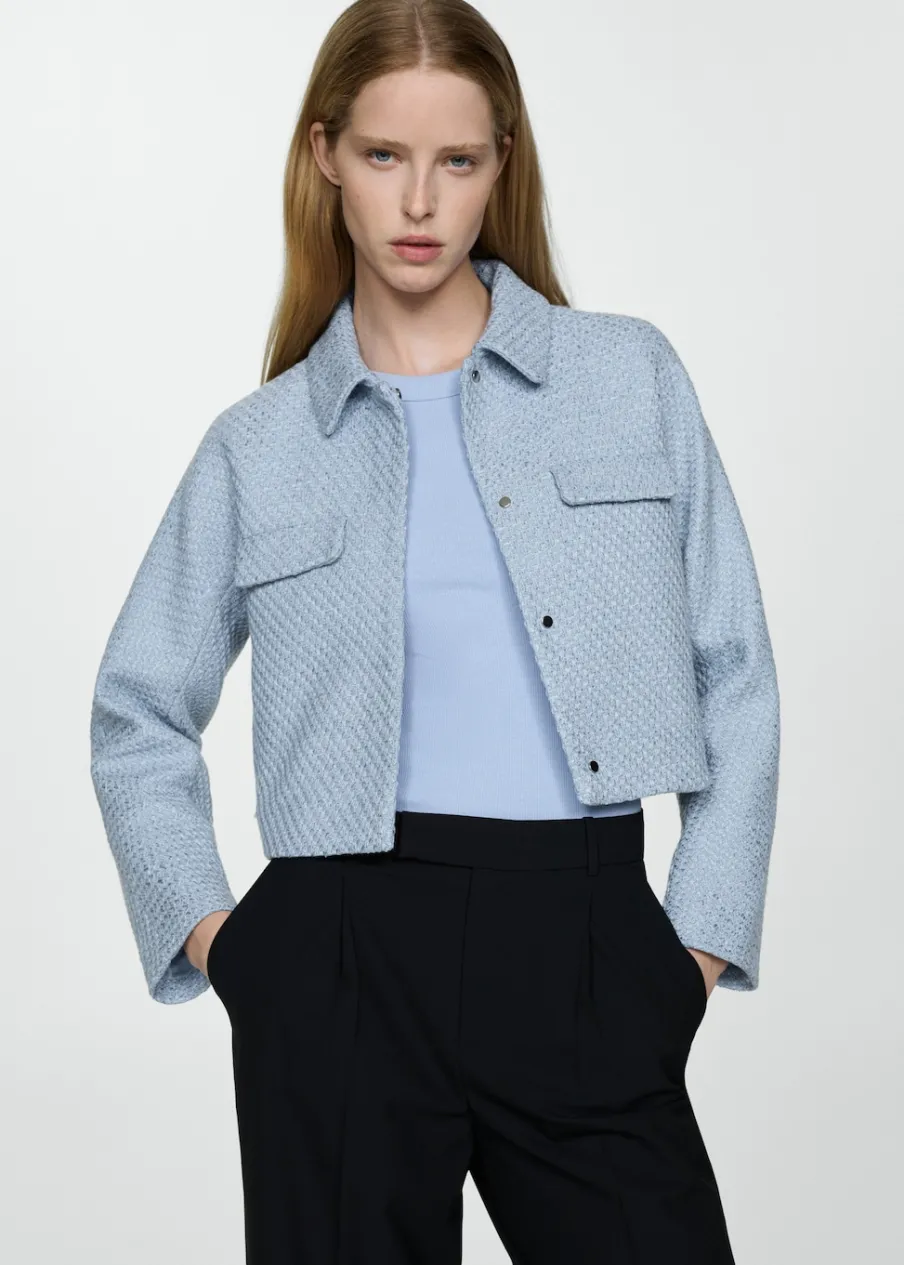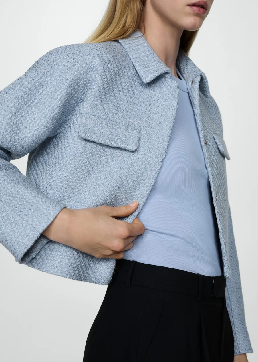 Tkanina tweedowa. Krótki krój. Model prosty. Koszulowy kołnierz. Długi rękaw. Kieszeń z patką z przodu. Zapięcie na zatrzaski z przodu. Wewnętrzna podszewka. Total look.