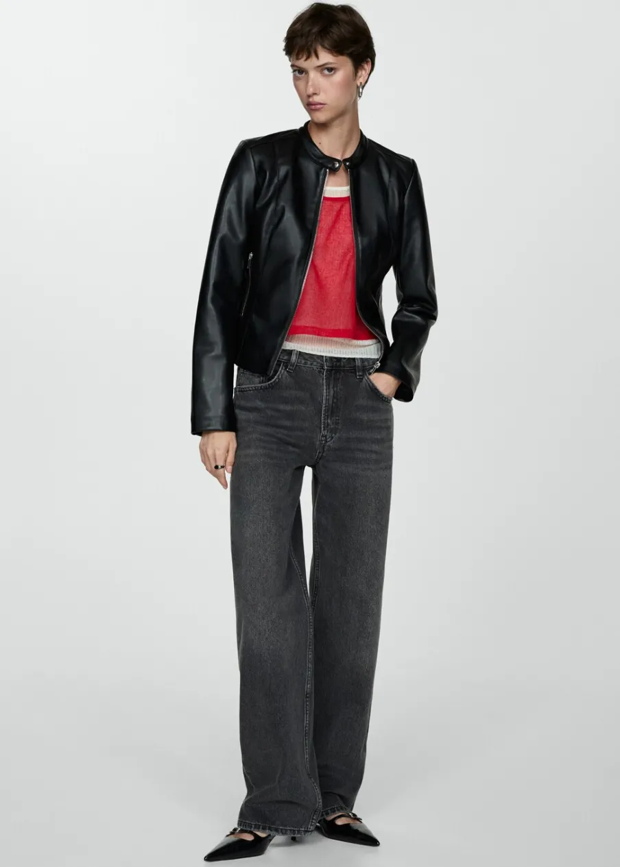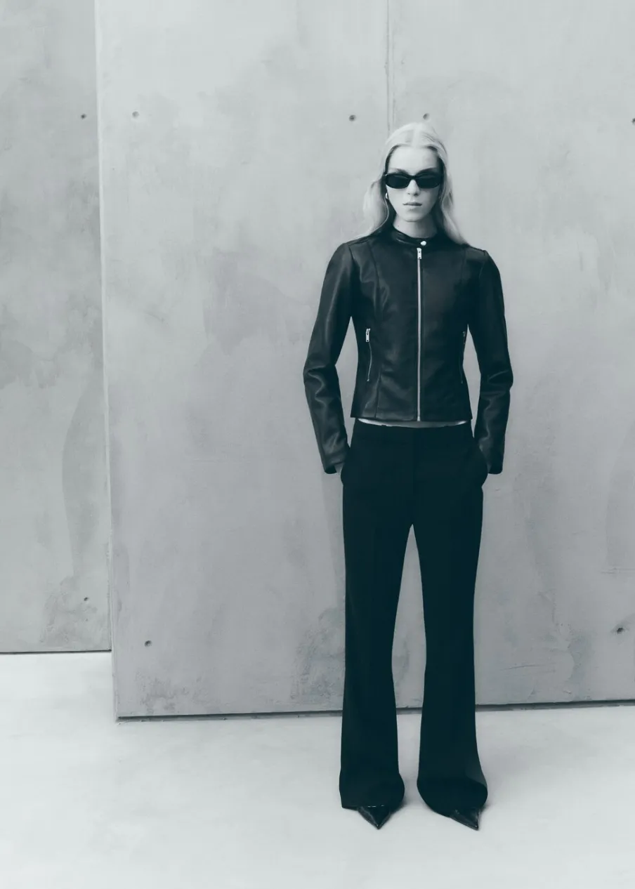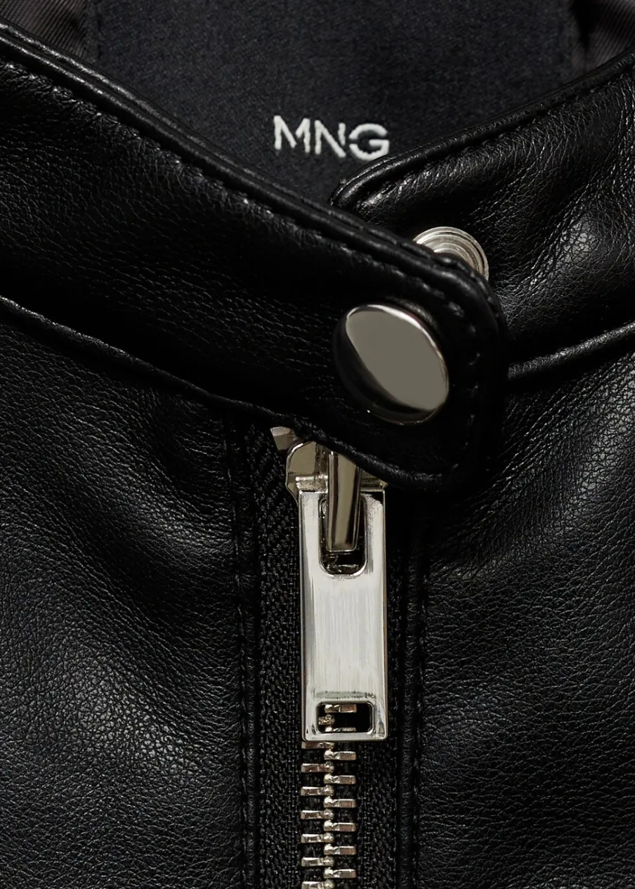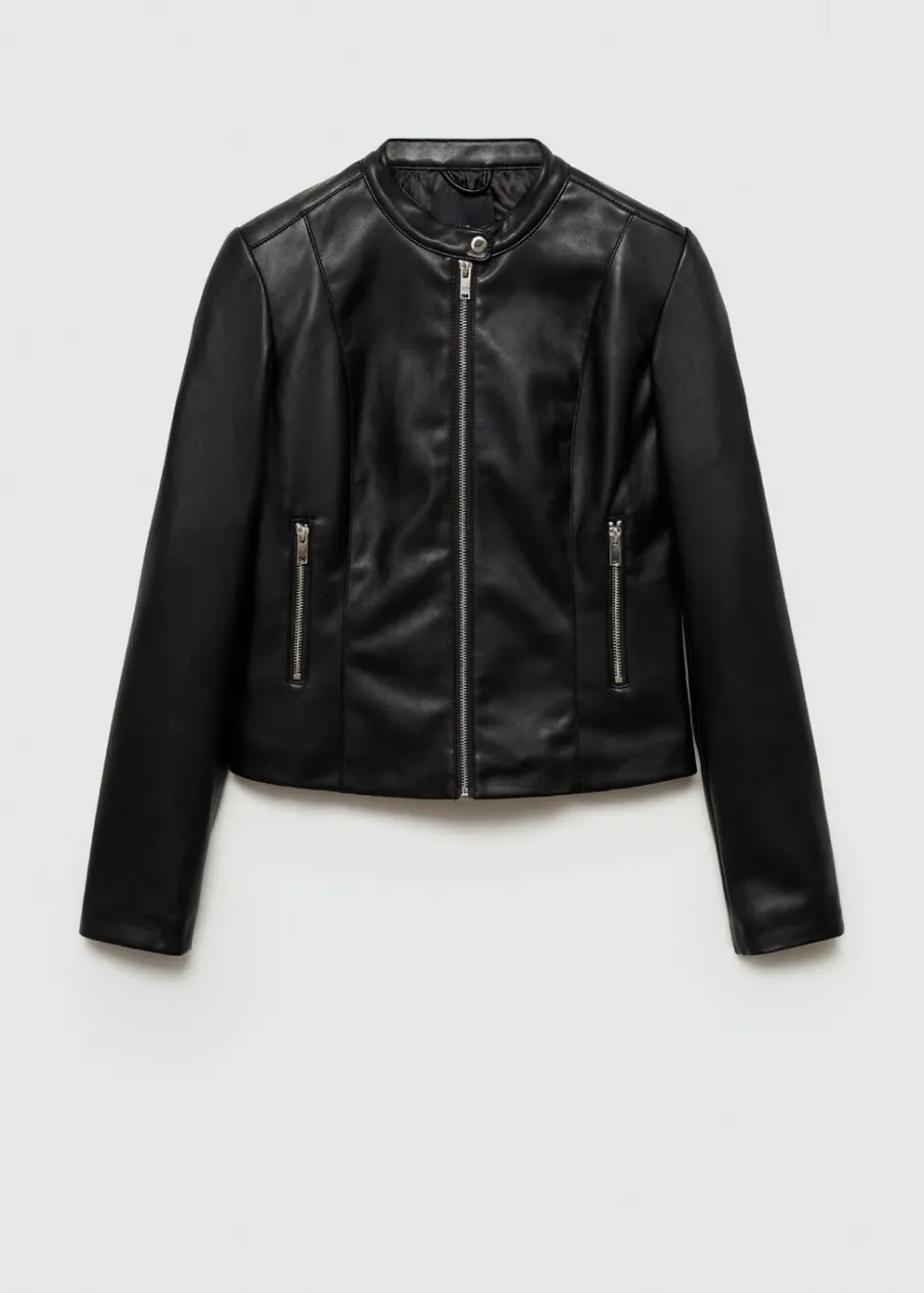 Okrągły dekolt. Model pikowany. Efekt skóry. Model biker. Slim-fit. Krótki krój. Zapięcie na zamek z przodu. Zapinany kołnierzyk. Kieszenie boczne zapinane na suwak. Długi rękaw.
