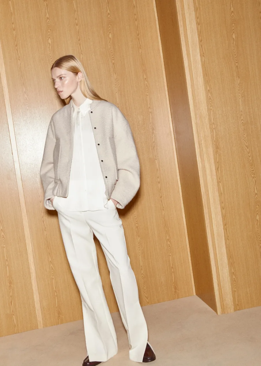 Miękka tkanina, model oversize, model bomber, kołnierzyk typu bomber, długi rękaw, zapięcie z przodu na zatrzaskowe guziki, dwie kieszenie nakładane z przodu, ozdobne szwy, wewnętrzna podszewka.