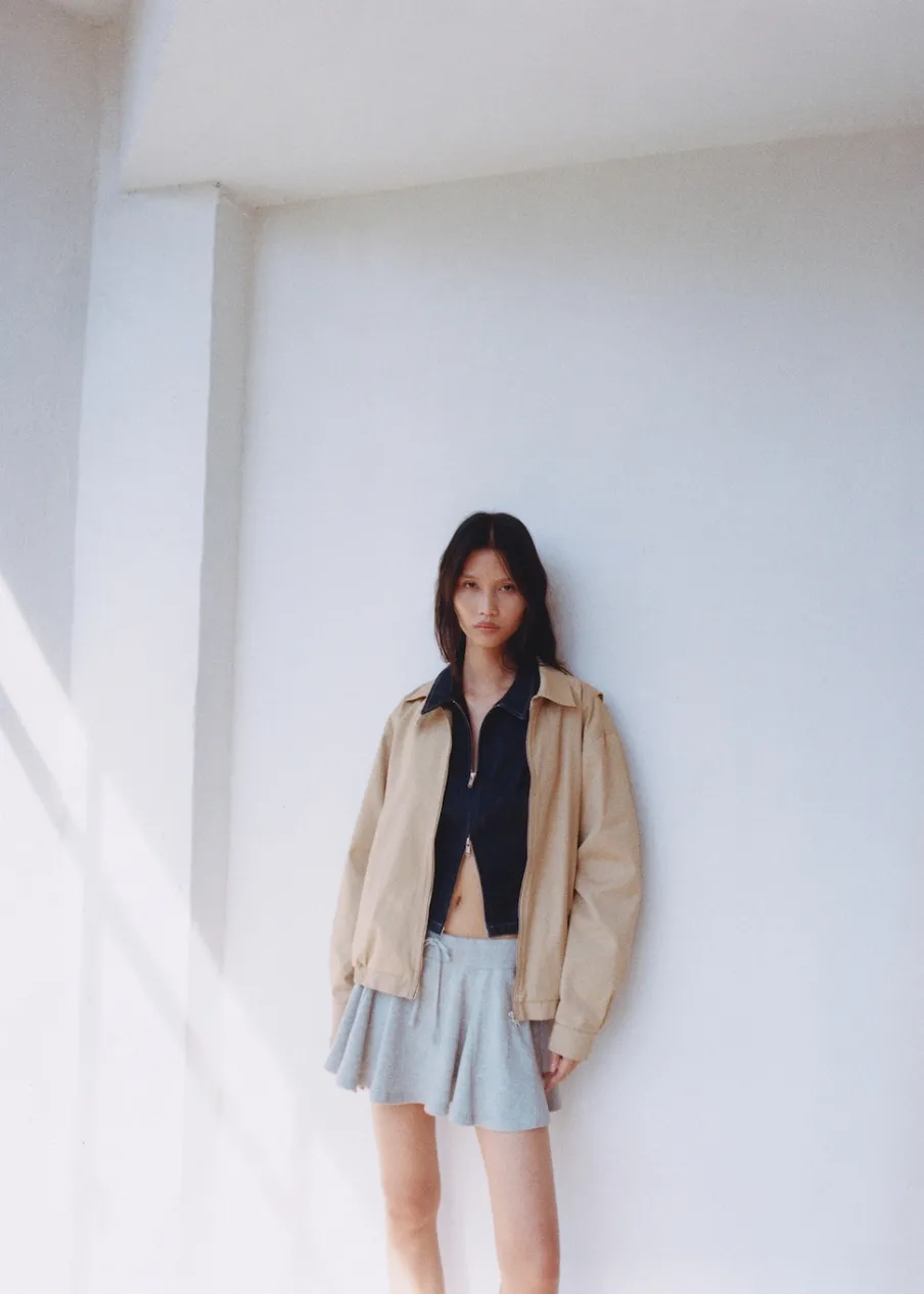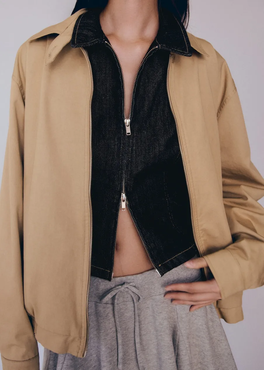 Tkanina bawełniana w dżinsowym stylu. Model oversize. Model bomber. Model długi. Koszulowy kołnierz. Długi rękaw z zapięciem na guziki. Zapięcie z przodu na suwak.